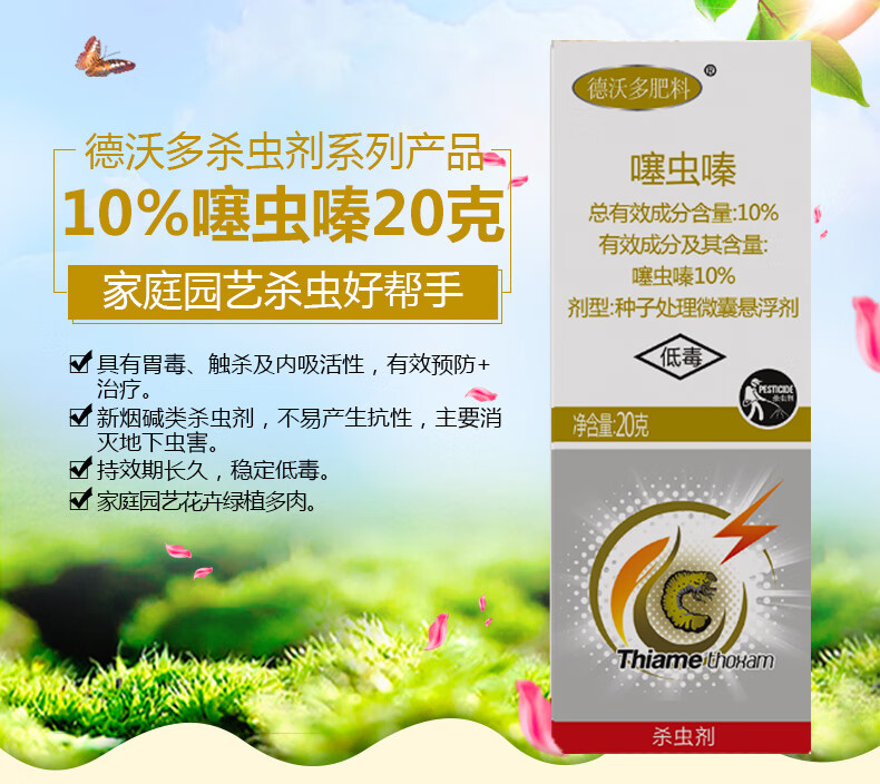药剂种类:杀虫剂;功效:杀虫;性状:液体;品牌:德沃多肥料;包装清单:德沃多噻虫嗪20g;