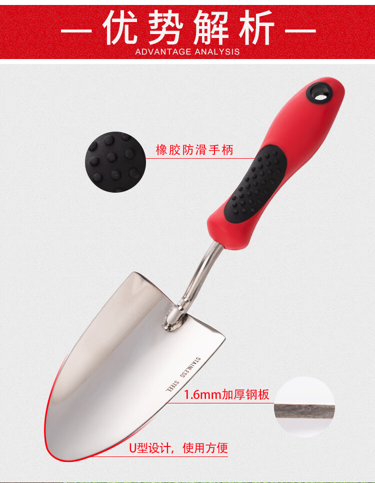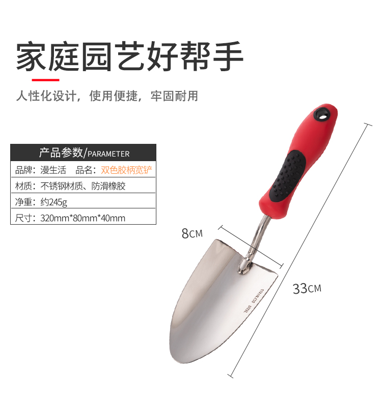 材质:不锈钢;分类:铲/耙/锹/锄;产地:国产;品牌:漫生活;包装清单:单把不锈钢园艺铲;