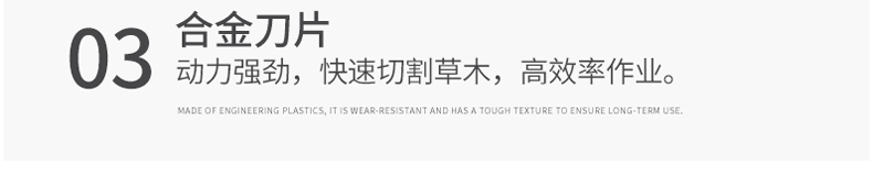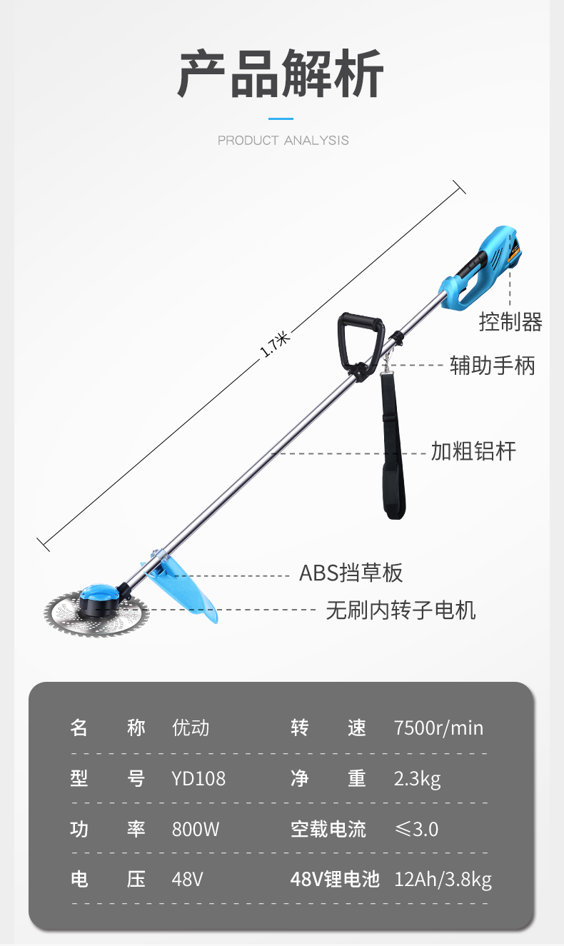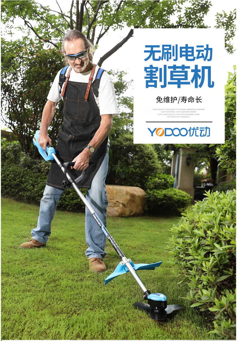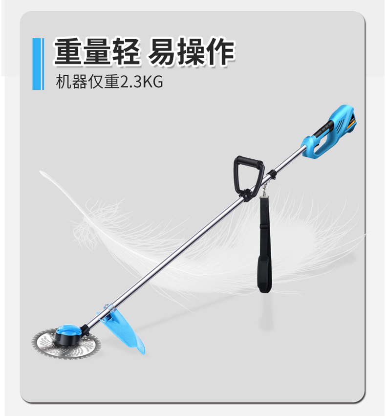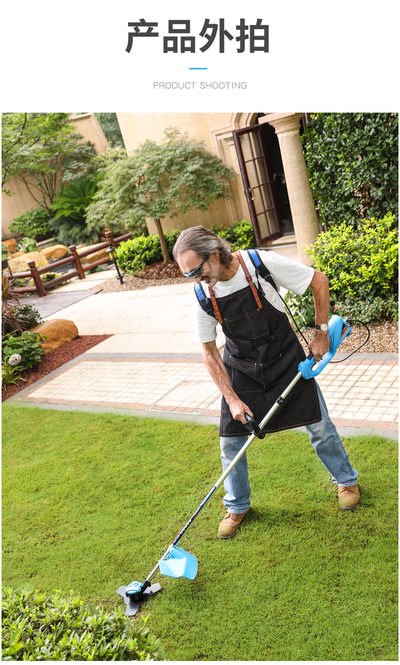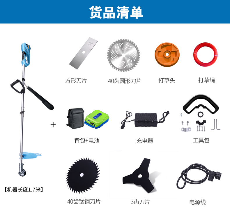 机械类型:草坪修剪机;动力类型:电动;适用对象:树木,草坪,路旁树篱;包装清单:割草机*1 电池套装*1 打草头*1 40齿合金刀片*1 40齿锰钢刀片*1 2齿刀片*1 3齿刀片*1;
