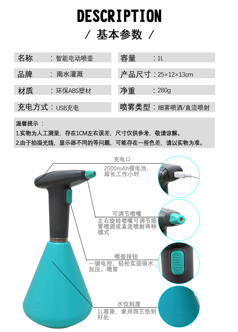 洒水浇水壶:喷壶;分类:洒水浇水壶;产地:国产;品牌:南水灌溉;包装清单:电动喷壶*1;