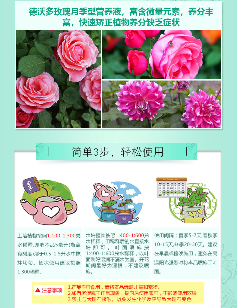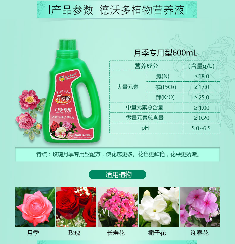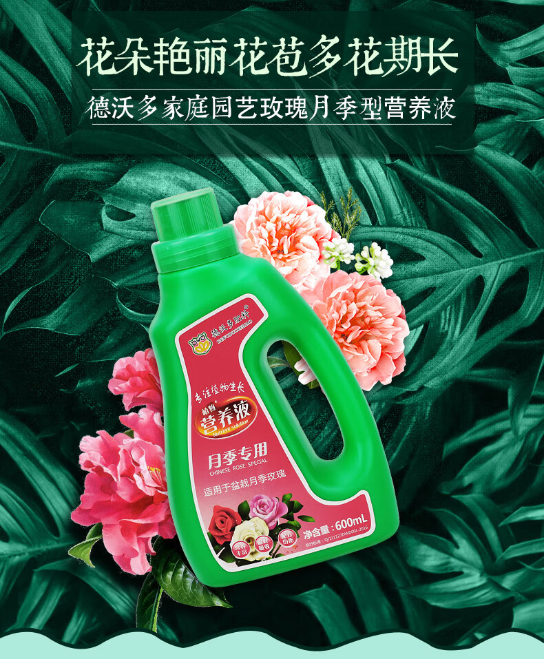 适用对象:观花植物;性状:液体;营养类型:营养液;品牌:德沃多肥料;包装清单:玫瑰月季型营养液600ml*1;