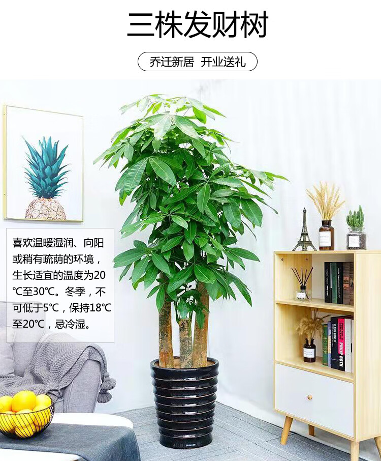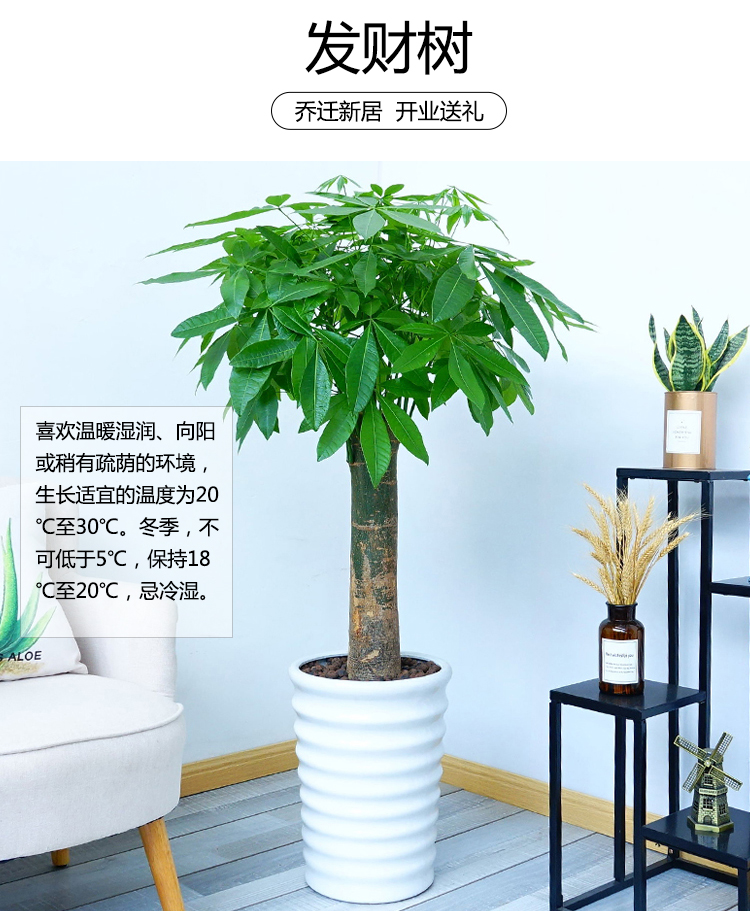 开花季节:长花期;是否含花盆:含盆;植物品种:其它;植物类别:木本花卉;适用空间:庭院,阳台,客厅,办公桌;颜色:绿色;包装清单:瓷盆随机,发财树一颗;