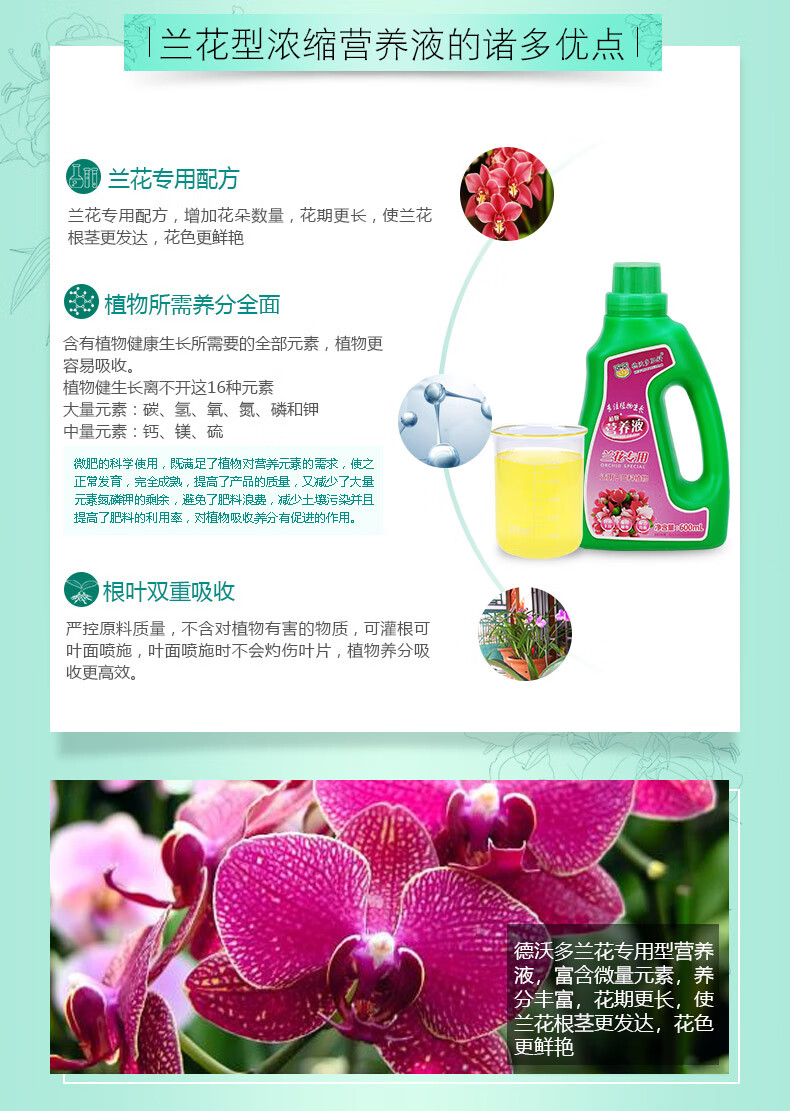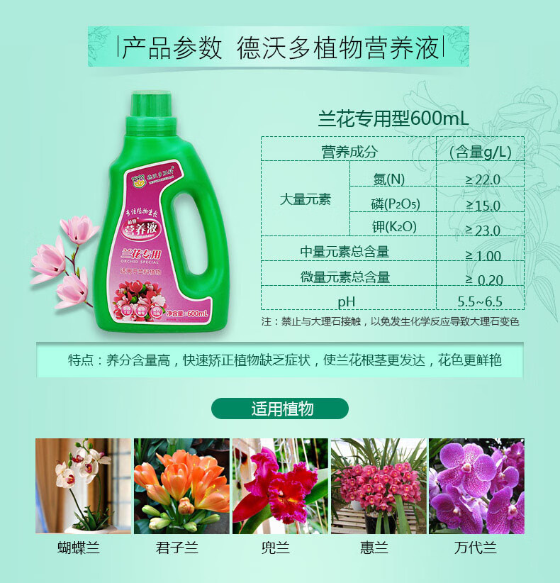 适用对象:兰科植物;性状:液体;营养类型:营养液;品牌:德沃多肥料;包装清单:兰花营养液600ml*1;