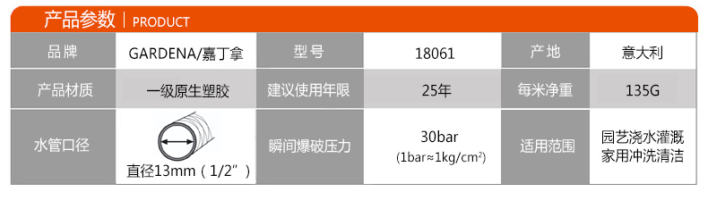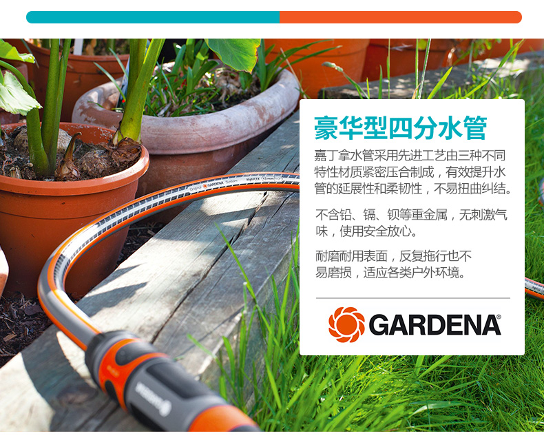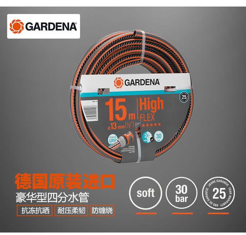 材质:其它;国产/进口:进口;分类:水枪/水管/水管车;品牌:嘉丁拿 (Gardena);包装清单:嘉丁拿豪华型四分水管15米*1;