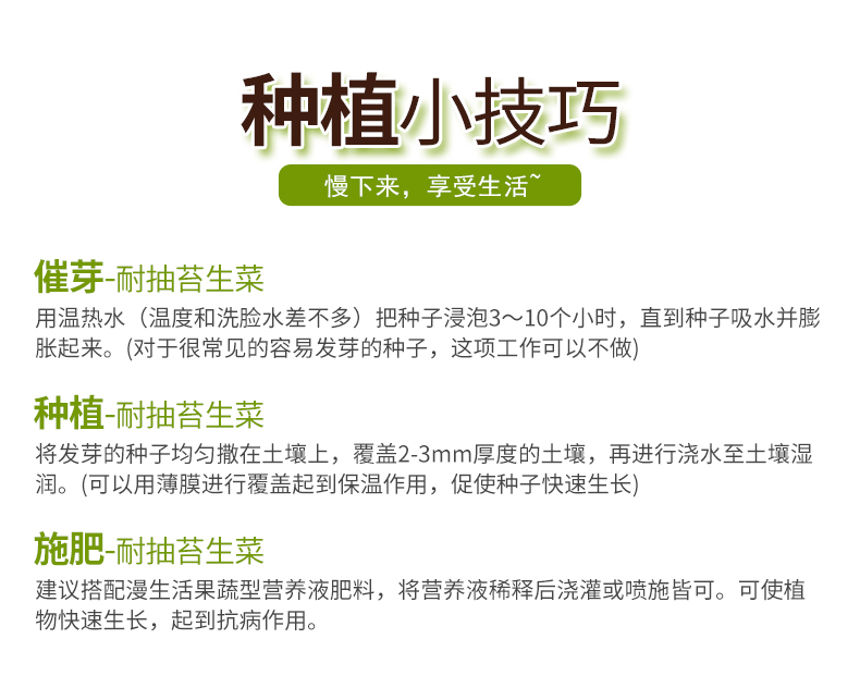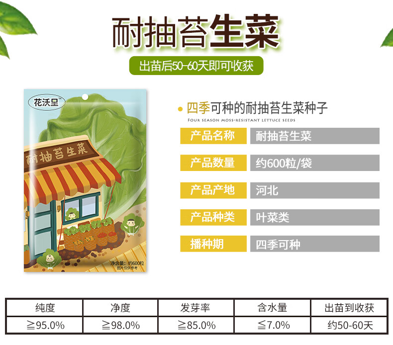 种类:叶菜类;适种区域:西北,华南,西南,华中,华东,东北,华北;适播季节:春,冬,夏,秋;国别:国产;类别:常规种子;种子经营许可证编号:D[翼沧青]农种许字(2019)第0003号;包衣:无包衣;检疫证明编号:1309220020180463;芽率(%):85%;生产年份(年):2020年;水分(%):7%;净度(%):98%;纯度(%):95%;包装清单:耐抽苔生菜种子1袋;