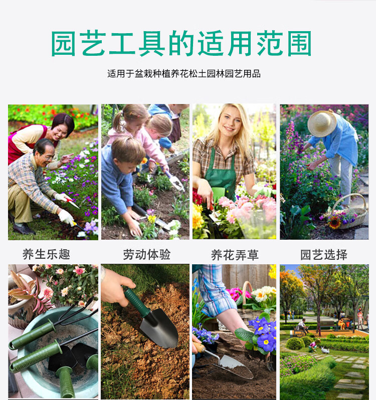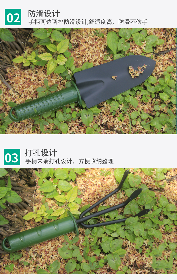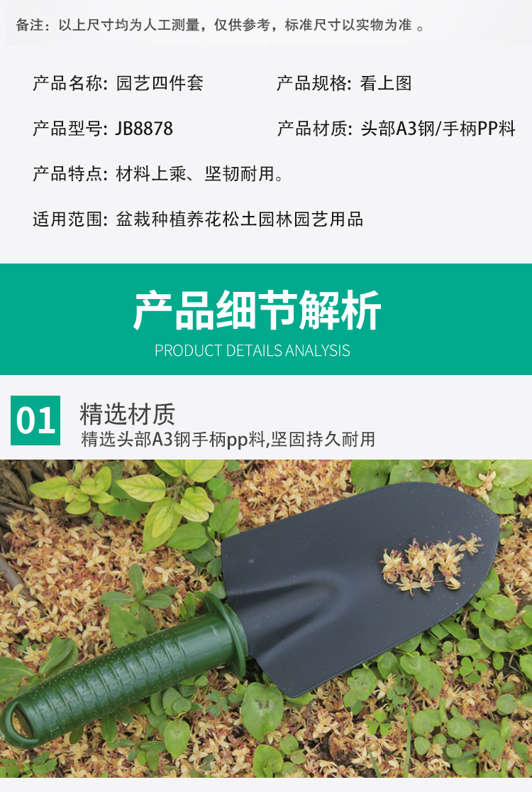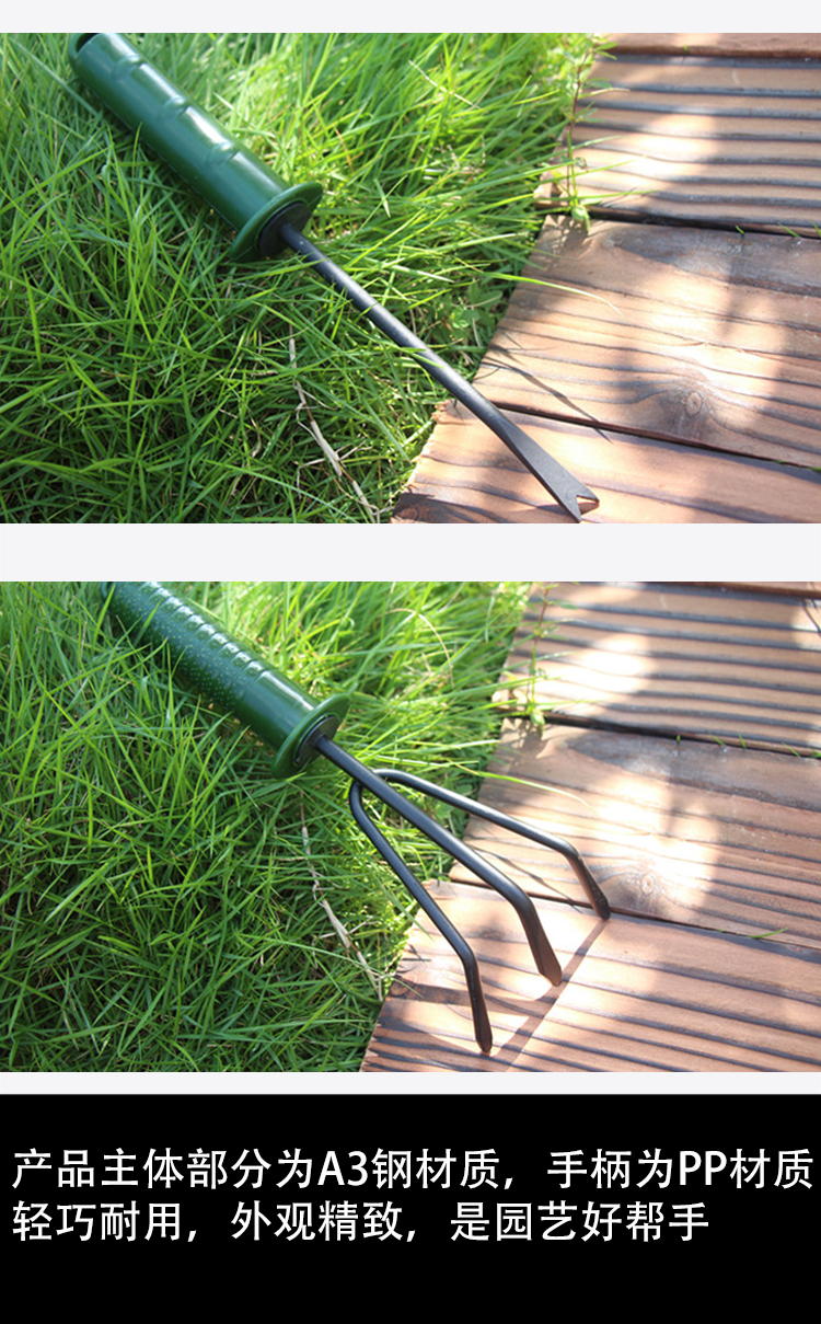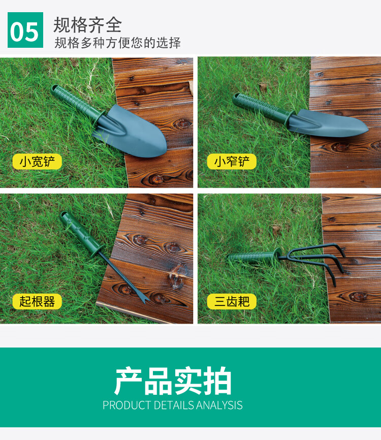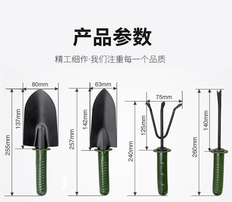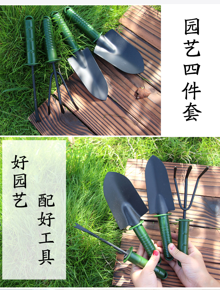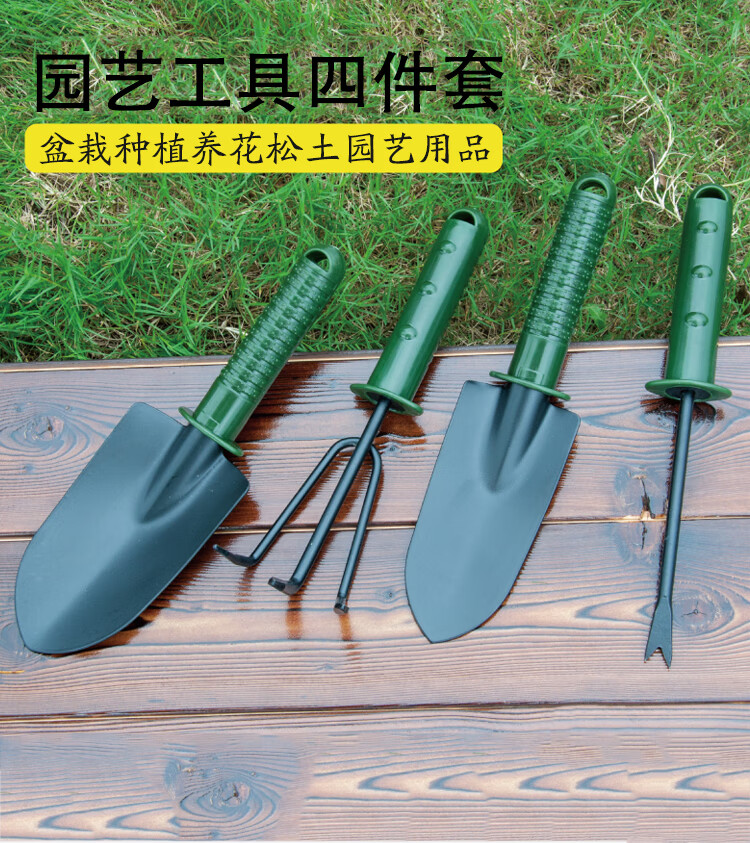 分类:铲/耙/锹/锄;品牌:佳佰;包装清单:尖铲*1,圆铲*1,三齿耙*1,一齿耙*1;
