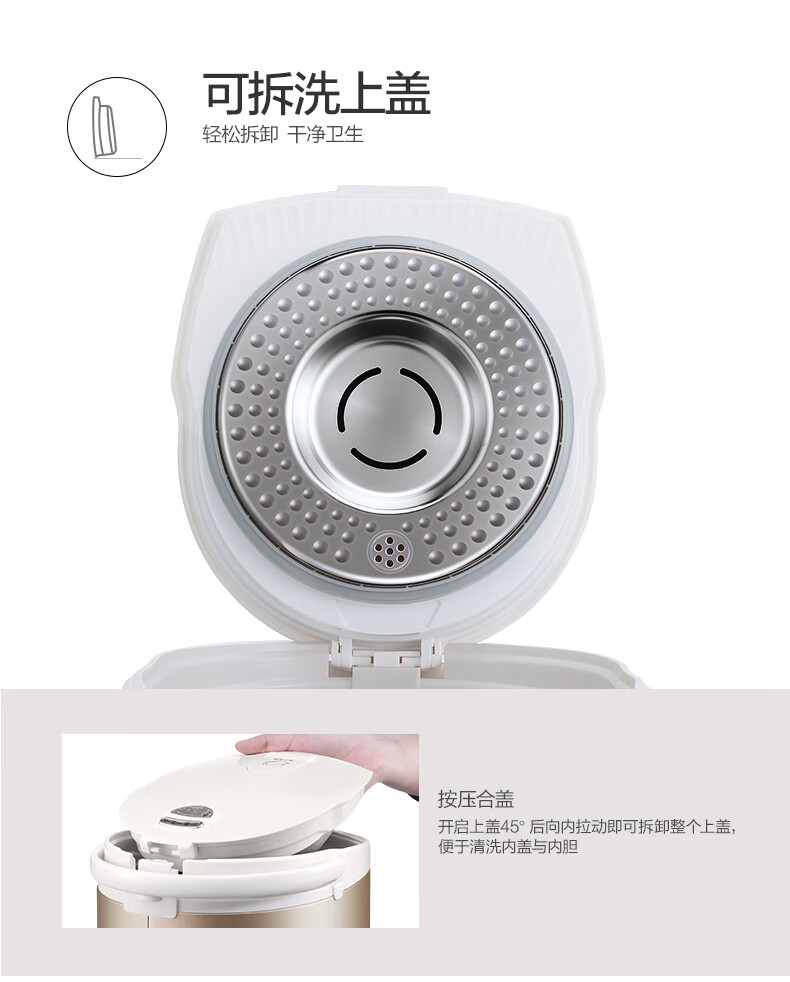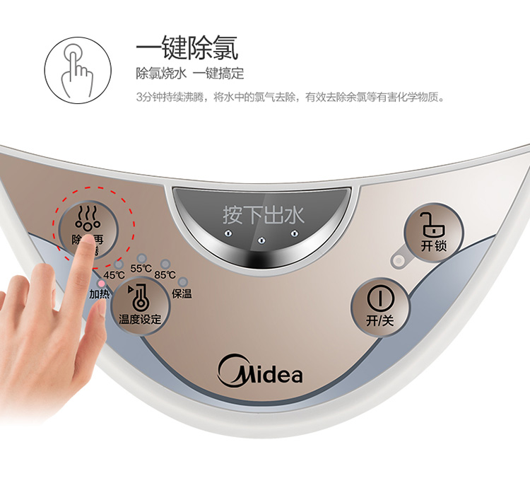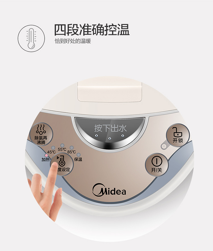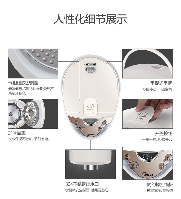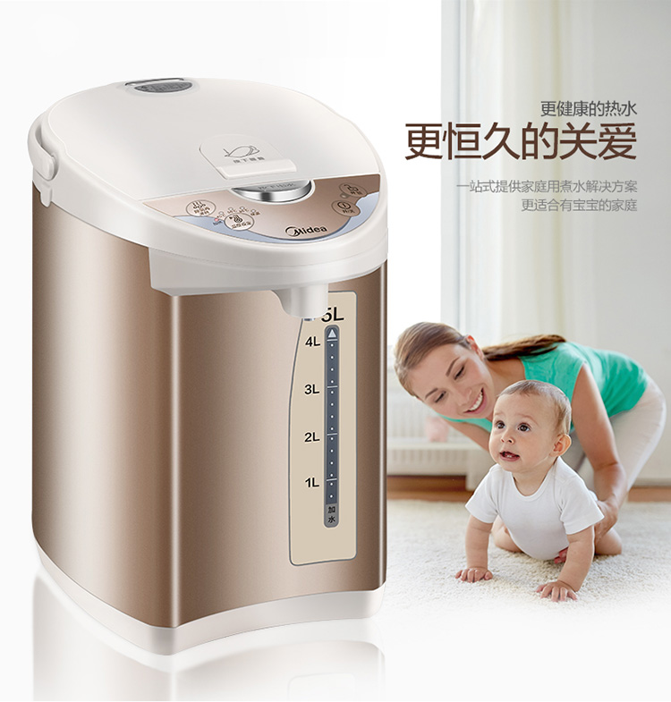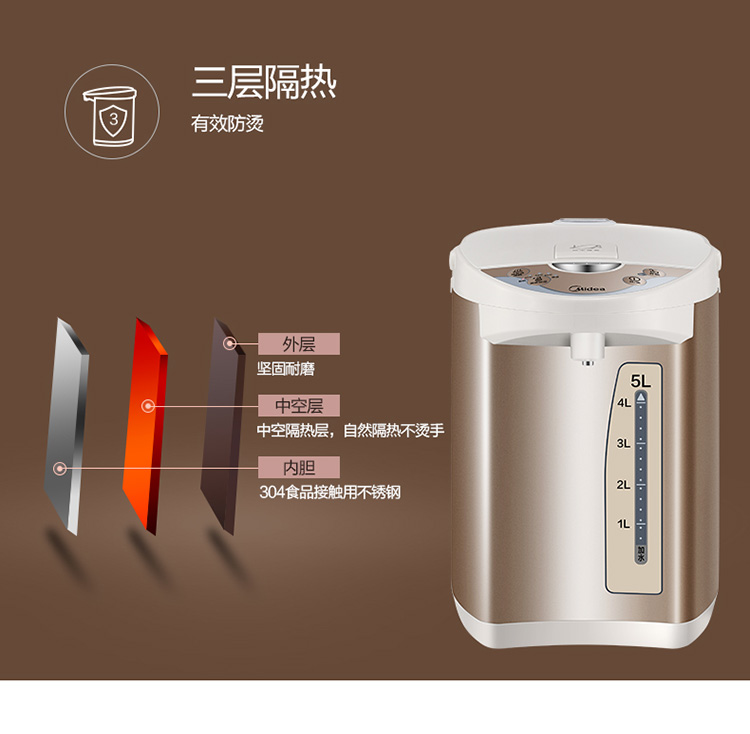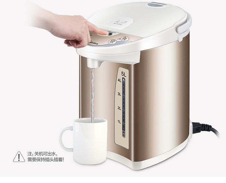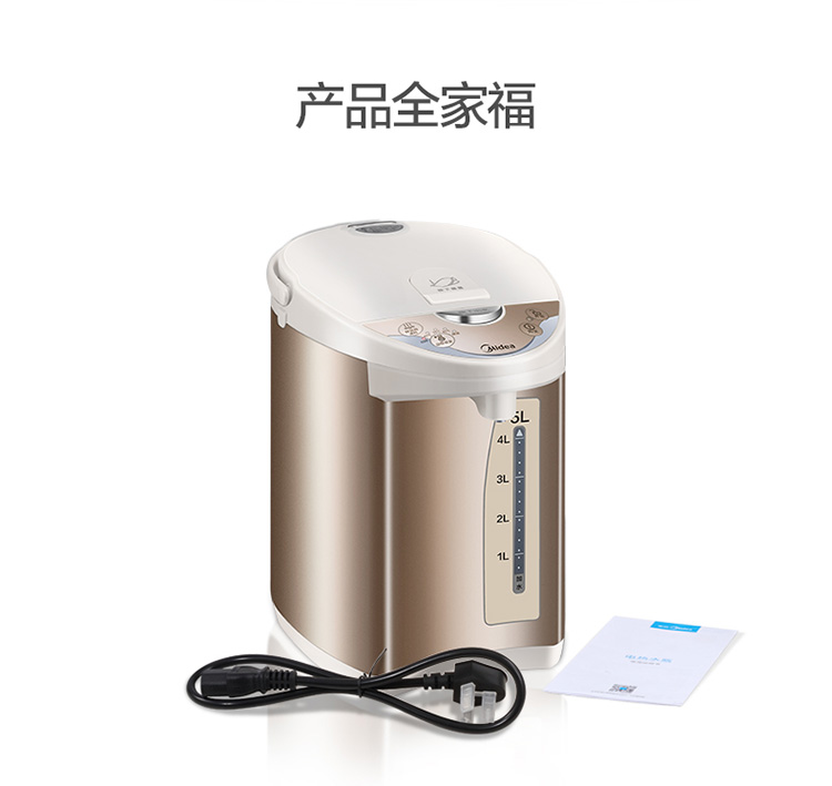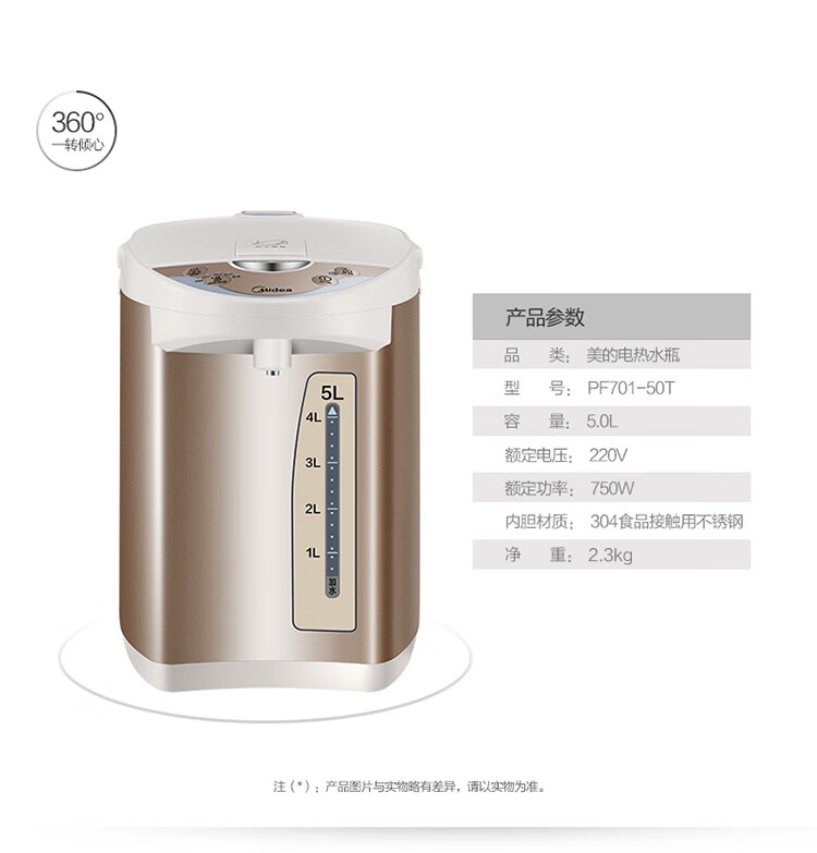 产品类别:电热水瓶;材质:食品级304不锈钢;容量:4.1L-5L;特色功能:安心童锁,保温,可拆上盖,电动出水,除氯,多段保温,带刻度;适用场景:家庭;品牌:美的;颜色:金色;认证型号:PF701-50T;容量(L):5L;产品尺寸(mm):390*358*280mm;额定功率(W):750W;额定电压(V):220V;产品净重(kg):2.3kg;电源线长度(m):0.7m;包装清单:电热水瓶PF701-50T*1,说明书保修卡*1;