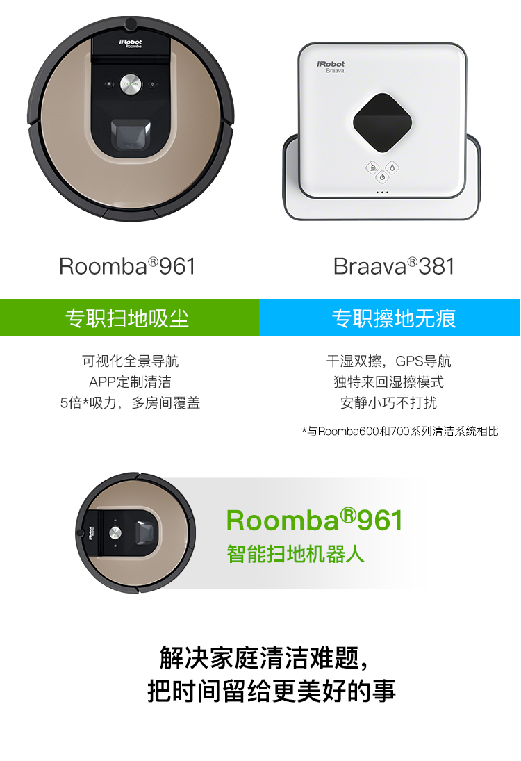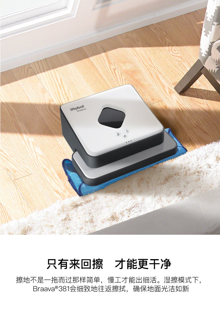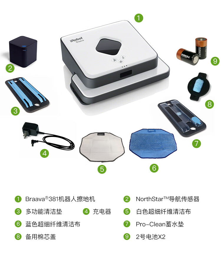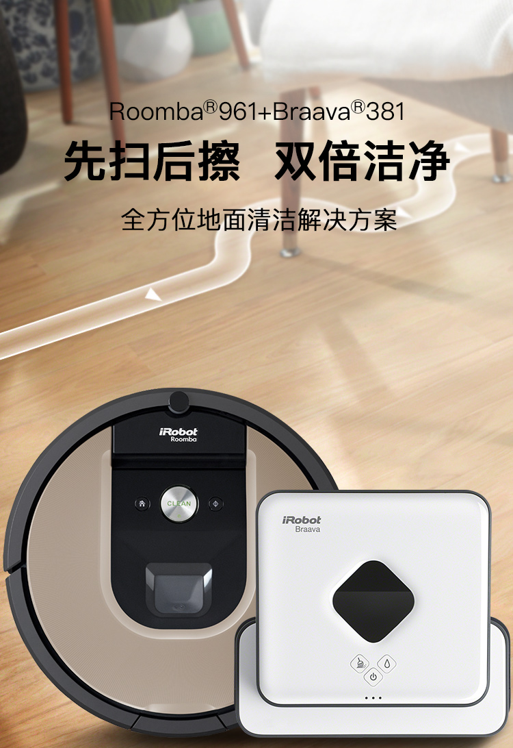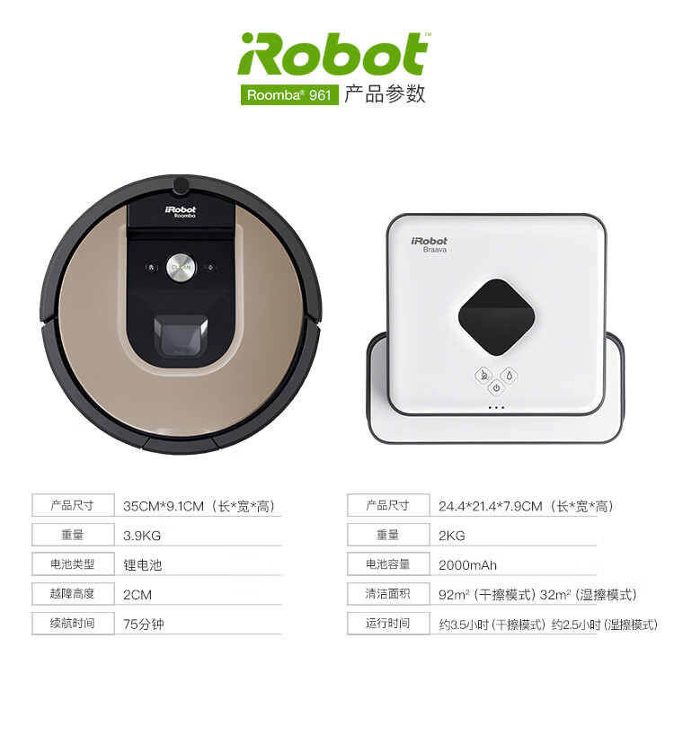 产品类型:扫擦套装;虚拟墙类型:无虚拟墙;防撞类型:红外防撞;电池类型:镍氢电池;特色功能:APP控制,定时预约,拖地功能,虚拟墙,地毯模式;清洁类型:滚刷;电池节数:6节;机身高度:9-10cm;电池容量:2000-2499mAH;适用面积:120平以上;水箱容量:81-150毫升;规划技术:随机式;拖地/水箱类型:渗水水箱;电机类型:无刷电机;续航时间:121分钟-180分钟;清扫路线:规划式;机身高度(cm):9.1cm;电池节数(节):6节;吸力(pa/aw):0pa/aw;充电类型:自动回充;噪音(db):60db;充电时间:约3H;续航时间(分钟):120分钟;品牌:iRobot;产品型号:961+381;产品尺寸(mm):扫:350(D)*91(H) 擦:244*214*79(L*W*H);额定功率(W):33W;水箱容量(L):0.1L;额定电压(V):220V;产品净重(kg):3.0kg;集尘容量(L):0.6L;包装清单:扫地机:主机1个、全新锂电池1个(已装机)、充电座1个、HEAP滤网1个(已装机)、虚拟墙1个、1套AeroForce吸取器(已装机)、1个AeroForce垃圾盒(已装机)、电源线(1)、用户手册(1)、保修卡(1) 擦地机:主机*1、NorthStar导航盒*1、电池*2、充电器*1、备用棉芯盖*1、蓝色超细纤维清洁布*1、白色超细纤维清洁布*1、多功能清洁垫*1、Pro-clean蓄水垫*;
