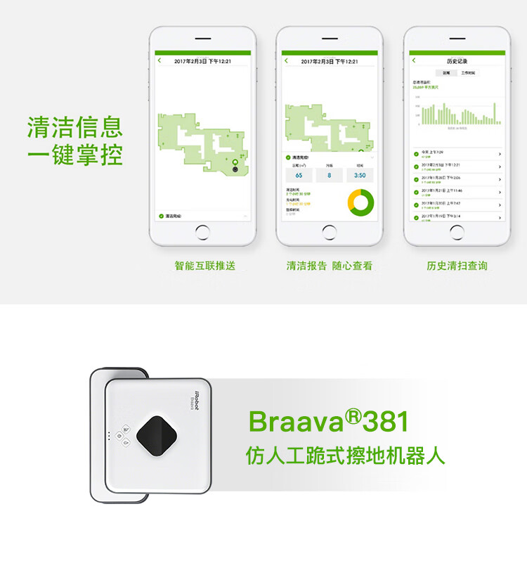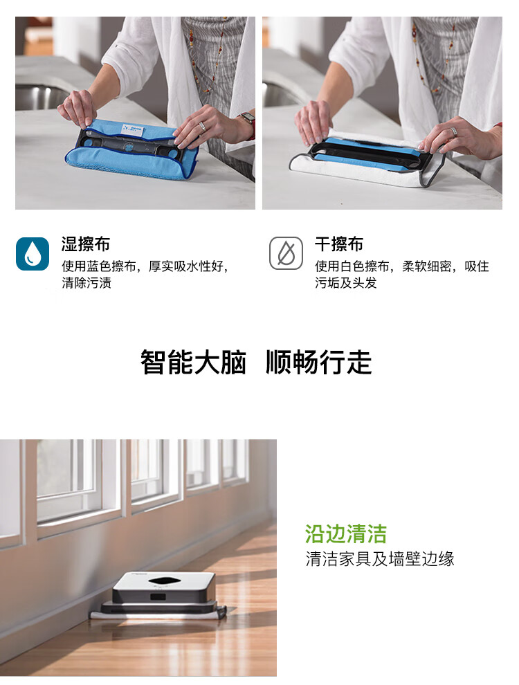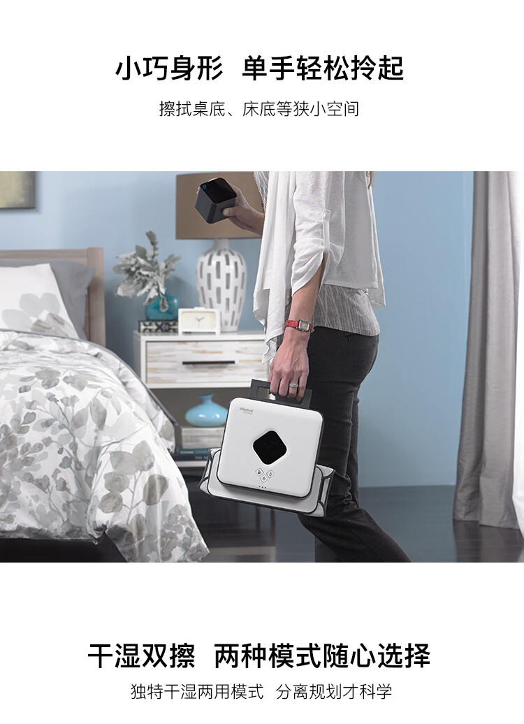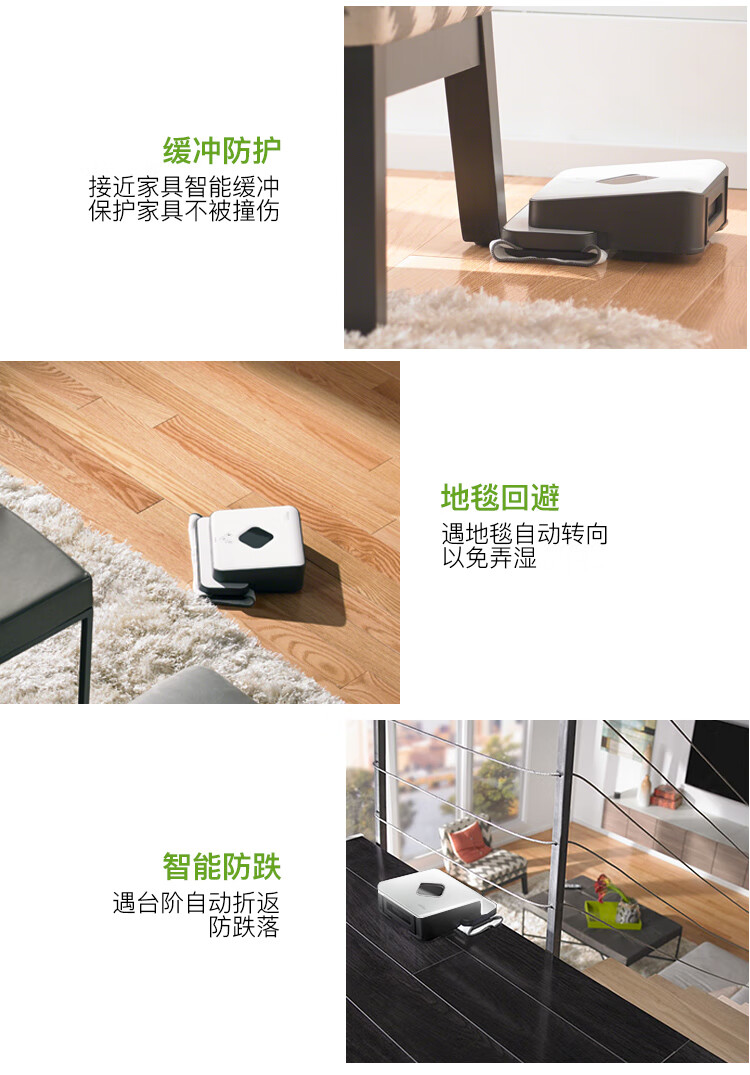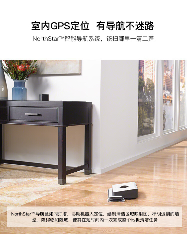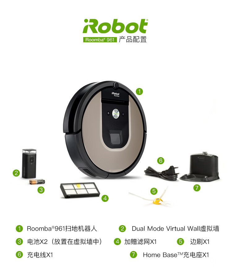 产品类型:扫擦套装;虚拟墙类型:无虚拟墙;防撞类型:红外防撞;电池类型:镍氢电池;特色功能:APP控制,定时预约,拖地功能,虚拟墙,地毯模式;清洁类型:滚刷;电池节数:6节;机身高度:9-10cm;电池容量:2000-2499mAH;适用面积:120平以上;水箱容量:81-150毫升;规划技术:随机式;拖地/水箱类型:渗水水箱;电机类型:无刷电机;续航时间:121分钟-180分钟;清扫路线:规划式;机身高度(cm):9.1cm;电池节数(节):6节;吸力(pa/aw):0pa/aw;充电类型:自动回充;噪音(db):60db;充电时间:约3H;续航时间(分钟):120分钟;品牌:iRobot;产品型号:961+381;产品尺寸(mm):扫:350(D)*91(H) 擦:244*214*79(L*W*H);额定功率(W):33W;水箱容量(L):0.1L;额定电压(V):220V;产品净重(kg):3.0kg;集尘容量(L):0.6L;包装清单:扫地机:主机1个、全新锂电池1个(已装机)、充电座1个、HEAP滤网1个(已装机)、虚拟墙1个、1套AeroForce吸取器(已装机)、1个AeroForce垃圾盒(已装机)、电源线(1)、用户手册(1)、保修卡(1) 擦地机:主机*1、NorthStar导航盒*1、电池*2、充电器*1、备用棉芯盖*1、蓝色超细纤维清洁布*1、白色超细纤维清洁布*1、多功能清洁垫*1、Pro-clean蓄水垫*;