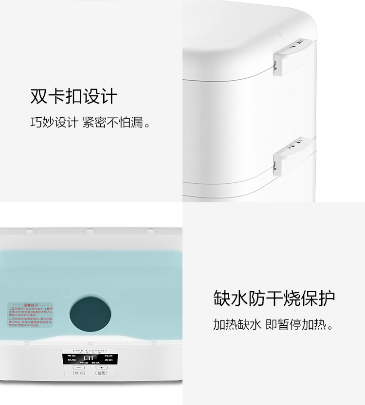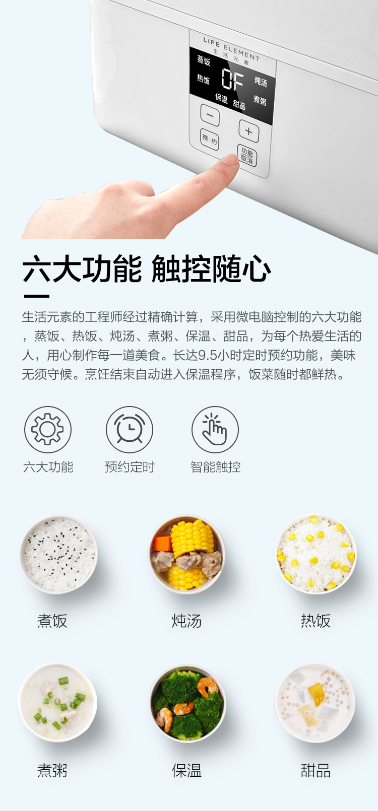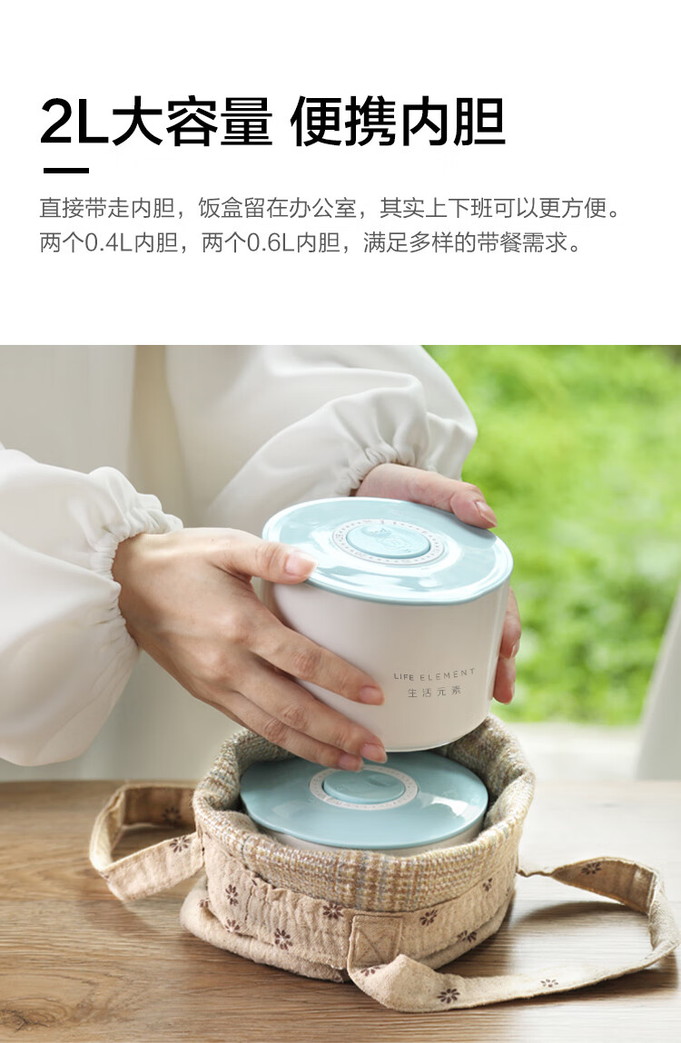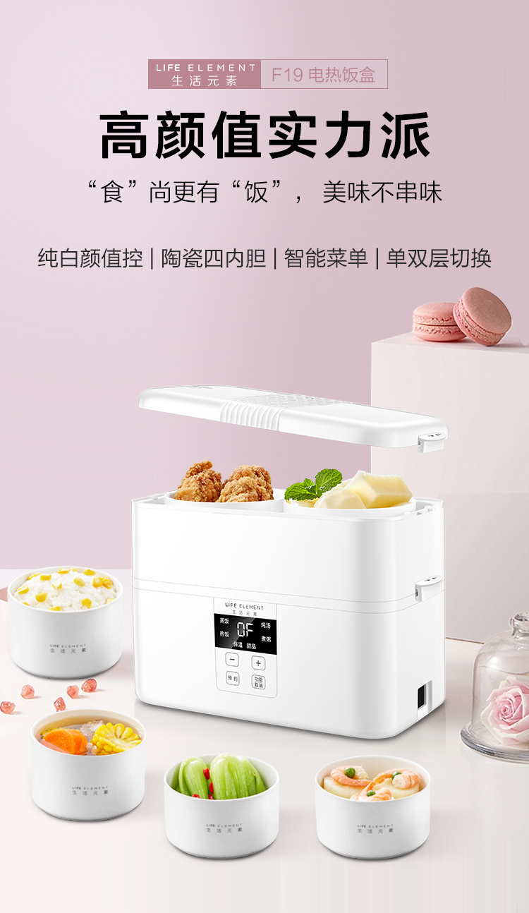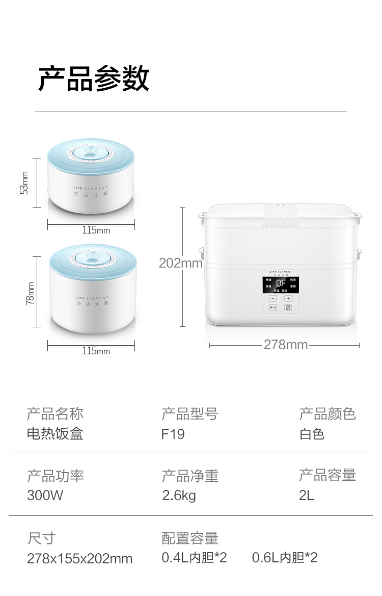 产品功能:加热;保鲜方式:真空保鲜;操控方式:微电脑式;内胆材质:陶瓷;适用场景:宿舍,家用,商用,办公室;层数:双层;容量:1.6L-2L;品牌:生活元素;颜色:白色;认证型号:F19;产品产地:广东;产品尺寸(mm):278x155x202mm;产品净重(kg):2.6;额定电压(v):220;包装清单:1、2*0.6+2*0.4L陶瓷容器 2、量杯 3、饭盒袋 4、电源线 5、说明书;额定功率(w):300;防干烧功能:支持;定时功能:支持;使用方式:微电脑触控;预约功能:支持;显示方式:液晶屏;包装清单:1、2*0.6+2*0.4L陶瓷容器 2、量杯 3、饭盒袋 4、电源线 5、说明书;