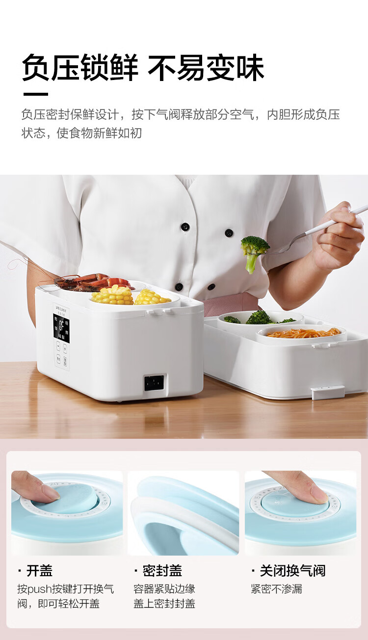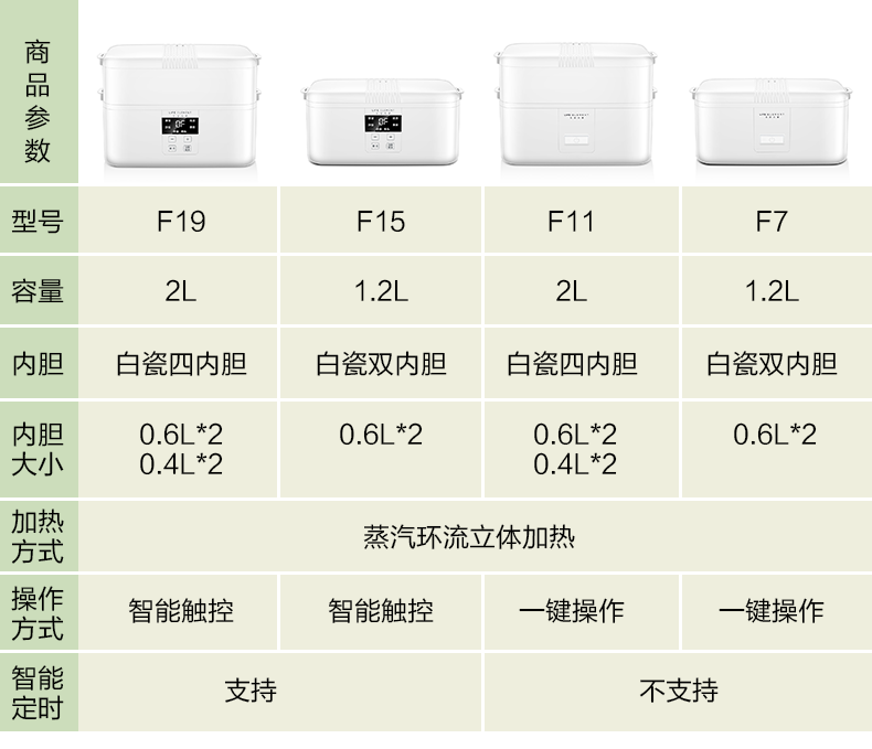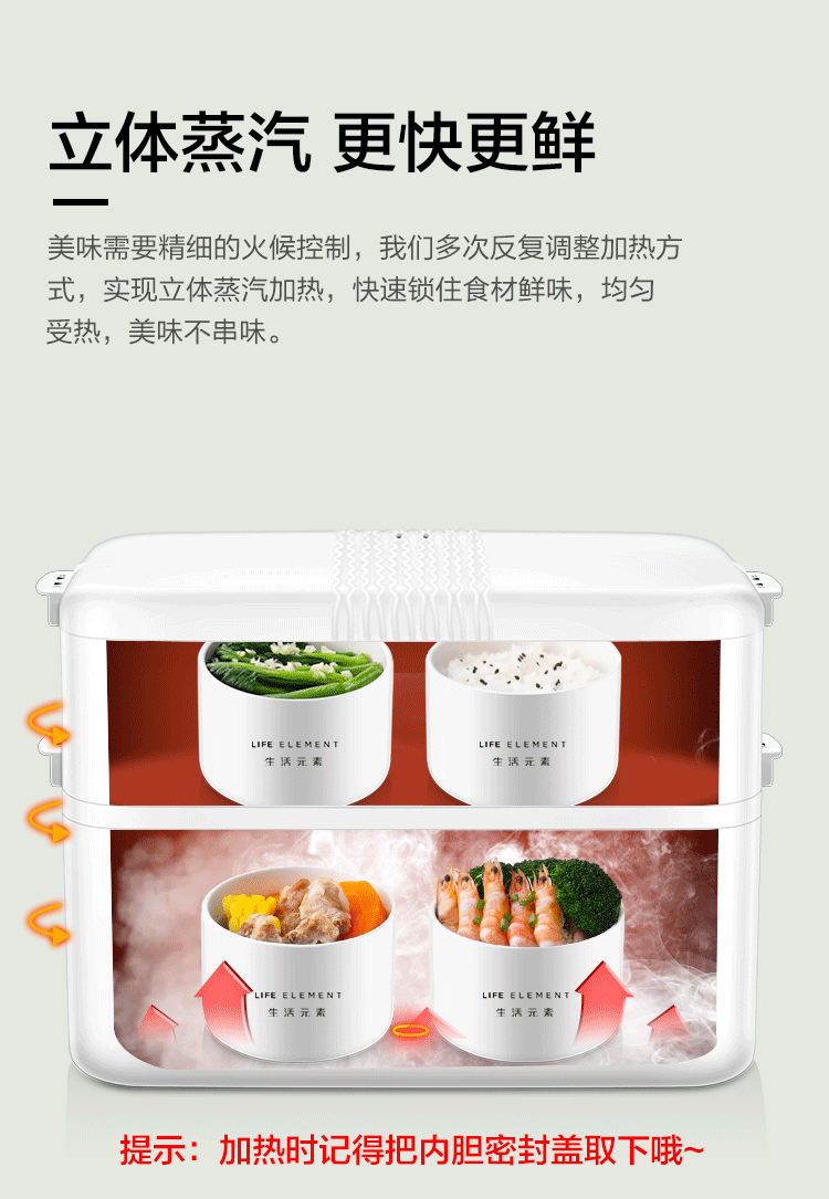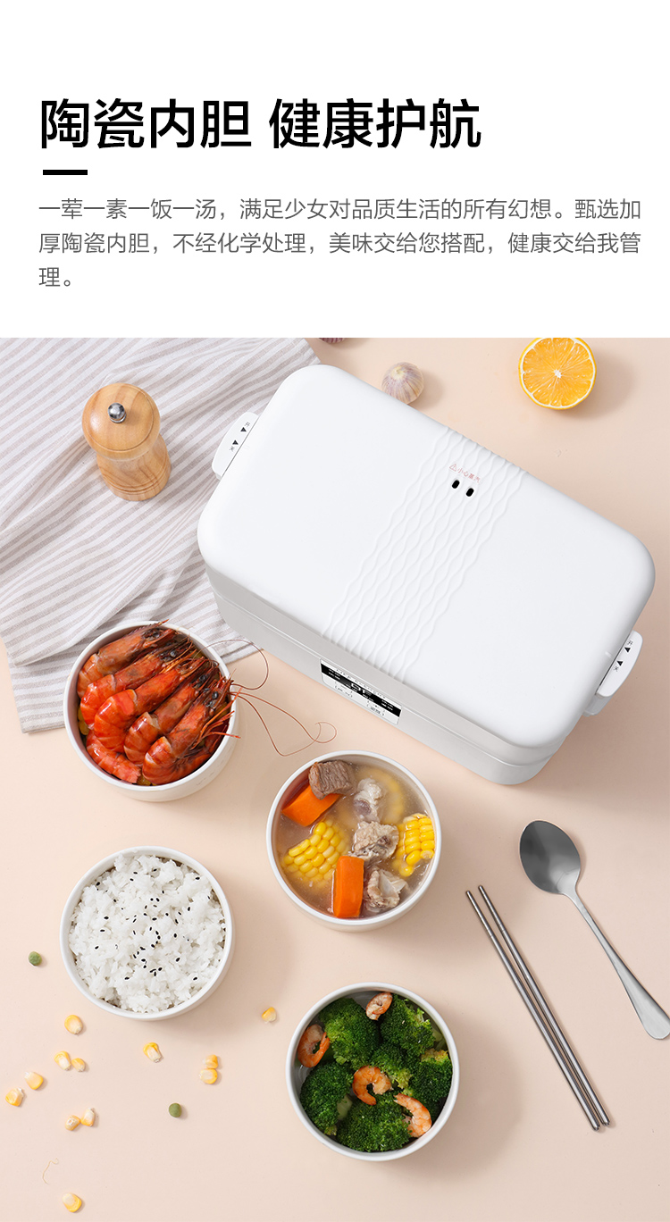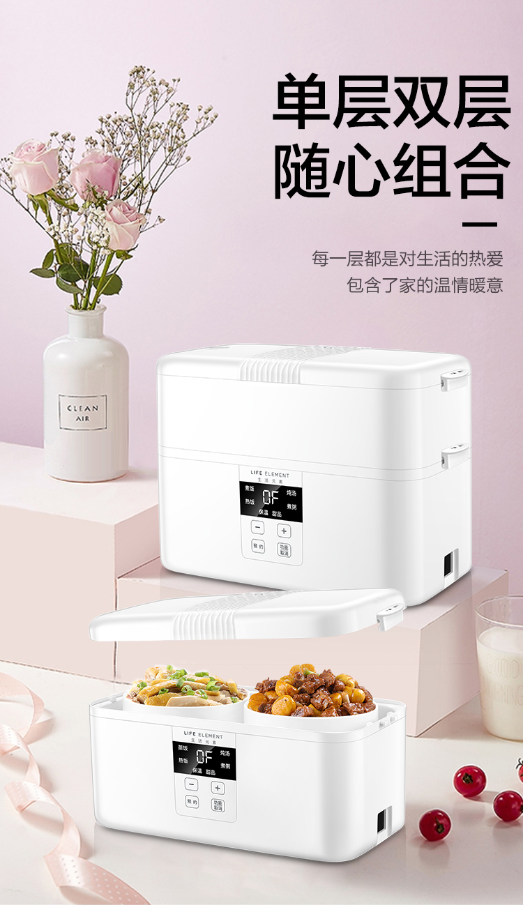 产品功能:加热;保鲜方式:真空保鲜;操控方式:微电脑式;内胆材质:陶瓷;适用场景:宿舍,家用,商用,办公室;层数:双层;容量:1.6L-2L;品牌:生活元素;颜色:白色;认证型号:F19;产品产地:广东;产品尺寸(mm):278x155x202mm;产品净重(kg):2.6;额定电压(v):220;包装清单:1、2*0.6+2*0.4L陶瓷容器 2、量杯 3、饭盒袋 4、电源线 5、说明书;额定功率(w):300;防干烧功能:支持;定时功能:支持;使用方式:微电脑触控;预约功能:支持;显示方式:液晶屏;包装清单:1、2*0.6+2*0.4L陶瓷容器 2、量杯 3、饭盒袋 4、电源线 5、说明书;