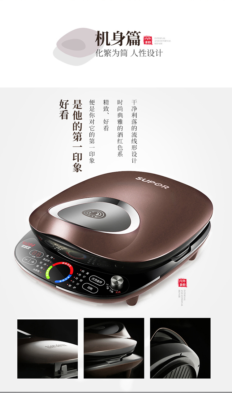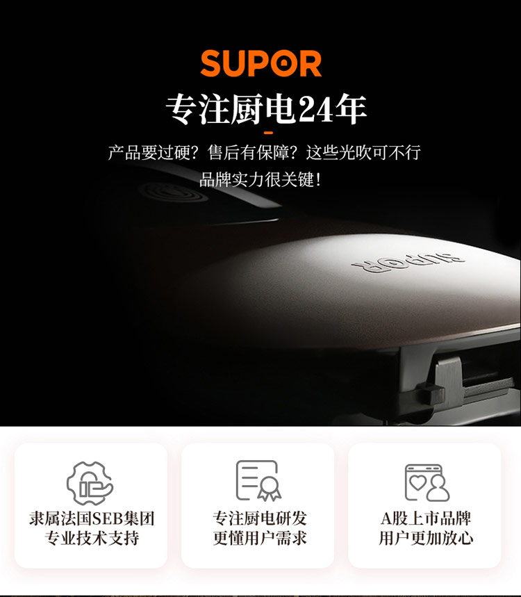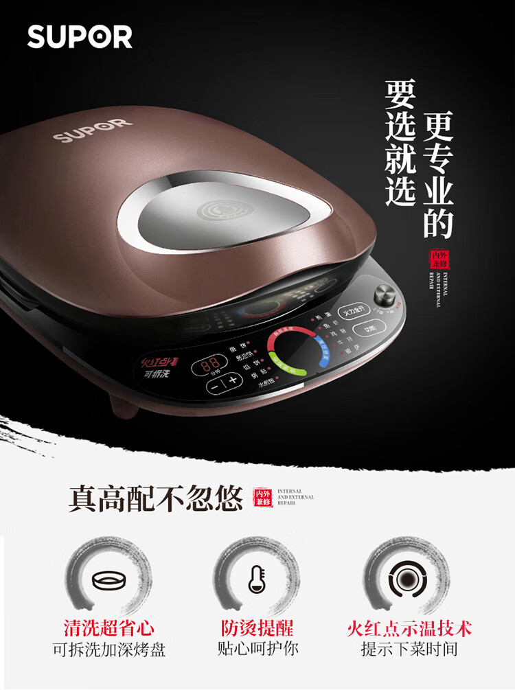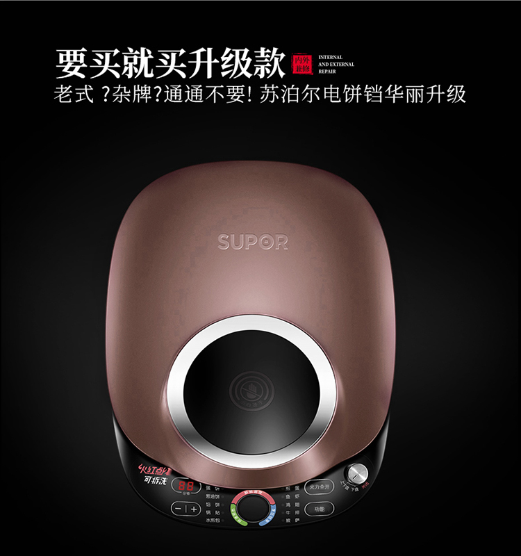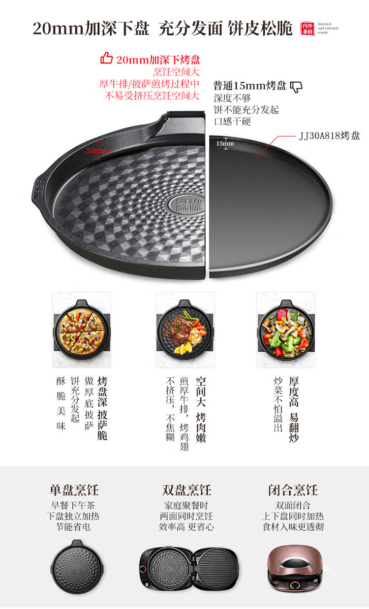 烤盘类型:圆盘;产品类别:电饼铛;操控方式:微电脑式;功率:1201-1500w;加热方式:双面加热;火力调节:不可调节;烤盘直径:28cm-32cm;清洗方式:下盘可拆洗;特色功能:定时,速热,悬浮;品牌:苏泊尔;颜色:其它;认证型号:JD30R645;产品尺寸(mm):L390*W300*H161;额定功率w:1201-1500w;产品净重(kg):3.59;额定电压:220v;产品产地:中国浙江;自动控温:不支持;菜单功能:支持菜单功能;导油槽 导油槽,是采用靠近开合绞链端的饼铛盖上设有的一种集油装置。这种集油装置为至少有一边与内凸部下端的饼铛盖面连成一体的、且其余边为凸边的集油导槽,与该集油导槽对应的饼铛盘的盘边沿上设有供该集油导槽卡卧的导油卧槽。若电饼铛有导油槽,则可以有效解决电饼铛内产生的油渍对机体腐蚀的问题,具有节油,无污损和腐蚀,提高产品的使用寿命和热利用率高的优点。:支持;自动断电:不支持;定时功能:支持;烤盘直径cm:28cm-32cm;烙盘设计:悬浮式;展开度数:180度;烤盘深度cm:2;包装清单:电饼铛机体*1,木铲*1,说明书保修卡*1;