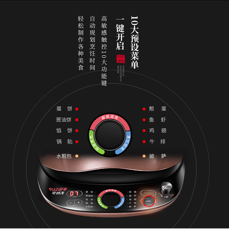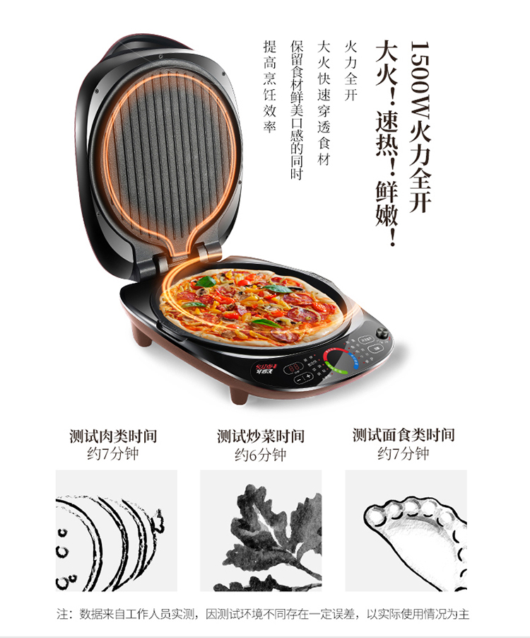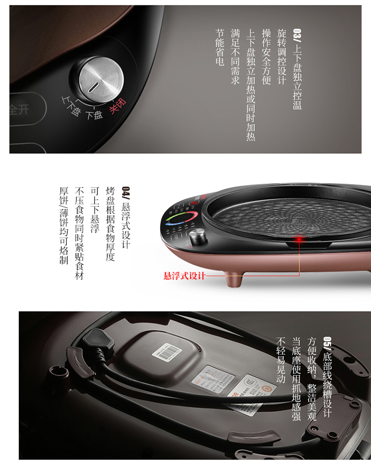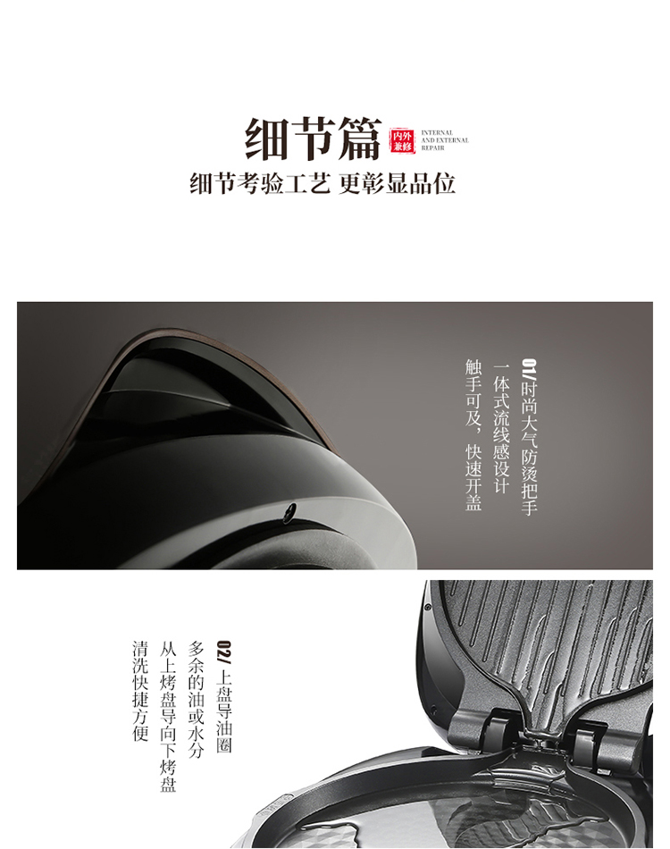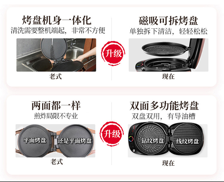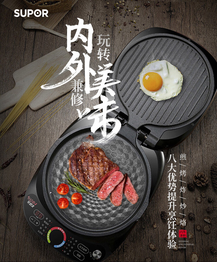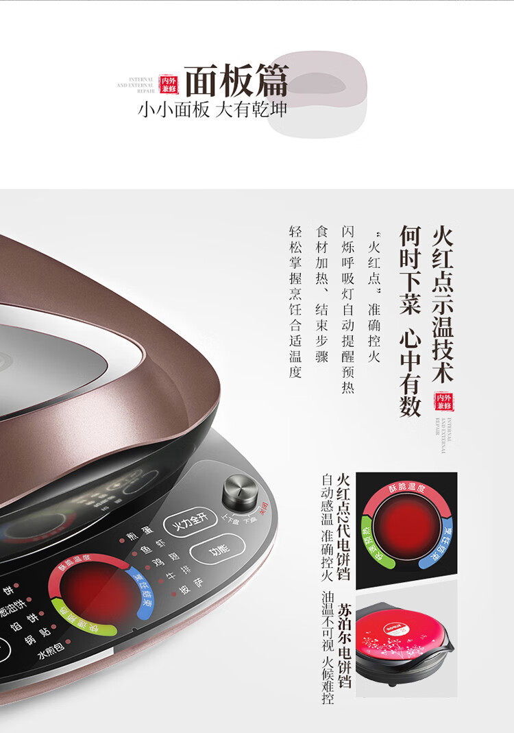 烤盘类型:圆盘;产品类别:电饼铛;操控方式:微电脑式;功率:1201-1500w;加热方式:双面加热;火力调节:不可调节;烤盘直径:28cm-32cm;清洗方式:下盘可拆洗;特色功能:定时,速热,悬浮;品牌:苏泊尔;颜色:其它;认证型号:JD30R645;产品尺寸(mm):L390*W300*H161;额定功率w:1201-1500w;产品净重(kg):3.59;额定电压:220v;产品产地:中国浙江;自动控温:不支持;菜单功能:支持菜单功能;导油槽 导油槽,是采用靠近开合绞链端的饼铛盖上设有的一种集油装置。这种集油装置为至少有一边与内凸部下端的饼铛盖面连成一体的、且其余边为凸边的集油导槽,与该集油导槽对应的饼铛盘的盘边沿上设有供该集油导槽卡卧的导油卧槽。若电饼铛有导油槽,则可以有效解决电饼铛内产生的油渍对机体腐蚀的问题,具有节油,无污损和腐蚀,提高产品的使用寿命和热利用率高的优点。:支持;自动断电:不支持;定时功能:支持;烤盘直径cm:28cm-32cm;烙盘设计:悬浮式;展开度数:180度;烤盘深度cm:2;包装清单:电饼铛机体*1,木铲*1,说明书保修卡*1;
