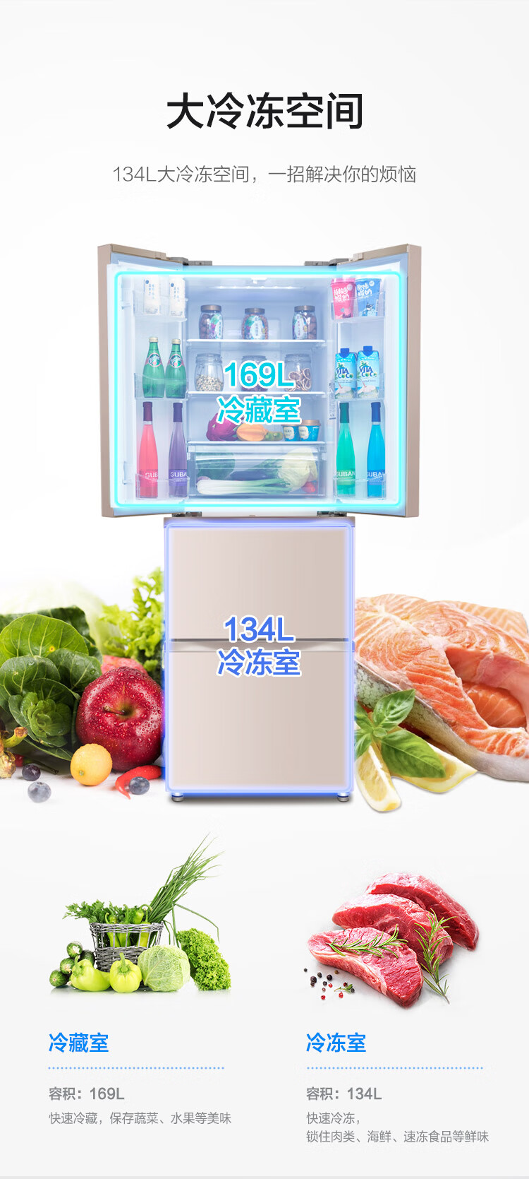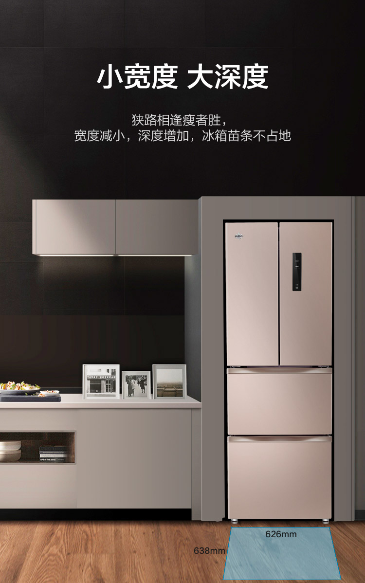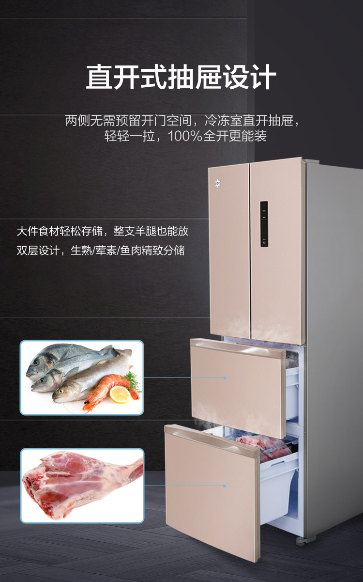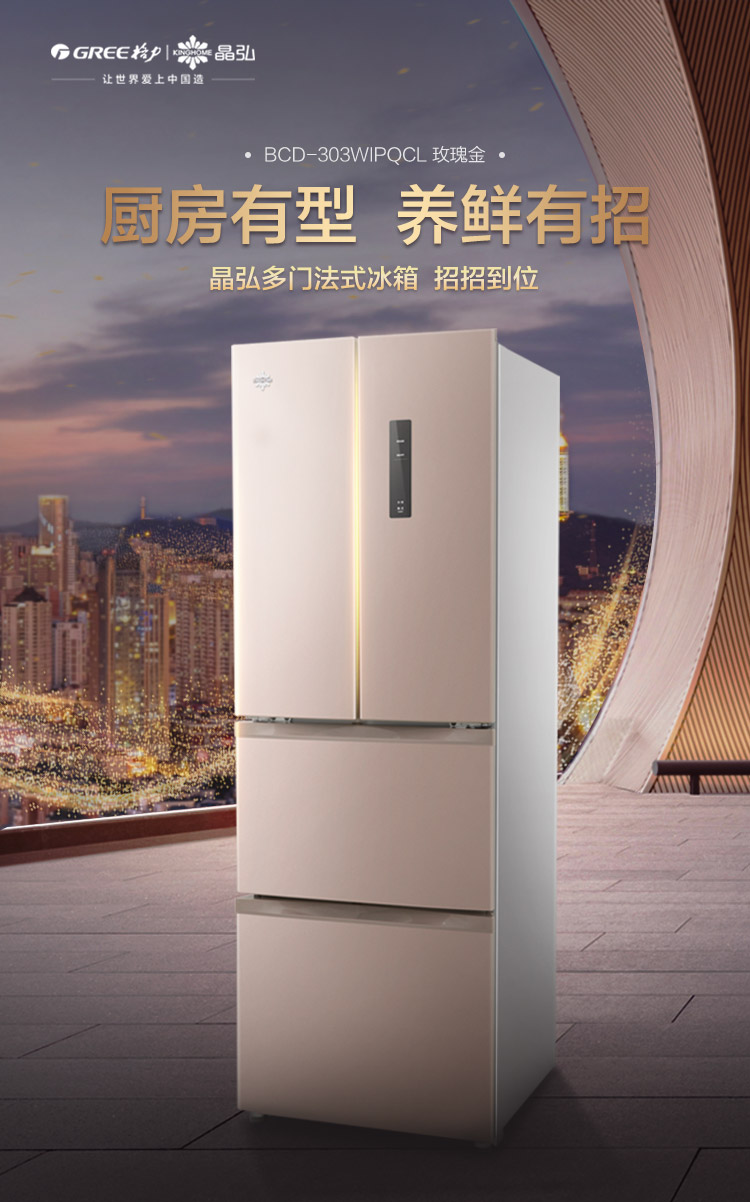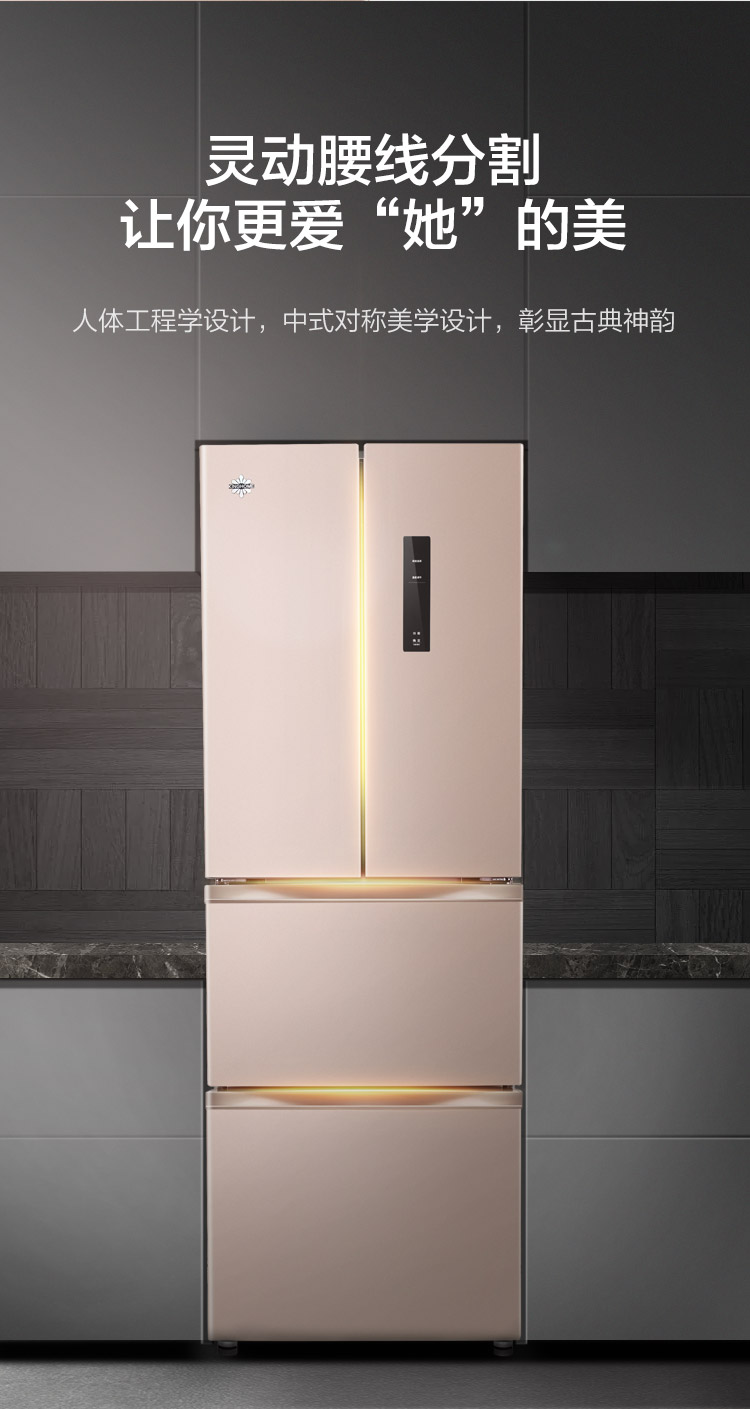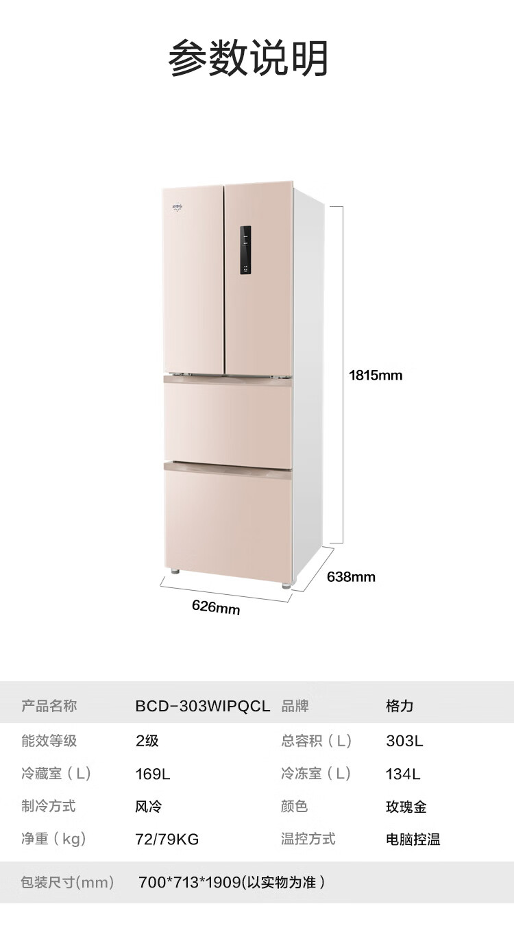 特色推荐:多口之家,高颜值,精细存储;面板材质:彩钢;面板颜色:金色;总容积:301-400升;高度:180.1-190cm;压缩机:变频(节能);门款式:多门;控温方式:电脑控温;制冷方式:风冷(无霜);深度:60.1-65cm;用户优选:高端冰箱,京品冰箱;能效等级:二级能效;宽度:60.1-65cm;品牌:晶弘;颜色 此信息为箱体主体色系,具体样式请查看商品主图或详情进一步了解。:金色;产品类型:多门;认证型号 认证型号:CCC证书上的产品型号信息。:BCD-303WIPQCL;产品型号:BCD-303WIPQCL;制冷类型:压缩机制冷;冷藏室(升):169;总容积(升):303;冷冻室(升):134;运转音dB(A):35;能效等级:二级能效;除霜模式:智能除霜;制冷方式 风冷式:制冷均匀,无需人工除霜。 直冷式:耗电量低,食物水分不易流失。 风直冷(混冷)式:蒸发器吸热结合室内风扇,让空气强制对流。:风冷;制冷循环:单循环;定频/变频 变频:根据冰箱内温度差异,自动调整压缩机转速,更节能。:变频;耗电量(KWh/24h):0.86;制冷剂:R600a;产品尺寸(深x宽x高)mm:638*626*1815;包装尺寸(深x宽x高)mm:713*700*1909;电压/频率:220V/50HZ;产品重量(kg):79;包装清单:冰箱× 1、说明书× 1;