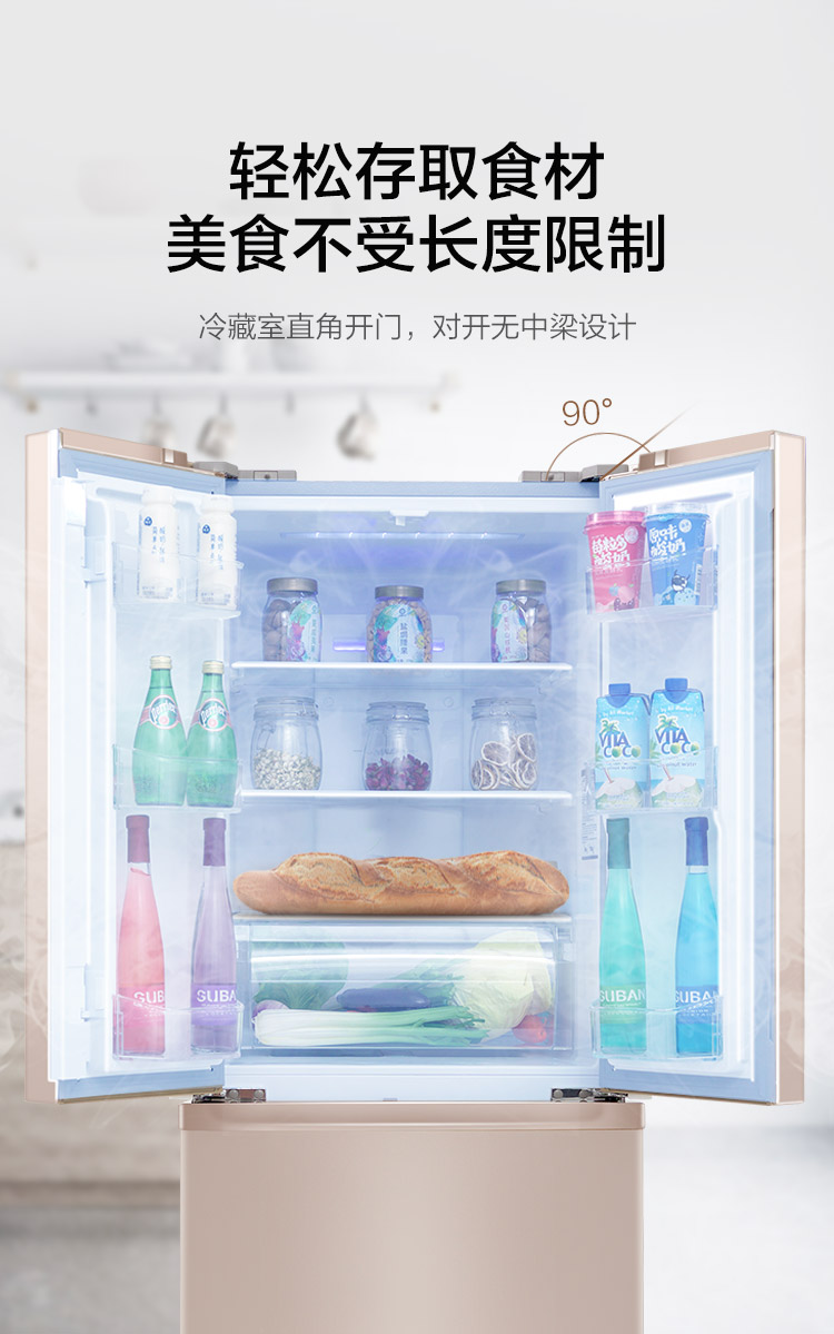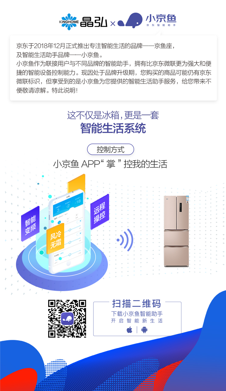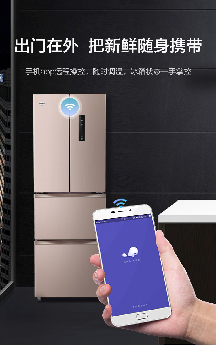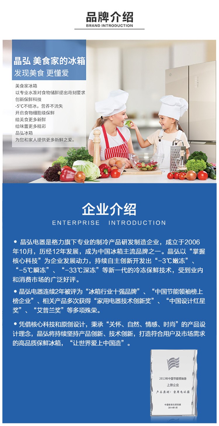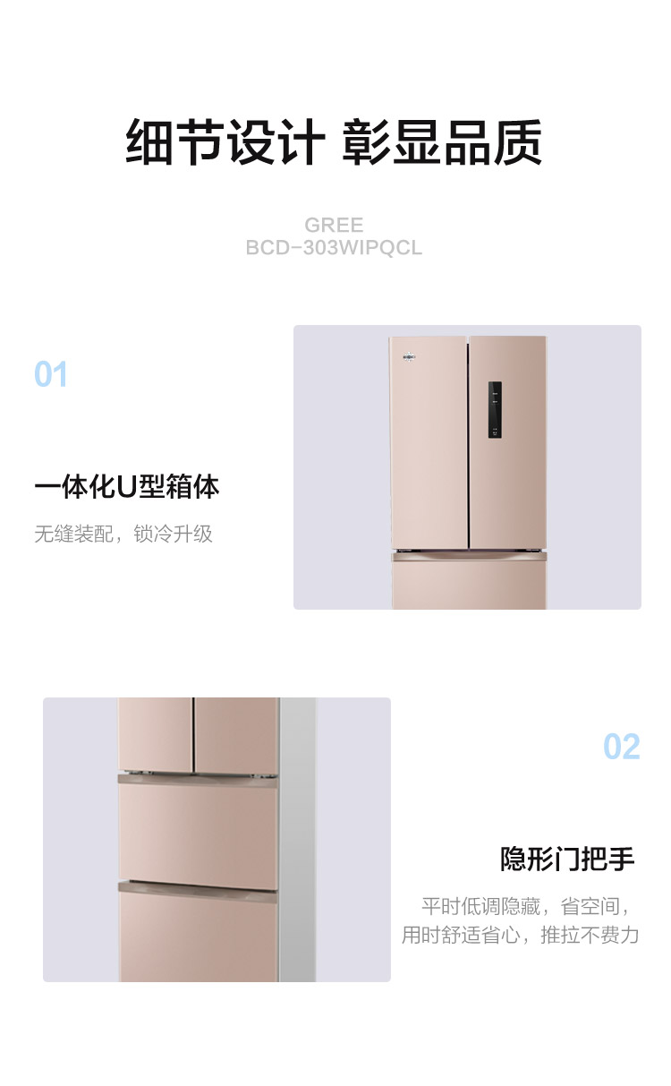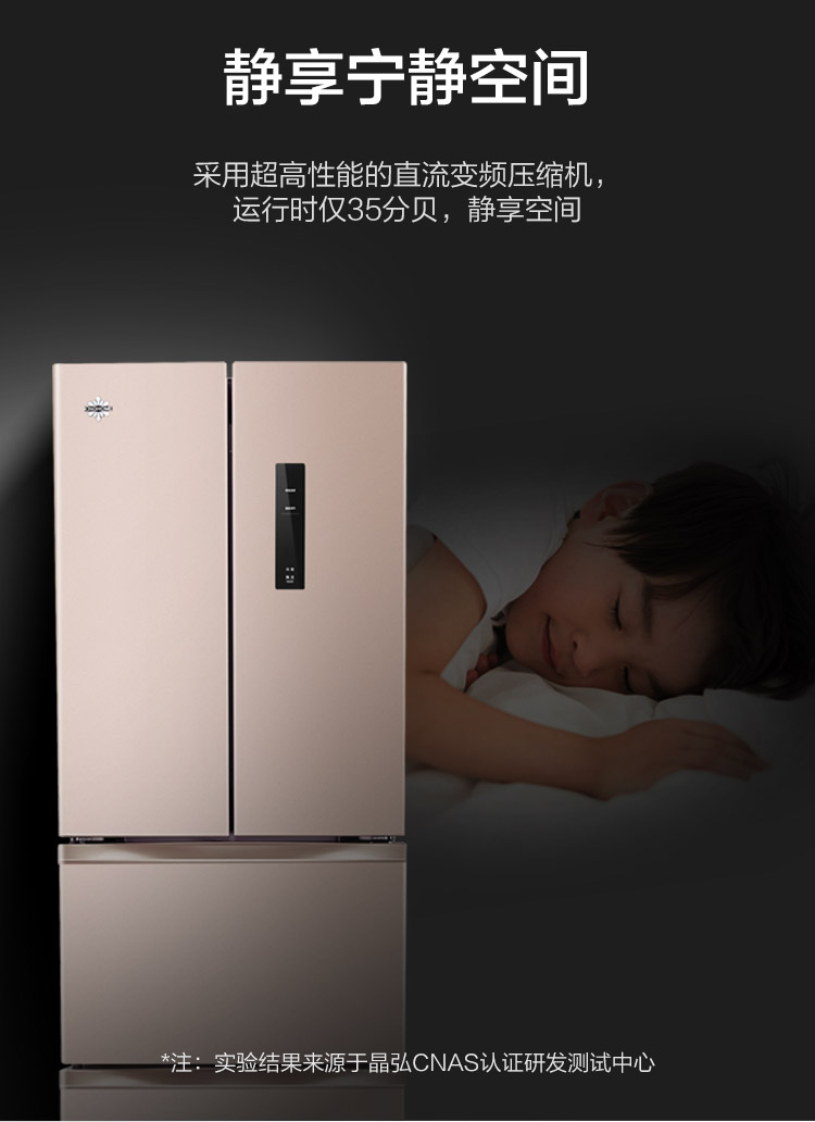 特色推荐:多口之家,高颜值,精细存储;面板材质:彩钢;面板颜色:金色;总容积:301-400升;高度:180.1-190cm;压缩机:变频(节能);门款式:多门;控温方式:电脑控温;制冷方式:风冷(无霜);深度:60.1-65cm;用户优选:高端冰箱,京品冰箱;能效等级:二级能效;宽度:60.1-65cm;品牌:晶弘;颜色 此信息为箱体主体色系,具体样式请查看商品主图或详情进一步了解。:金色;产品类型:多门;认证型号 认证型号:CCC证书上的产品型号信息。:BCD-303WIPQCL;产品型号:BCD-303WIPQCL;制冷类型:压缩机制冷;冷藏室(升):169;总容积(升):303;冷冻室(升):134;运转音dB(A):35;能效等级:二级能效;除霜模式:智能除霜;制冷方式 风冷式:制冷均匀,无需人工除霜。 直冷式:耗电量低,食物水分不易流失。 风直冷(混冷)式:蒸发器吸热结合室内风扇,让空气强制对流。:风冷;制冷循环:单循环;定频/变频 变频:根据冰箱内温度差异,自动调整压缩机转速,更节能。:变频;耗电量(KWh/24h):0.86;制冷剂:R600a;产品尺寸(深x宽x高)mm:638*626*1815;包装尺寸(深x宽x高)mm:713*700*1909;电压/频率:220V/50HZ;产品重量(kg):79;包装清单:冰箱× 1、说明书× 1;