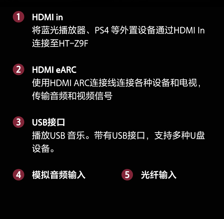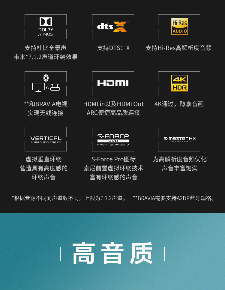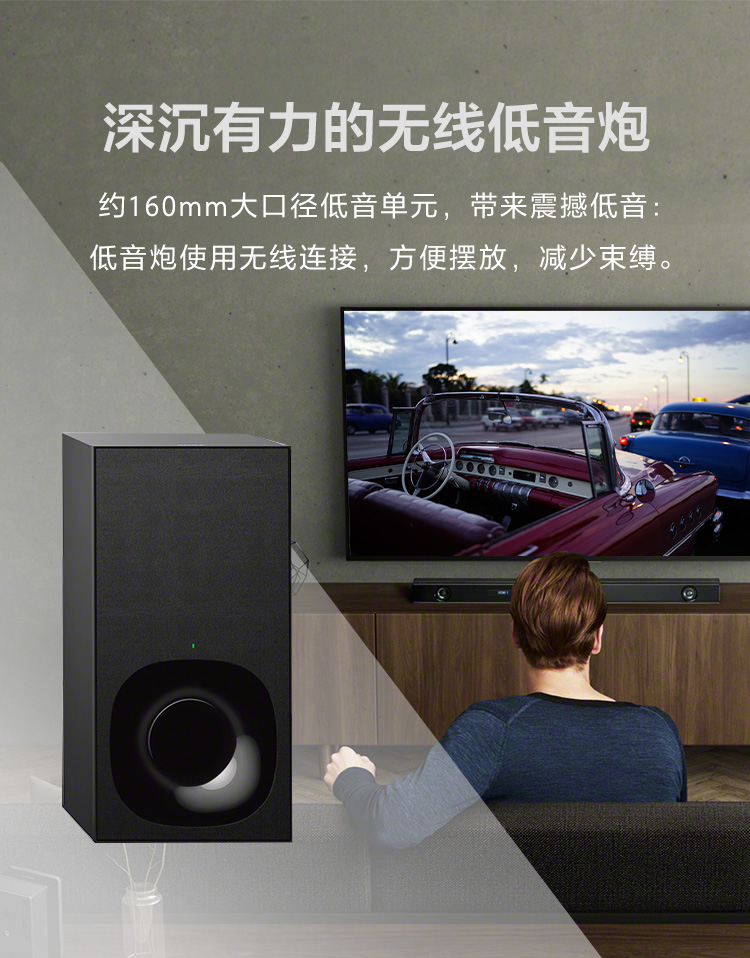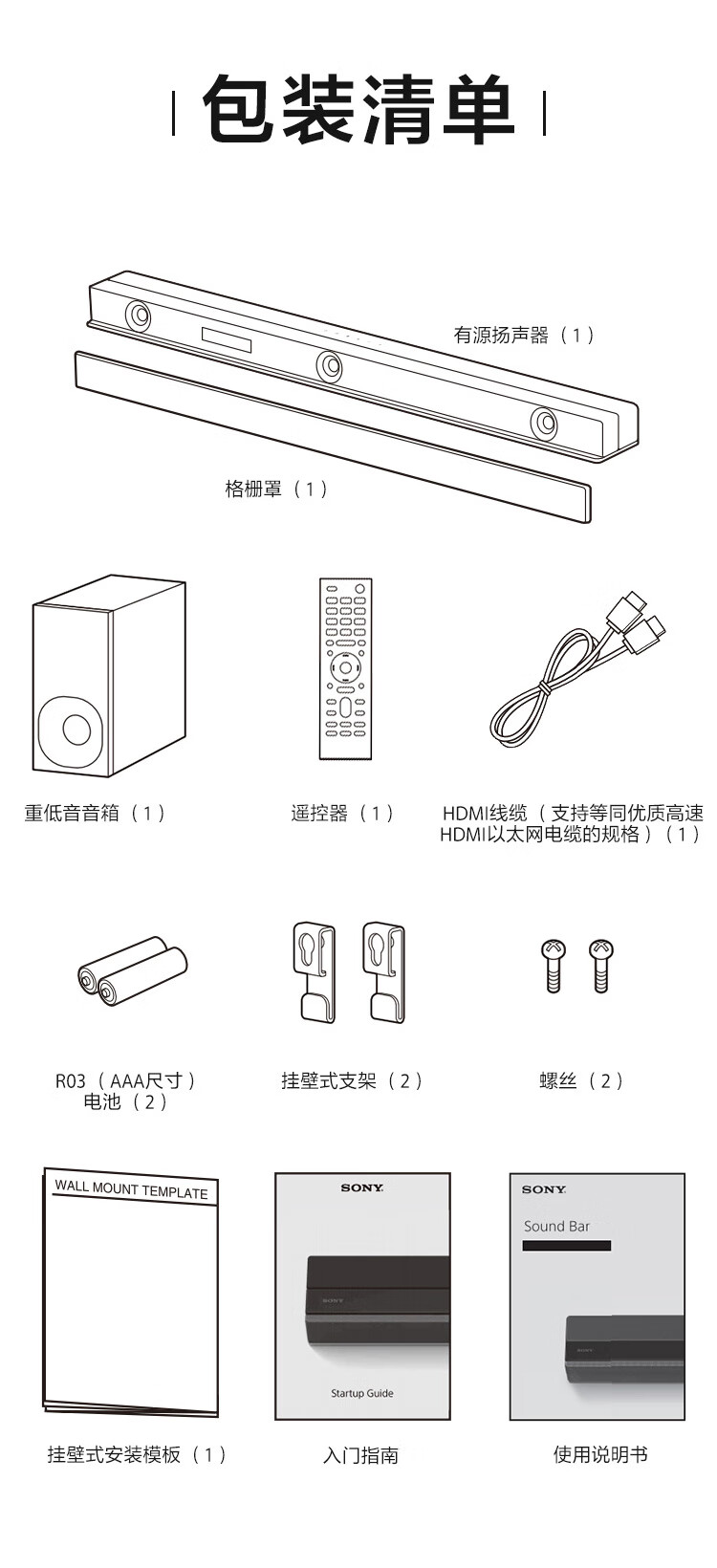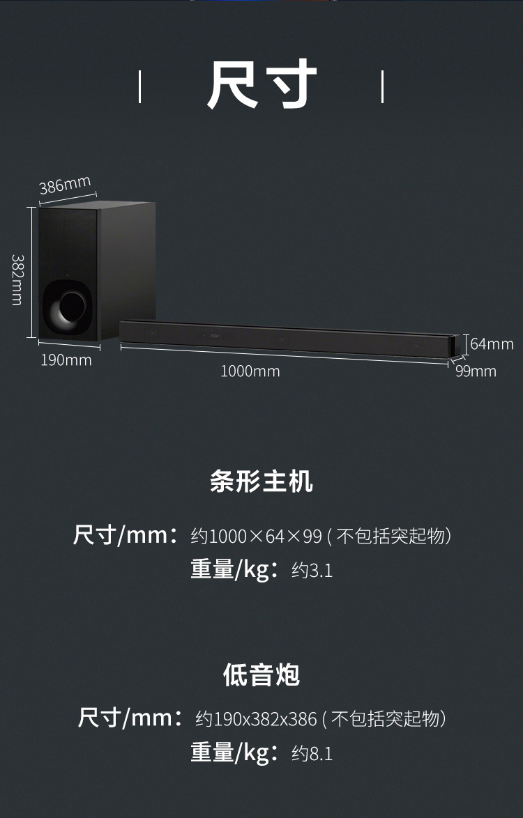 声道:其他;产品类别:无线低音炮套装;连接方式:蓝牙;搭配电视尺寸:55英寸及以上;音响效果:无线低音炮套装;主机重量:约3.1;主机尺寸(长宽高):不包括格栅:约1000×64×98 包括格栅:约1000×64×99 (不包含突起物);品牌:索尼(SONY);产品型号:HT-Z9F;包装清单:条形音箱 (1) 低音炮 (1) 遥控 (1) 电池 (2) HDMI线 (1) 壁挂安装模板 (1) 壁挂安装支架 (1) 保修卡 (1) 产品说明书 (1) 外包装 (1);