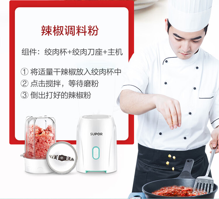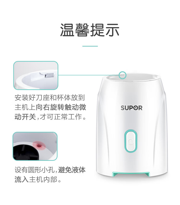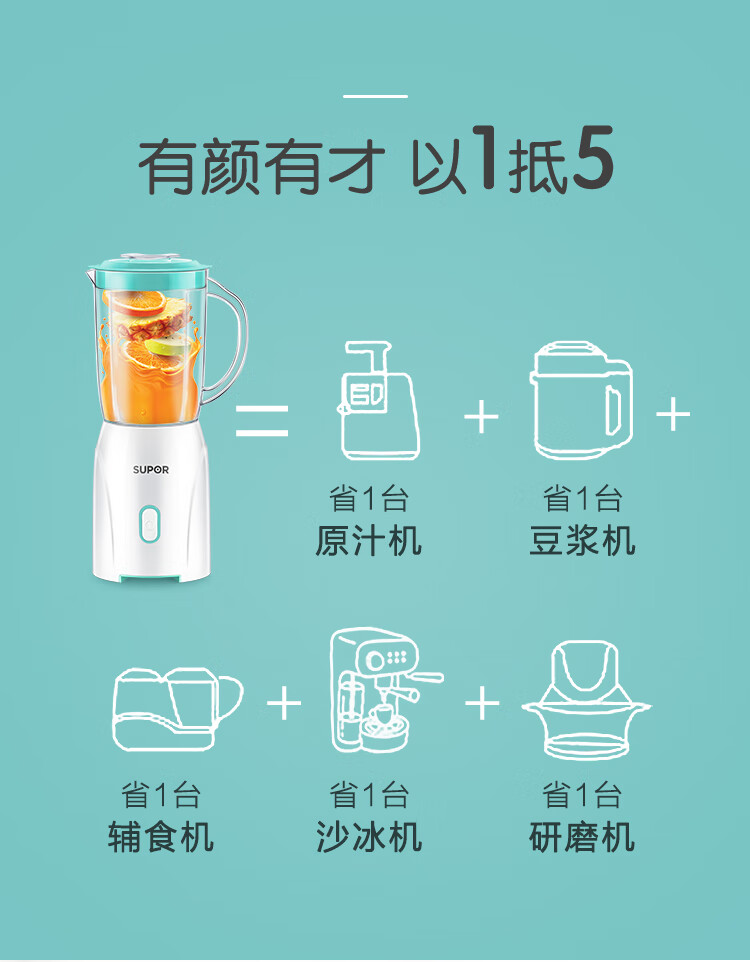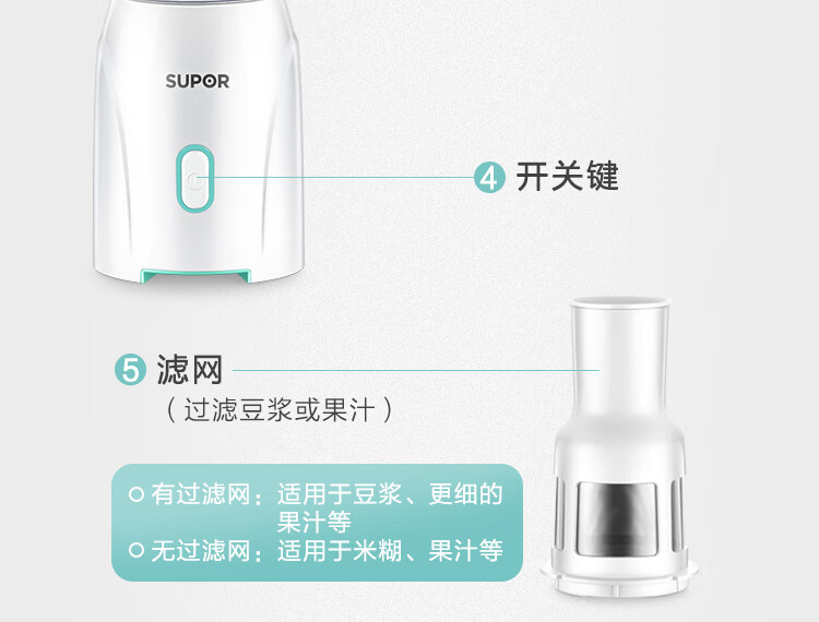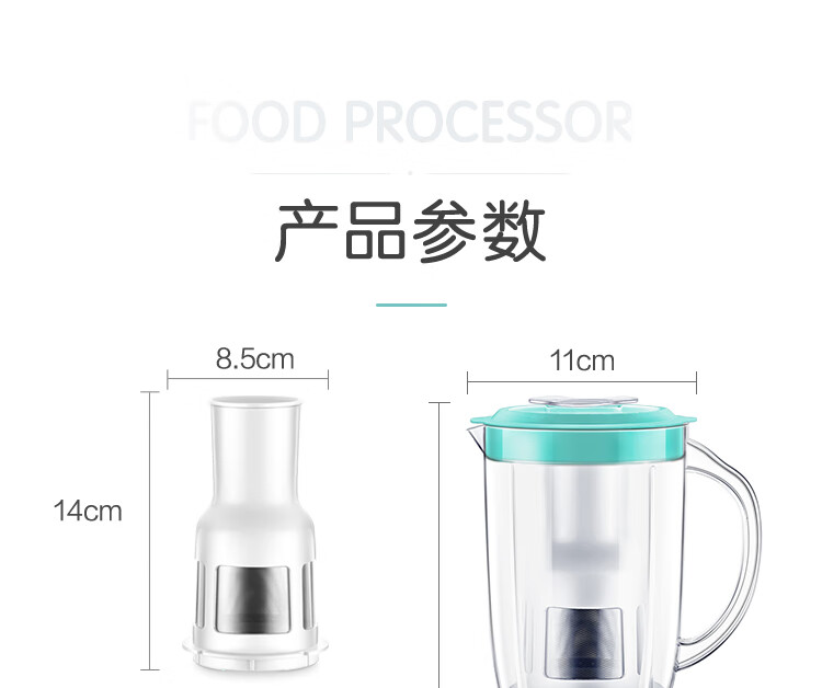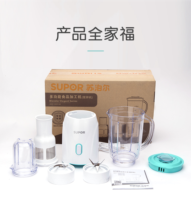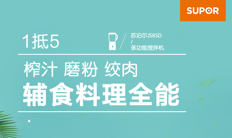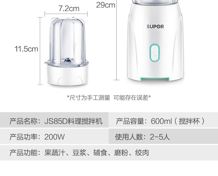 产品类别:料理/辅食机;操控方式:按键式;基础功能:碎肉,榨汁,研磨;特色功能:水料分离,婴儿辅食;档位调节:一档调节;加热方式:无加热功能;品牌:苏泊尔;颜色:蓝色;主杯容量(L):0.6L;内胆材质:pc食用级塑料;认证型号:JS85D-200;机身材质:tritan材质;产品尺寸(mm):110*110*290(手工测量,以实际为准);额定功率(W):200W;额定电压(V):220V;产品净重(kg):0kg;包装清单:主机*1、搅拌杯*1、滤网*1、绞肉杯组件*1、说明书*1;