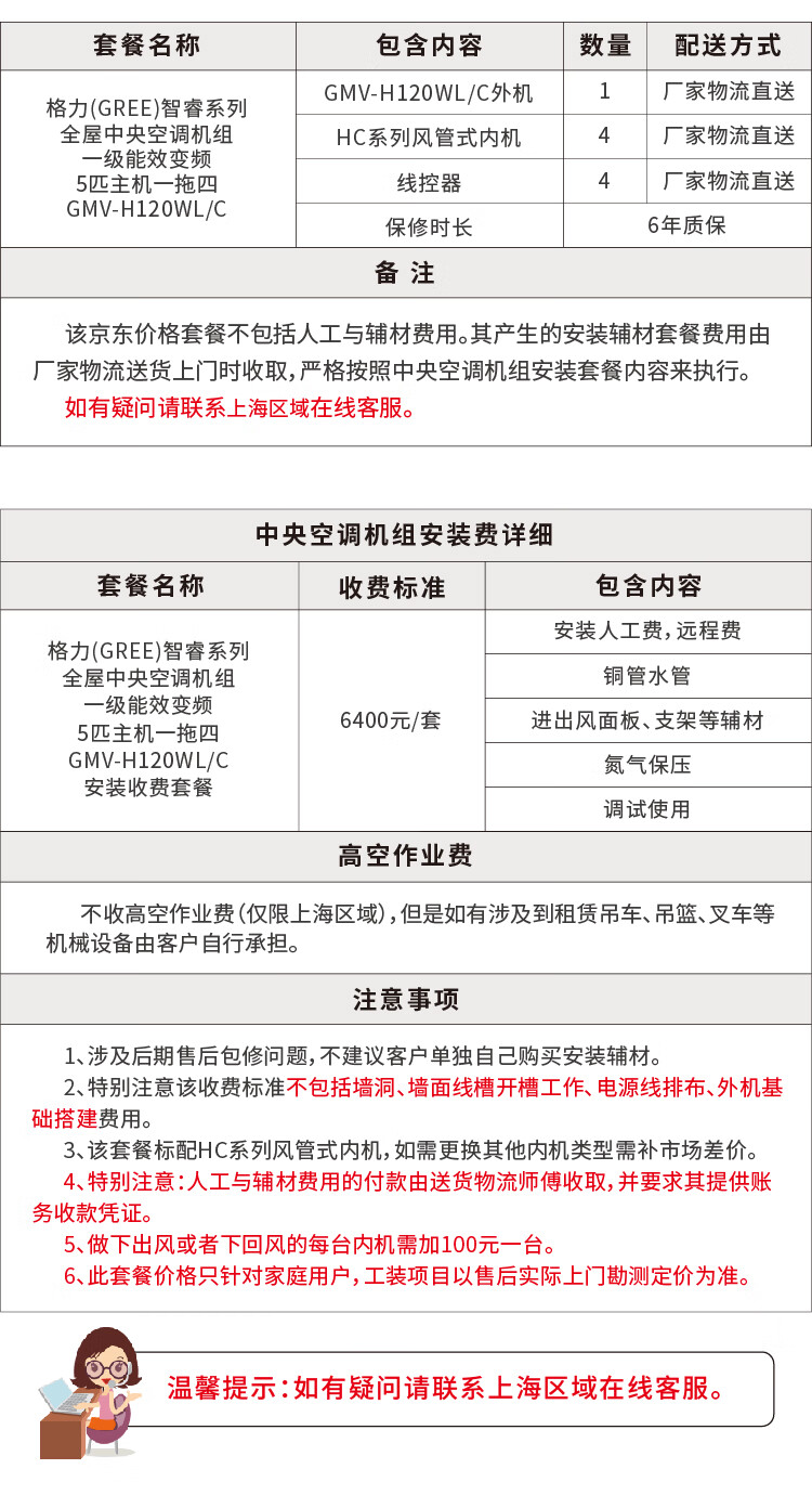 能效等级:一级能效;产品类型:多联机;变频/定频:变频;接入电源:220V;品牌:格力;系列:智睿;认证型号 认证型号:3C证书上的产品型号。:GMV-H120WL/C;产品型号 指的是商品出厂前的产品命名。:GMV-H120WL/C;电辅加热:支持电辅加热;制热功率(W) 指的是空调器进行制热交换式,额定时间内所消耗的总功率。:3000;制热量(W) 指空调在开启制热状态时,空调在单位时间内所能提供给室内的热量值总和。:14000;制冷功率(W) 指单位时间内制冷运行消耗的功率,一般指电功率。:3000;除湿量(L/h) 指单位时间内从密闭空间、房间或区域的空气中除去的水分,叫除湿量。单位:升/小时(L/H):/;外机噪音(dB(A) 指室外机空调器运转时都会产生的杂音,称为室内机噪音。:53;制冷量(W) 指的是空调进行制冷运行时,单位时间内从密闭空间、房间或区域内去除的热量总和,计量单位W(瓦):12000;内机重量(kg):/;内机尺寸(宽x高x深)mm:?*450*200;外机重量(kg):115;电压/频率 指的是产品所需的电压和频率,中国大陆是家用为220V和50HZ,工业为380V。:220V/50Hz;外机尺寸(宽x高x深)mm:900*340*1345;制冷剂 指是制冷循环的工作介质,利用制冷剂的相变来传递热量,既制冷剂在蒸发器中汽化时吸热,在冷凝器中凝结时放热。目前空调制冷剂有:R22、R410a、R32、R290等。:R410a;包装清单:GMV-H120WL/C一台 内机根据实际房型配置四台 线控器四台;