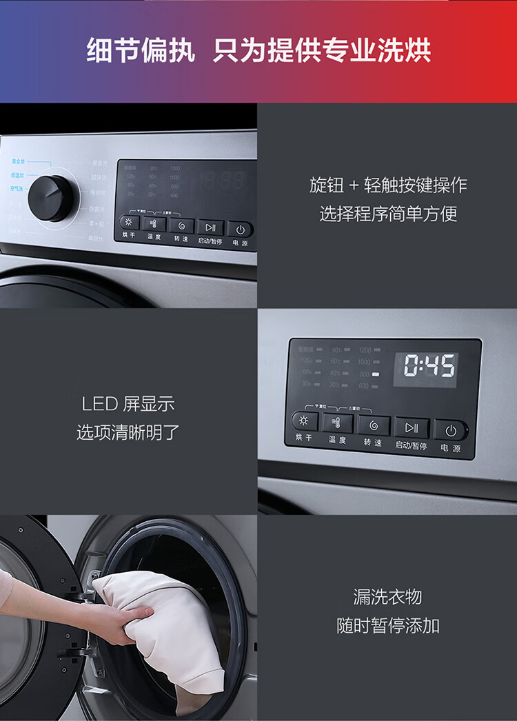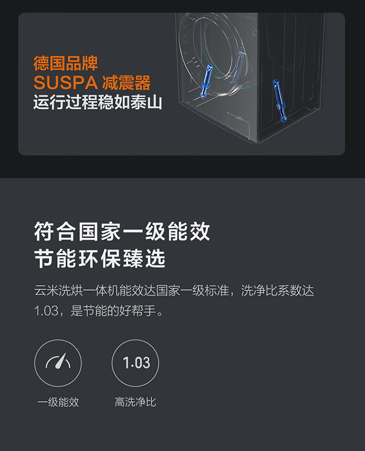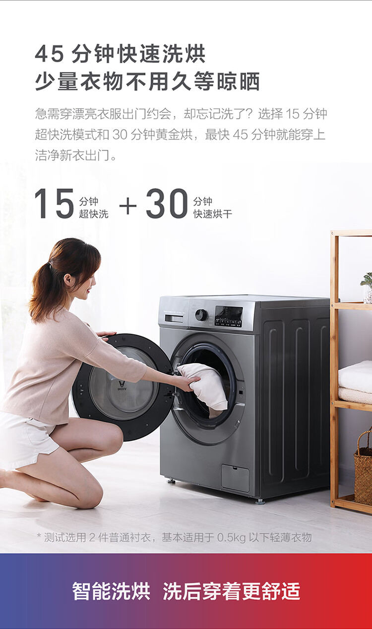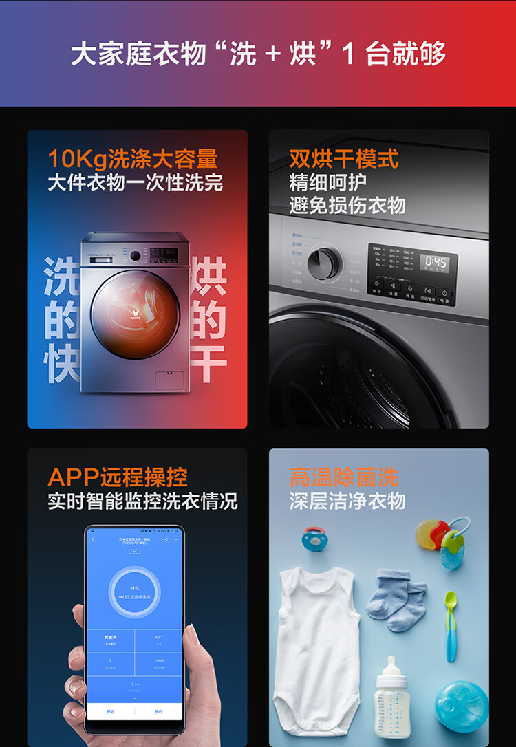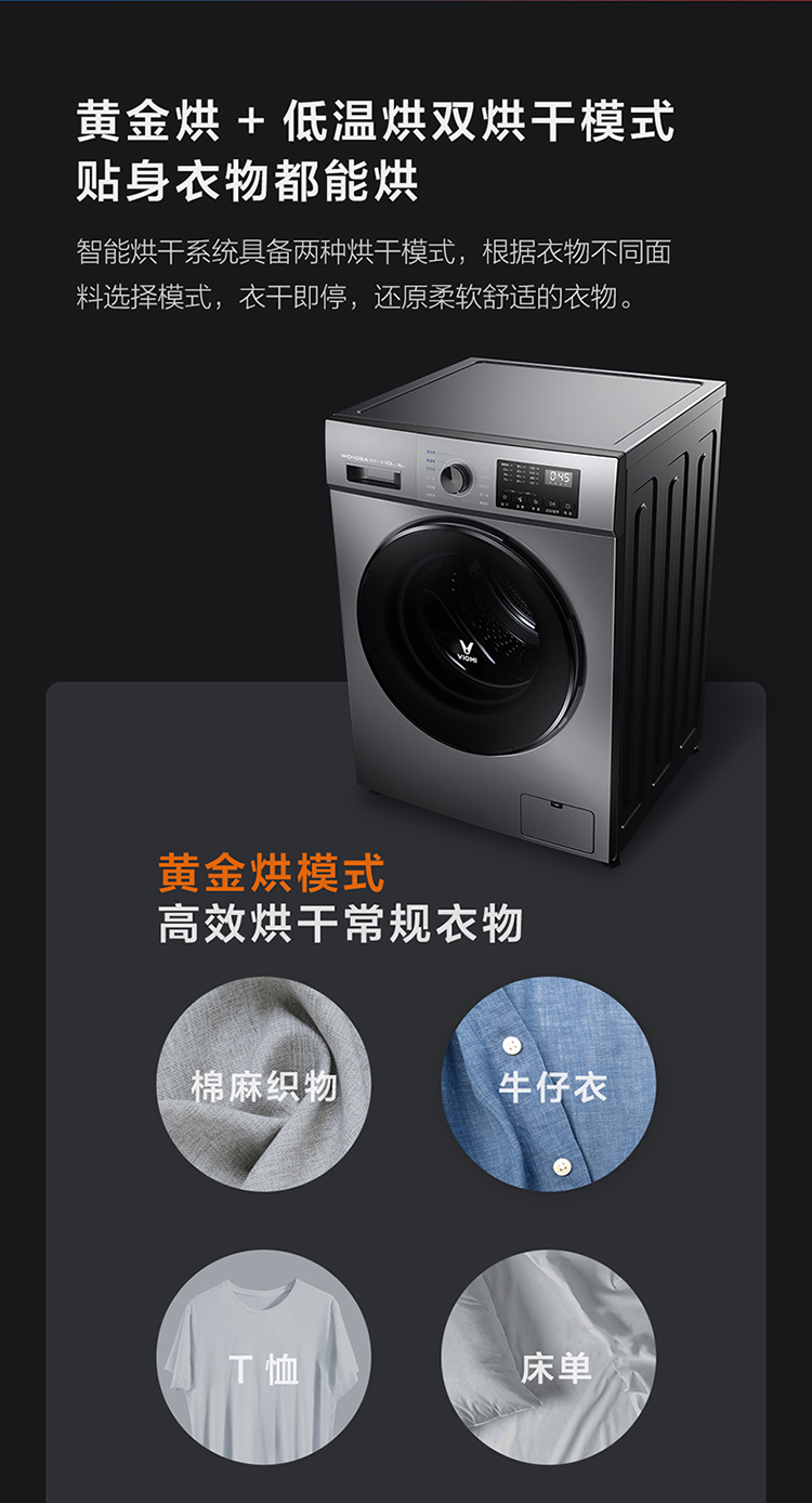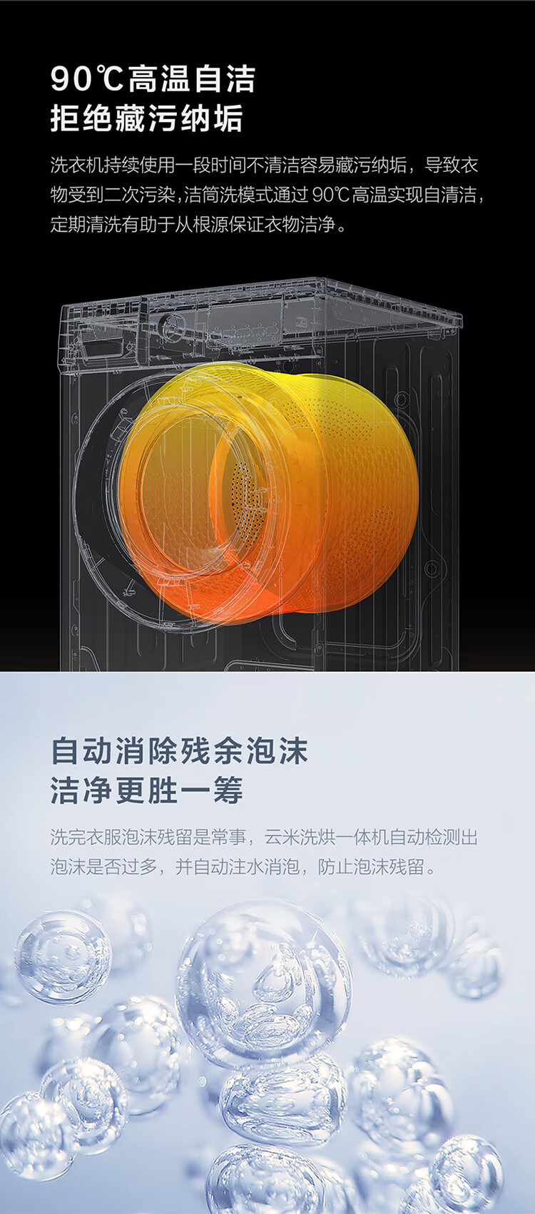 产品类型:洗烘一体;能效等级:一级能效;特色推荐:洗烘一体;颜色:银色;排水类型:上排水;产品渠道:线下同款;洗涤容量:10-20kg;用户优选:除菌;电机类型:变频(节能);开门方式:前开式;自动化程度 全自动:洗衣过程自动完成; 半自动:从洗涤到脱水需要人为操作。:全自动;品牌:云米/Viomi;产品类型:洗烘套装;操控方式 分为电脑控制(通过电子显示屏调节)和机械控制(通过机械旋钮或按钮调节)。:电脑控制;认证型号 认证型号:CCC证书上的产品型号信息。:WD10SA;排水方式:上排水;显示方式:LED数码屏显示;产品型号:WD10SA;产品尺寸(深×宽×高)mm:640*595*850;洗衣程序:黄金烘、低温烘、空气洗、羊毛、羽绒服、桶自洁、黄金洗、超快洗、棉织物、除菌洗、漂+脱、单脱水;能效等级 从1级到5级分别代表能效从高到低,能效越高越节能。:1级;包装尺寸(深x宽x高)mm:705*657*960;烘干容量(kg):6;水温调节范围:30;40;60;90;洗涤容量(kg):10;脱水容量(kg):10;内筒材质:不锈钢;包装清单:洗衣机*1 进水软管*1 扳手*1;