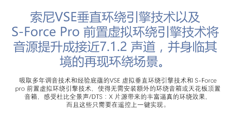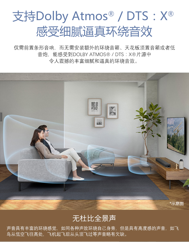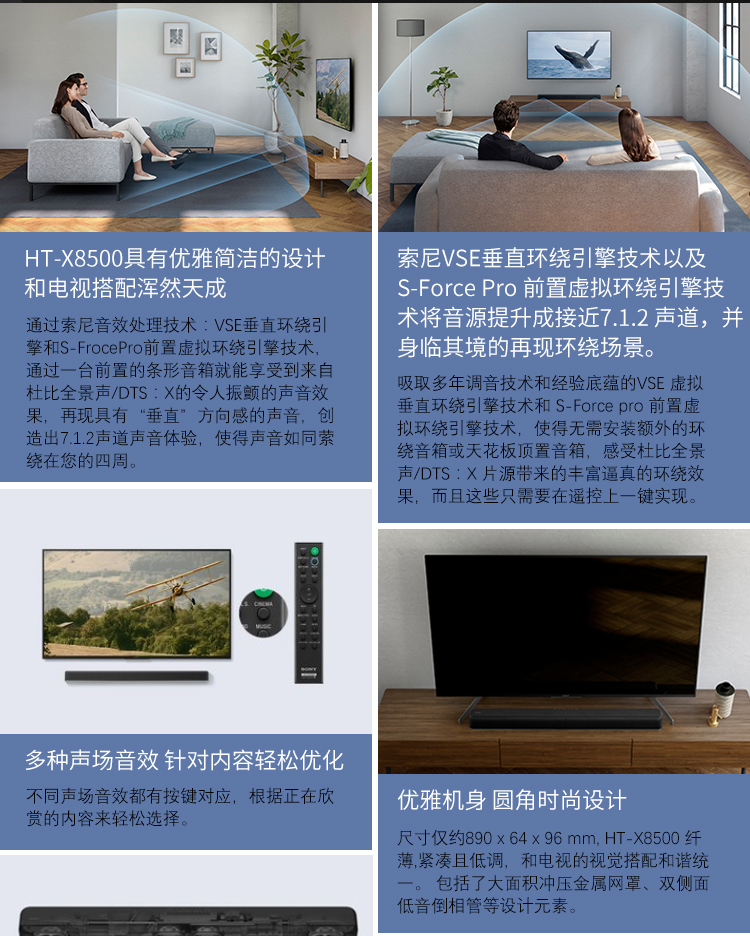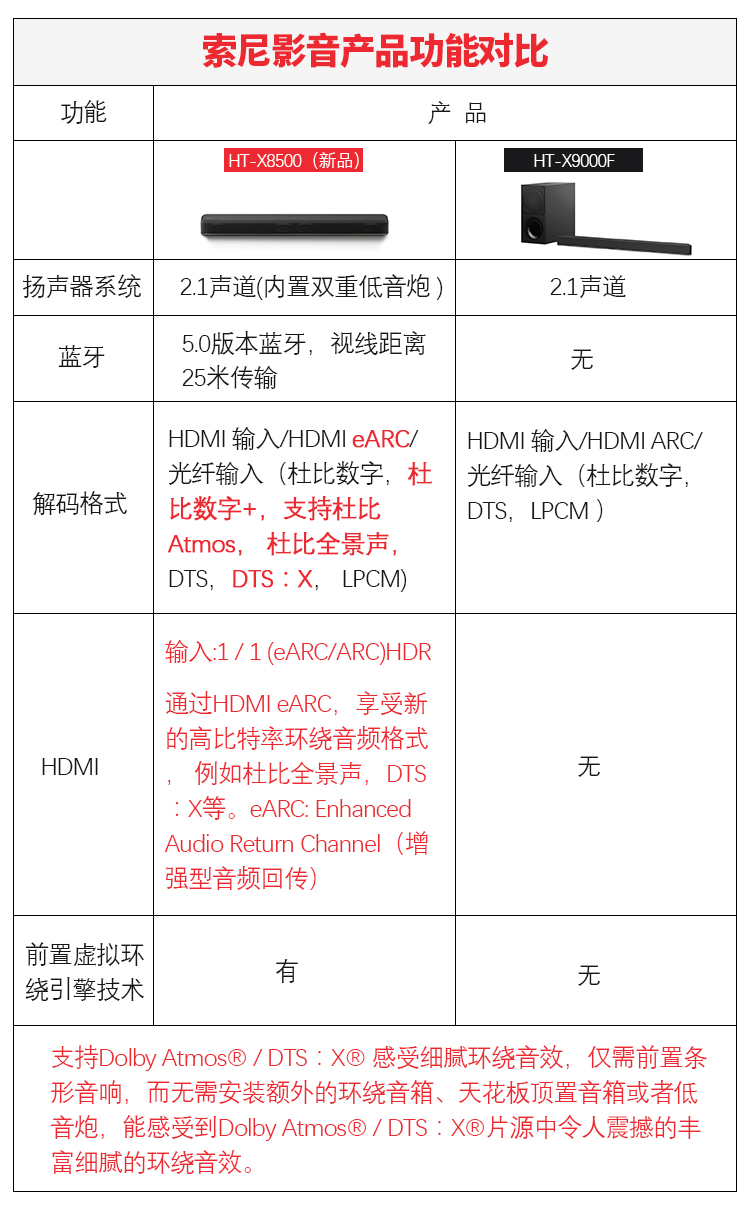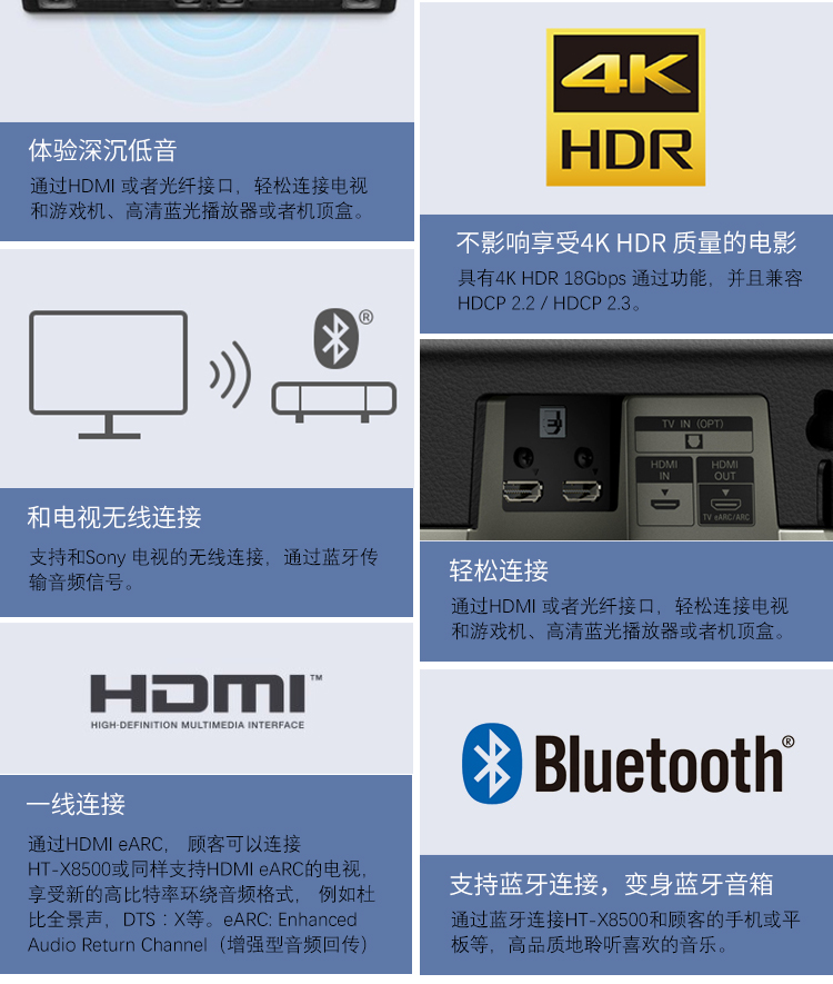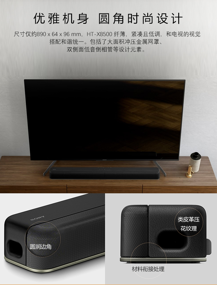 声道:2.1声道;产品类别:一体式回音壁;连接方式:HDMI;搭配电视尺寸:55英寸及以上;音响效果:杜比数字,虚拟环绕声;包装重量:5kg;主机重量:3.1kg;主机尺寸(长宽高):890mm x 64mm x 96mm;包装尺寸(长宽高):949mm(w) x 160mm(h) x 170mm(d);品牌:索尼(SONY);颜色:黑色;产品产地:马来西亚;产品型号:HT-X8500;光纤接口:光纤输入*1;HDMI:支持;高音单元:50mm*92mm;低音单元:2;放大器额定功率:128W;低音炮单元:50mm*92mm;音箱功率:64W;高音单元数量:2;低音炮单元数量:2;低音单元数量:2;低音炮功率:64W;支持解码:杜比数字,杜比数字+, 杜比全景声,DTS, DTS:X, LPCM;3D信号通过:支持;USB支持音频格式:不支持;HDMI待机直通:支持;蓝牙:支持;HDMI:HDMI eARC;包装清单:HT-X8500(1) 遥控(1) HDMI线缆(1) AAA电池(2) 电源适配器(1) 电源线(1) 壁挂安装模板(1) 快速入门指南(1) 产品说明书(1) 外包装(1) 保修卡(1);