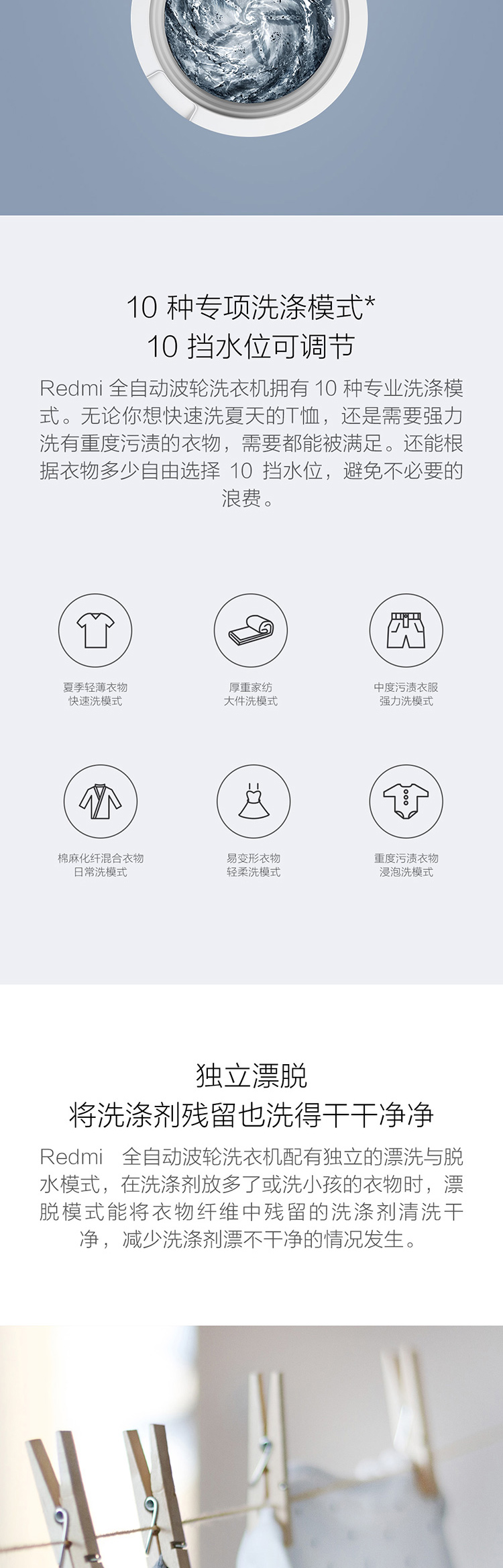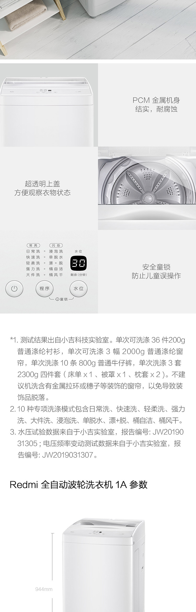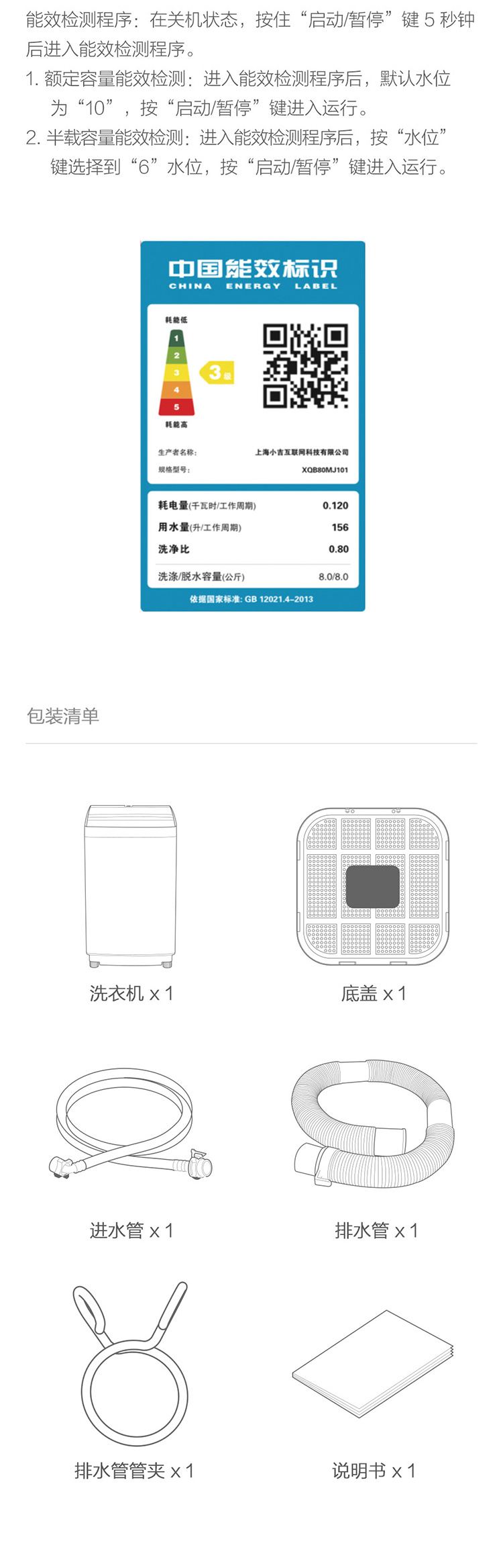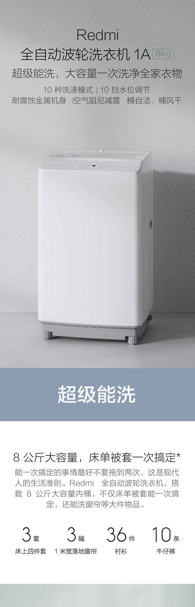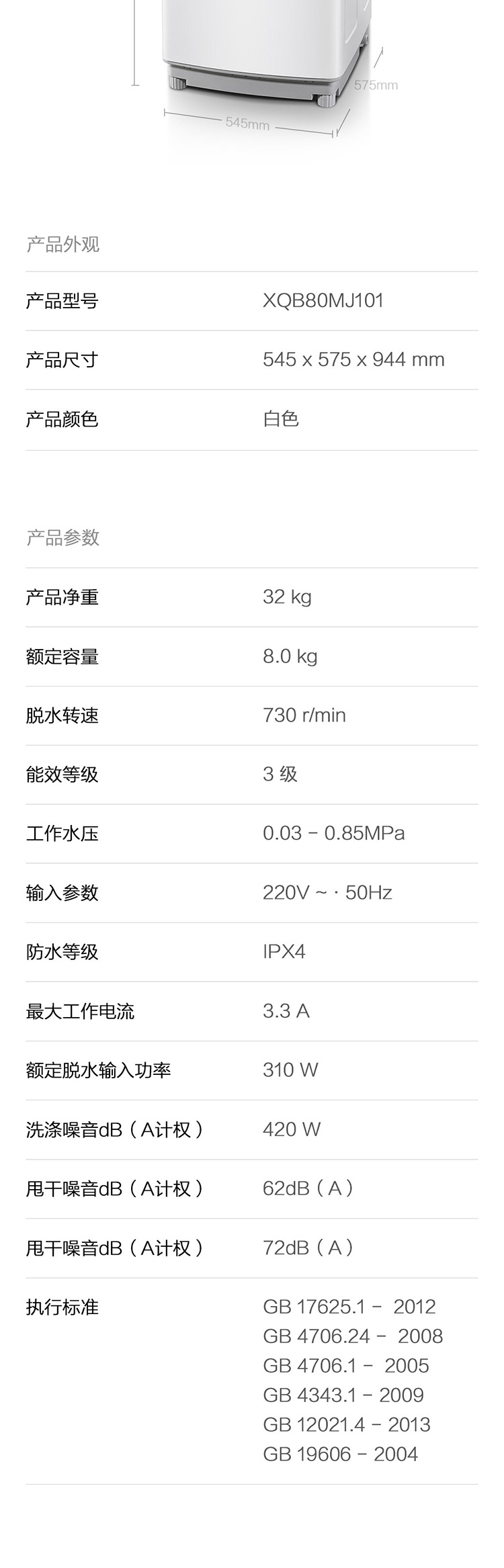 产品类型:波轮;能效等级:三级能效;特色推荐:大容量洗衣机;宽度:50.1-55cm;颜色:白色;排水类型:下排水;洗涤容量:8kg;高度:90cm以上;深度:55.1-60cm;电机类型:定频;特性:8kg大容量,10种洗涤模式;自动化程度 全自动:洗衣过程自动完成; 半自动:从洗涤到脱水需要人为操作。:全自动;开门方式:顶开式;品牌:Redmi;系列:Redmi;产品类型:波轮式;操控方式 分为电脑控制(通过电子显示屏调节)和机械控制(通过机械旋钮或按钮调节)。:电脑控制;认证型号 认证型号:CCC证书上的产品型号信息。:XQB80MJ101;排水方式:下排水;显示方式:LED数码屏显示;产品型号:XQB80MJ101;电源规格:220V/50HZ;能效等级 从1级到5级分别代表能效从高到低,能效越高越节能。:3级;包装尺寸(深x宽x高)mm:630mm*615mm*1020mm;洗净比 洗净比越高,洗出来的衣物越干净。:0.8;箱体材质:钢板;烘干容量(kg):0;洗涤容量(kg):8kg;脱水容量(kg):8KG;标准程序耗水量:156L/工作周期;标准程序耗电量:0.12kwh/工作周期;内筒材质:不锈钢;洗涤功率(W):420W;产品尺寸(深×宽×高)mm:575mm*545mm*944mm;烘干功率(W):0;脱水转速:730r/min;洗衣程序:日常洗 浸泡洗 快速洗 单脱水 轻柔洗 漂+脱 强力洗 桶自洁 大件洗 桶风干;水位选择(段):10档;脱水功率(W):310W;水温调节范围:常温;产品重量(kg):32kg;电辅加热洗涤:不支持电辅加热洗涤;防缠绕:支持防缠绕;空气洗:不支持空气洗;智能断电记忆:支持智能断电记忆;排水阀漏水保护:支持排水阀漏水保护;筒自洁:支持筒自洁;干衣功能:不支持烘干/风干;自动断电 洗涤过程结束后,机器自动断电,不会一直待机。:支持自动断电;预约功能:不支持预约功能;中途添衣:支持中途添衣;脱水功能:支持脱水功能;儿童安全锁:支持儿童安全锁;进水阀漏水保护:支持进水阀漏水保护;电辅加热烘干:不支持电辅加热烘干;包装清单:洗衣机*1 底盖*1 进水管*1 排水管*1 排水管管夹*1 说明书*1;