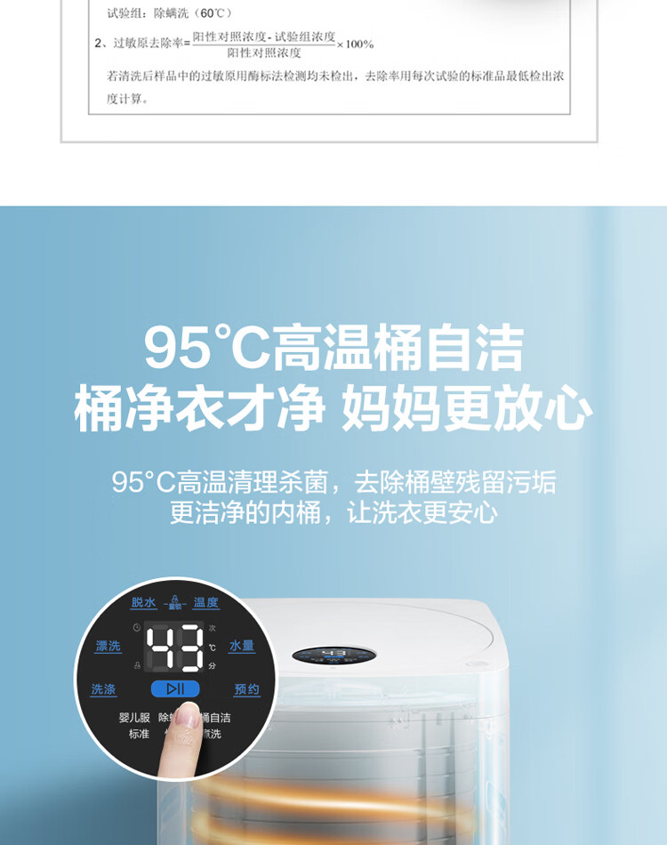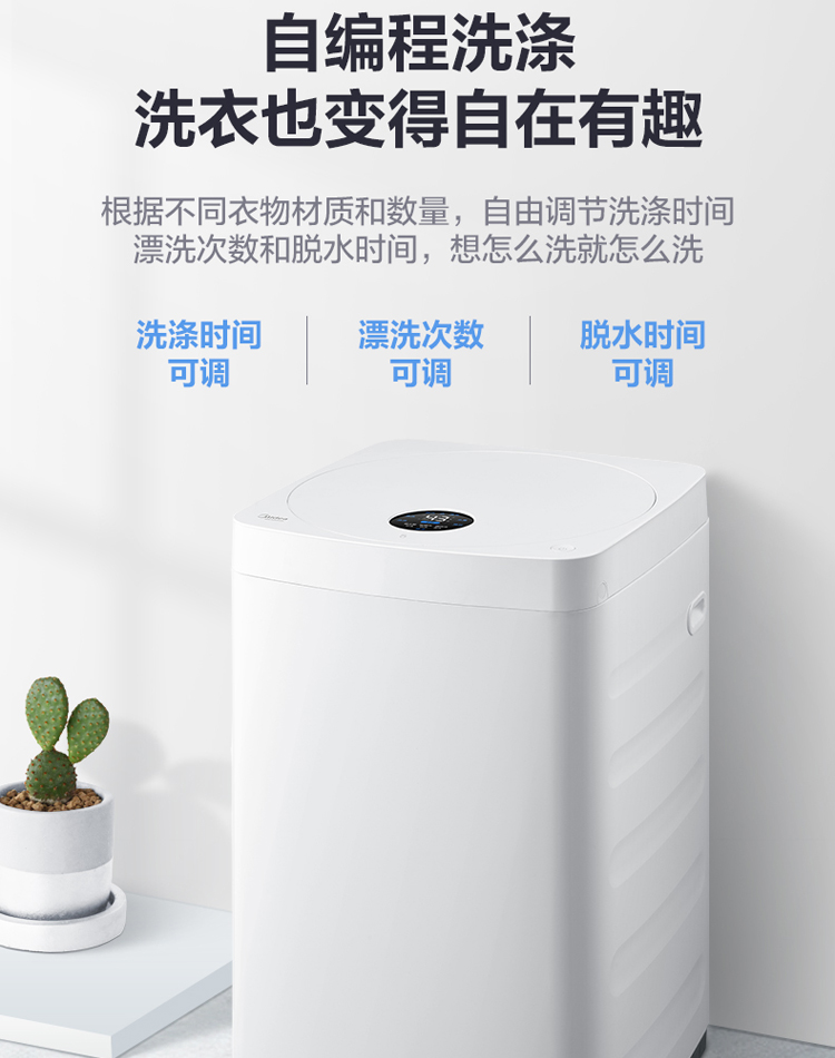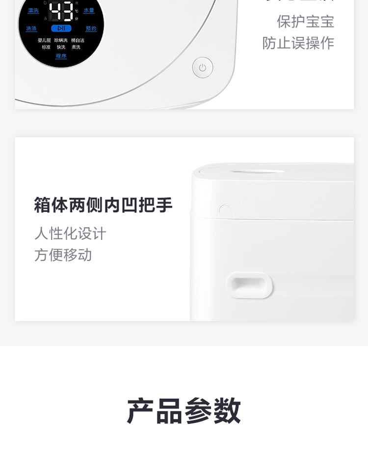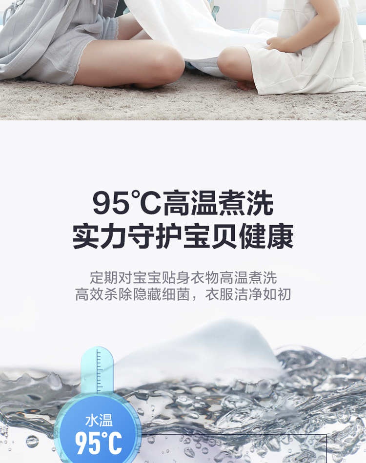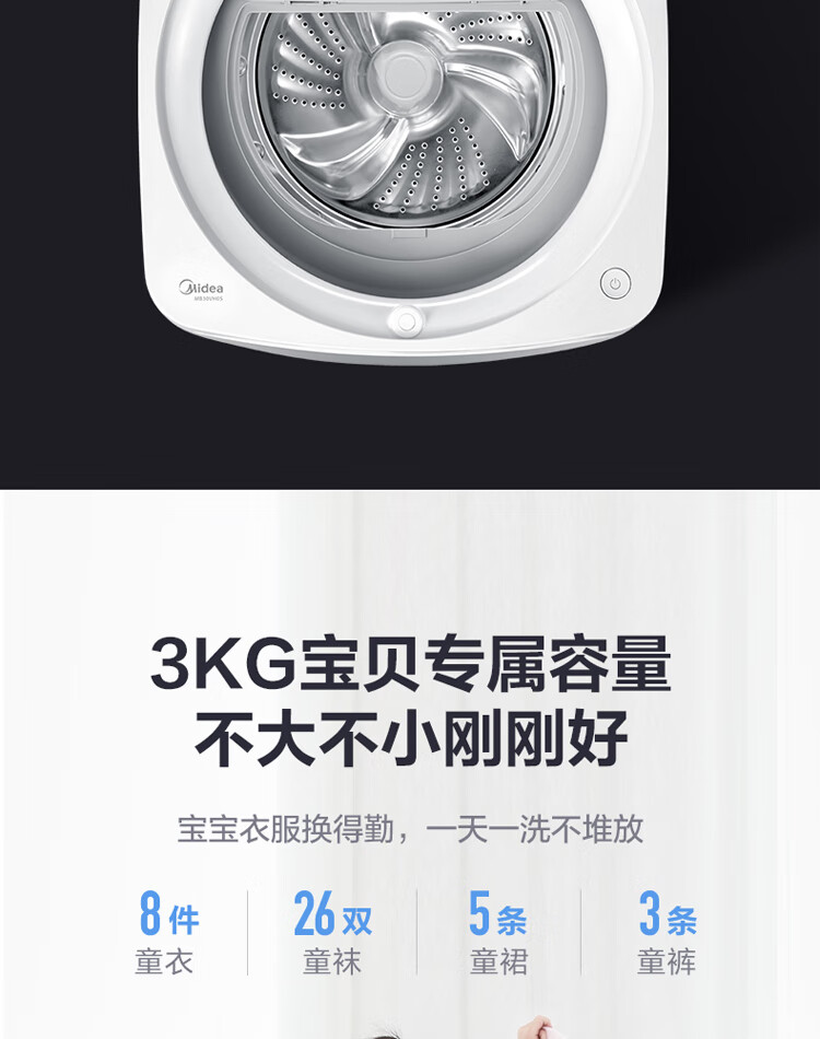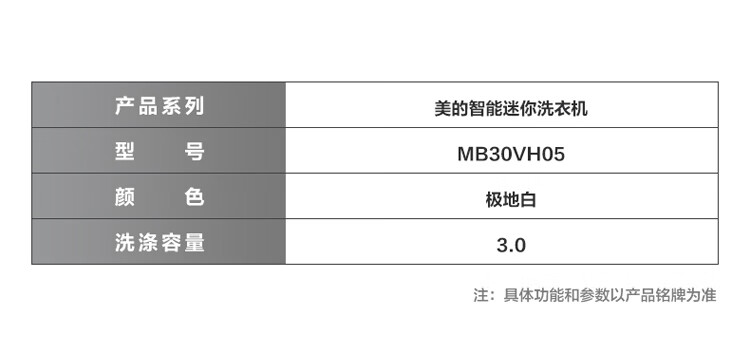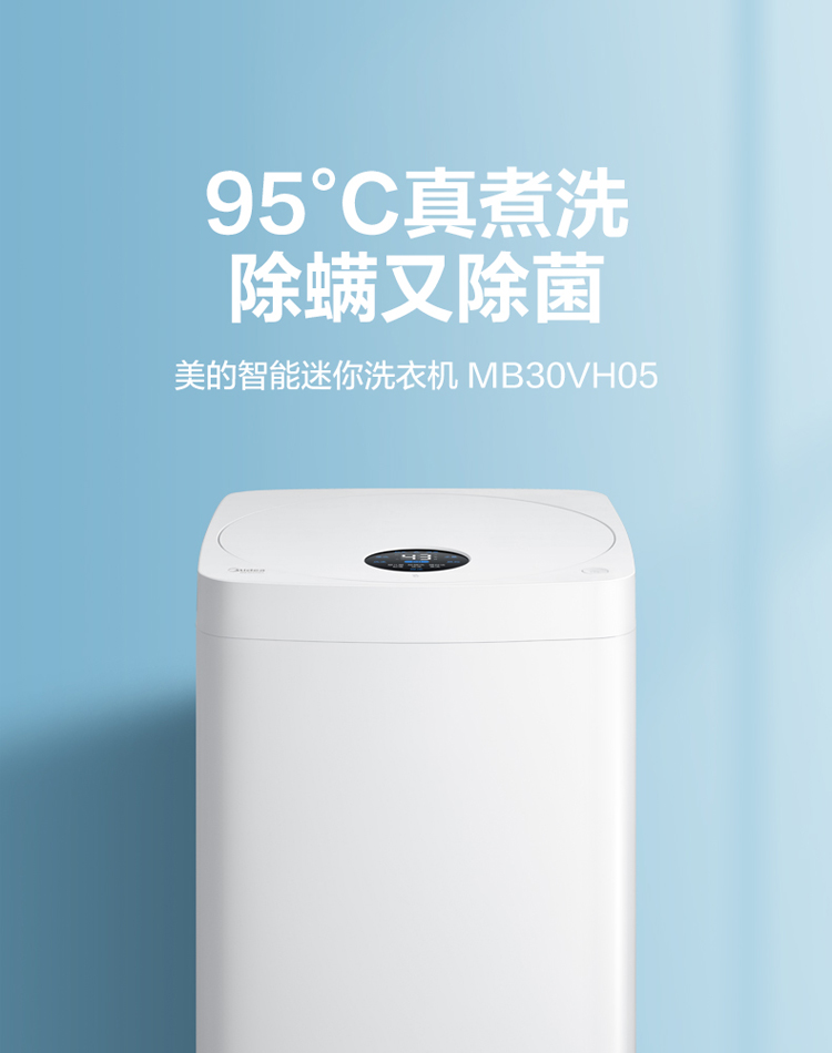 产品类型:母婴洗;能效等级:三级能效;宽度:50cm及以下;颜色:白色;排水类型:下排水;洗涤容量:5kg及以下;高度:70.1-75cm;深度:50cm及以下;用户优选:延保服务;电机类型:定频;特性:婴儿服 除螨洗 煮洗;自动化程度 全自动:洗衣过程自动完成; 半自动:从洗涤到脱水需要人为操作。:全自动;开门方式:顶开式;品牌:美的;系列:手搓洗;产品类型:波轮式;颜色:白色;操控方式 分为电脑控制(通过电子显示屏调节)和机械控制(通过机械旋钮或按钮调节)。:电脑控制;认证型号 认证型号:CCC证书上的产品型号信息。:MB30VH05;排水方式:下排水;显示方式:LED数码屏显示;产品型号:MB30VH05;电源规格:220V/50Hz;能效等级 从1级到5级分别代表能效从高到低,能效越高越节能。:3级;包装尺寸(深x宽x高)mm:520*520*840;洗净比 洗净比越高,洗出来的衣物越干净。:0.80;箱体材质:彩钢;洗涤容量(kg):3;内筒材质:不锈钢;洗涤功率(W):200;产品尺寸(深×宽×高)mm:450*430*750;洗衣程序:婴儿服 除螨洗 煮洗 快洗 桶自洁 标准;水位选择(段):高中低;脱水功率(W):200;水温调节范围:常温;30;40;50;60;95;产品重量(kg):22;排水阀漏水保护:支持排水阀漏水保护;电辅加热洗涤:支持电辅加热洗涤;筒自洁:支持筒自洁;自动断电 洗涤过程结束后,机器自动断电,不会一直待机。:支持自动断电;预约功能:支持预约功能;中途添衣:支持中途添衣;脱水功能:支持脱水功能;儿童安全锁:支持儿童安全锁;智能断电记忆:支持智能断电记忆;进水阀漏水保护:支持进水阀漏水保护;包装清单:洗衣机×1、说明书×1、保修卡×1、进水管×1;