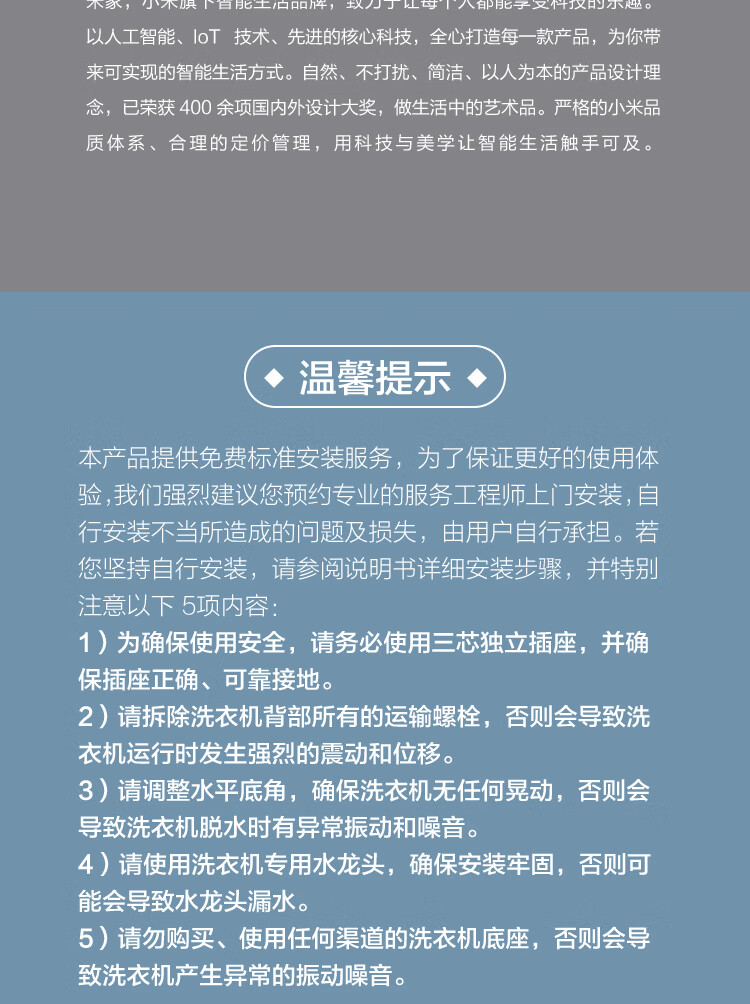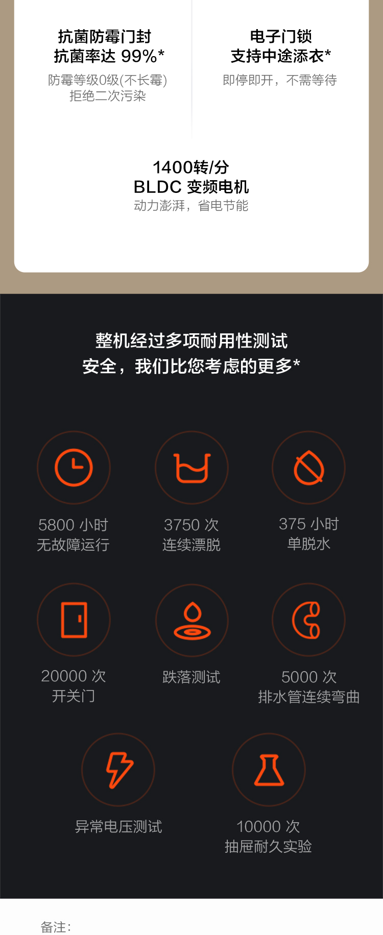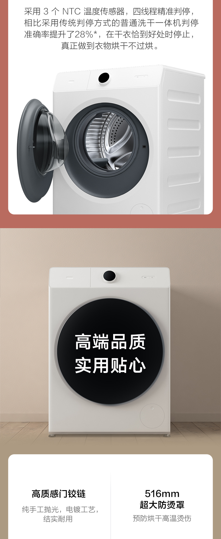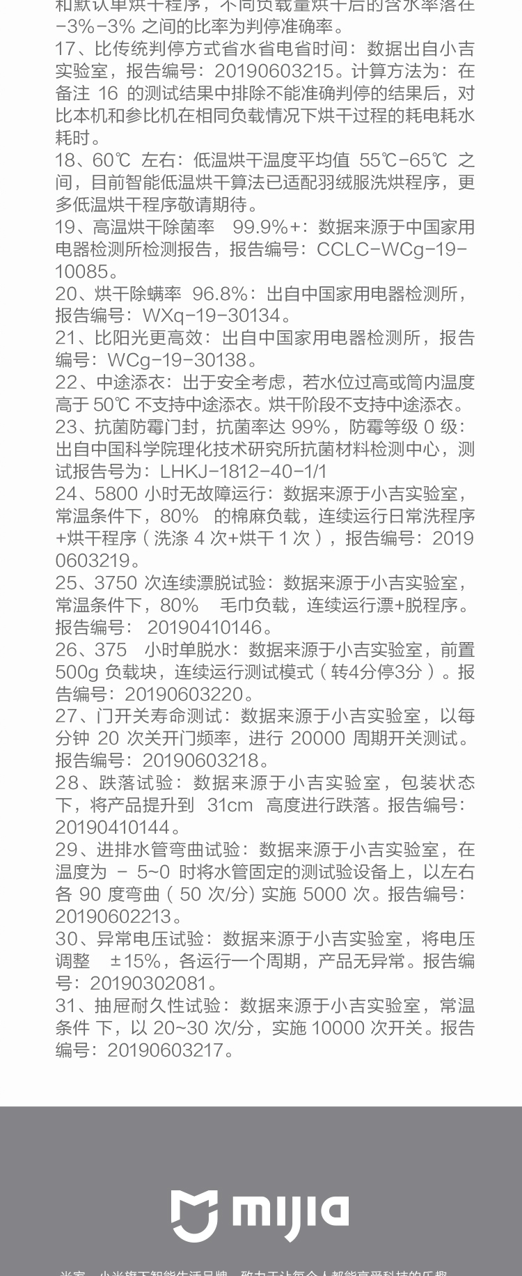 产品类型:滚筒;能效等级:一级能效;特色推荐:大容量洗衣机,洗烘一体,滚筒洗衣机;宽度:55.1-60cm;颜色:白色;排水类型:上排水;洗涤容量:10-20kg;高度:80.1-85cm;深度:60cm以上;用户优选:除菌;电机类型:变频(节能);特性:空气洗,支持小爱语音遥控;自动化程度 全自动:洗衣过程自动完成; 半自动:从洗涤到脱水需要人为操作。:全自动;开门方式:前开式;品牌:米家(MIJIA);系列:全自动滚筒式洗衣干衣机;产品类型:滚筒式;颜色:白色;操控方式 分为电脑控制(通过电子显示屏调节)和机械控制(通过机械旋钮或按钮调节)。:电脑控制;认证型号 认证型号:CCC证书上的产品型号信息。:XHQG100MJ11;排水方式:上排水;显示方式:LED数码屏显示;产品型号:XHQG100MJ11;电源规格:220V~50Hz;能效等级 从1级到5级分别代表能效从高到低,能效越高越节能。:1级;包装尺寸(深x宽x高)mm:725mm*668mm*940mm;洗净比 洗净比越高,洗出来的衣物越干净。:1.05;箱体材质:钢板;烘干容量(kg):6kg;洗涤容量(kg):10kg;脱水容量(kg):10kg;标准程序耗水量:70L/工作周期;标准程序耗电量:0.972kwh/工作周期;内筒材质:不锈钢;洗涤功率(W):150W;产品尺寸(深×宽×高)mm:665mm*598mm*850mm;烘干功率(W):1200W;脱水转速:1400r/min;洗衣程序:日常洗、快速洗、轻柔洗、强力洗、大件洗、单脱水、空气洗、洗+烘、单烘干、筒自洁、 自定义;水位选择(段):3;脱水功率(W):650W;水温调节范围:常温;30;40;60;95;产品重量(kg):75kg;电辅加热洗涤:支持电辅加热洗涤;防缠绕:支持防缠绕;空气洗:支持空气洗;智能断电记忆:支持智能断电记忆;排水阀漏水保护:支持排水阀漏水保护;筒自洁:支持筒自洁;干衣功能:支持烘干/风干;自动断电 洗涤过程结束后,机器自动断电,不会一直待机。:支持自动断电;预约功能:支持预约功能;中途添衣:支持中途添衣;脱水功能:支持脱水功能;儿童安全锁:支持儿童安全锁;进水阀漏水保护:支持进水阀漏水保护;电辅加热烘干:支持电辅加热烘干;包装清单:洗衣机*1、进水管*1、排水管*1、夹箍*1、排水管支架*1、说明书*1、
