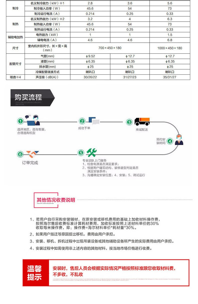 能效等级:一级能效;产品类型:多联机;操控方式:遥控式;冷暖类型:冷暖;变频/定频:变频;适用户型:三室一厅;产品特色:智能空调,超薄内机,全直流变频,静音空调;接入电源:220V;产品匹数:5匹;品牌:海尔 haier;系列:全直流变频馨享系列;认证型号 认证型号:3C证书上的产品型号。:RFC125MXSAVB(F);产品型号 指的是商品出厂前的产品命名。:RFC125MXSAVB(F);电辅加热:支持电辅加热;制热功率(W) 指的是空调器进行制热交换式,额定时间内所消耗的总功率。:3500;适用面积 指的该产品建议使用的房间面积大小。请综合考虑房间面积大小、密封保温条件好坏、楼层、朝向、层高等因素,选购适合您的匹数。如您家中处于顶楼、或使用空调房间密闭性一般、处于阳光长时照射建议选购大一个匹数段的产品。:65-95平米;制热量(W) 指空调在开启制热状态时,空调在单位时间内所能提供给室内的热量值总和。:14000;变频机能效比 指的是名义制冷量(制热量)与运行功率之比,采用的是SEER或者是APF作为能效考核指标,建议参照GB/T21455、GB/T7725和GB/T17758的附录相关内容。:6.6;制冷功率(W) 指单位时间内制冷运行消耗的功率,一般指电功率。:3560;除湿量(L/h) 指单位时间内从密闭空间、房间或区域的空气中除去的水分,叫除湿量。单位:升/小时(L/H):1850;外机噪音(dB(A) 指室外机空调器运转时都会产生的杂音,称为室内机噪音。:53;制冷量(W) 指的是空调进行制冷运行时,单位时间内从密闭空间、房间或区域内去除的热量总和,计量单位W(瓦):12500;内机重量(kg):28;内机尺寸(宽x高x深)mm:850x180x420;1170x180x420;外机重量(kg):85;电压/频率 指的是产品所需的电压和频率,中国大陆是家用为220V和50HZ,工业为380V。:220V/50Hz;外机尺寸(宽x高x深)mm:950*970*450;制冷剂 指是制冷循环的工作介质,利用制冷剂的相变来传递热量,既制冷剂在蒸发器中汽化时吸热,在冷凝器中凝结时放热。目前空调制冷剂有:R22、R410a、R32、R290等。:R410a;包装清单:室外机组×1;说明书×1;装箱单×1;减震橡胶垫×4;走线护套×1;合格证×1;保修说明×1;排