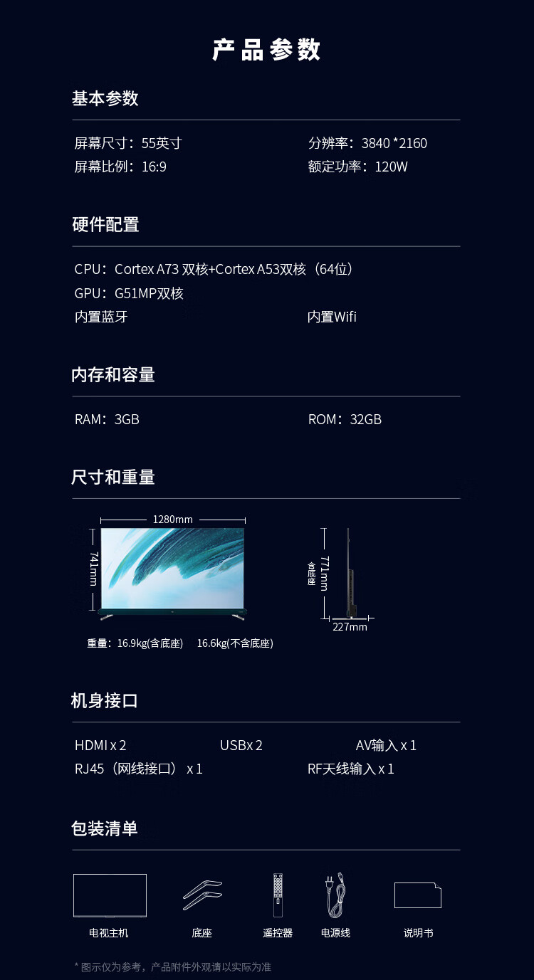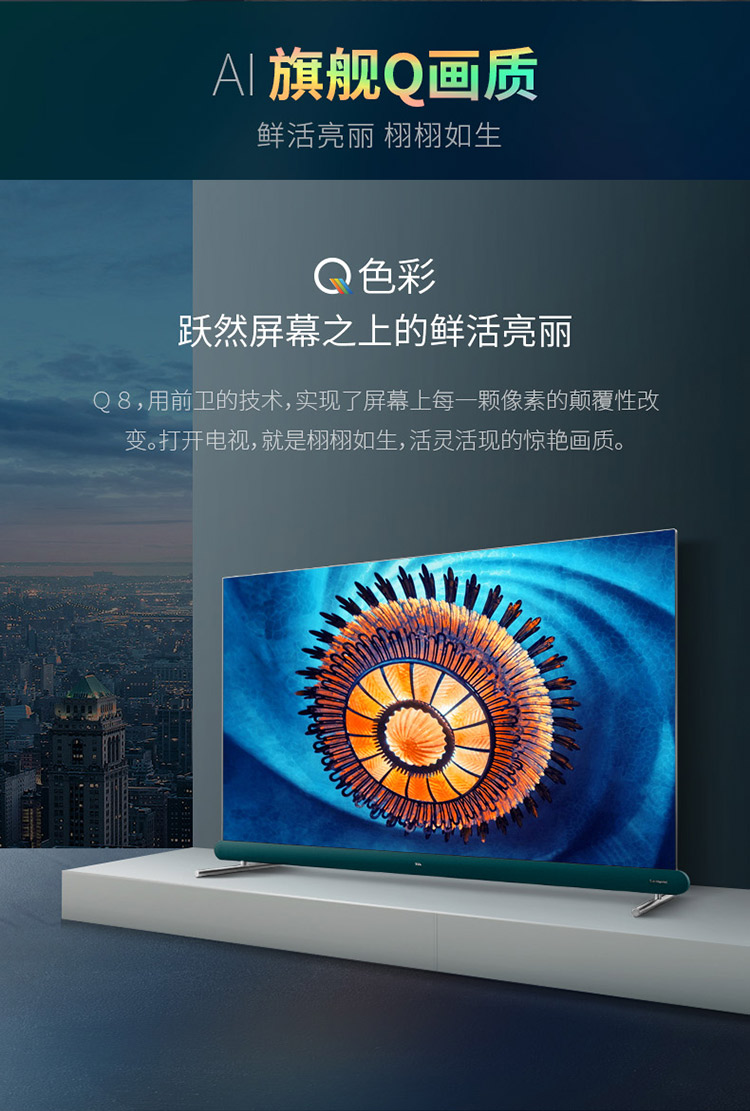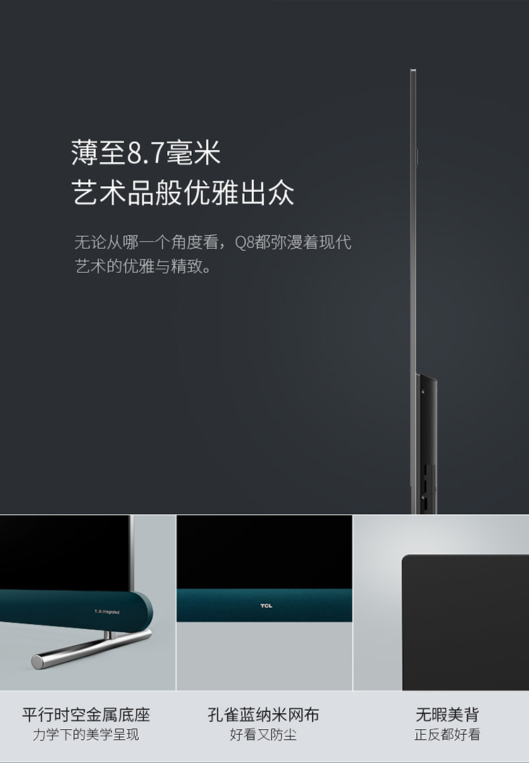 能效等级:二级能效;屏幕尺寸:55英寸;产品渠道:线上专供;选购指数:10.0-8.0;品牌类型:国产品牌;电视类型:教育电视,智慧屏,全面屏,4K超清,超薄;用户优选:新品电视;分辨率:4k超高清(3840×2160);观看距离:2.5m-3m(46-55英寸);手势控制:不支持;语音控制:支持;HDR显示:支持;屏幕类别:软屏;支持格式(高清):2160p;屏幕尺寸:55英寸;屏幕比例:16:9;背光方式 背光源是位于液晶显电视背后的一种光源,主要分为侧入式和直下式; 侧入式背光源指的把LED背光放置在屏幕的侧面,通过导光板点亮屏幕。一般侧入式背光的电视更轻薄。 直下式背光源是把LED做成密集的点阵,放置在屏幕的背后,直接照射屏幕。一般色域更好,图像效果更自然,对漏光控制更好,但是机身稍厚。 在一般的电视上,两种背光方式在感官上并没有太大区别,无需作为选购的主要标准。:侧入式;响应时间:8ms;扫描方式:逐行扫描;屏幕分辨率:超高清4K;背光源 背光源是位于液晶显电视背后的一种光源,主要分为侧入式和直下式; 侧入式背光源指的把LED背光放置在屏幕的侧面,通过导光板点亮屏幕。一般侧入式背光的电视更轻薄。 直下式背光源是把LED做成密集的点阵,放置在屏幕的背后,直接照射屏幕。一般色域更好,图像效果更自然,对漏光控制更好,但是机身稍厚。 在一般的电视上,两种背光方式在感官上并没有太大区别,无需作为选购的主要标准。:LED;刷屏率:60HZ;上市时间:2019-04;产品颜色:黑色;产品类型:全面屏电视;人工智能电视;超薄电视;4K超清电视;智慧屏电视;能效等级:二级能效;认证型号 认证型号:3C证书上的产品型号。:55Q8;产品品牌:TCL;产品型号:55Q8;USB2.0接口:2;光纤音频输出:不支持;USB3.0接口:无;HDMI2.1接口:无;HDMI1.4接口:无;HDMI2.0接口:2;HDMI1.3接口:无;扬声器数量:2个;多声道功能:多声道;输出功率:16W;单屏重量(kg):16.6;外包装尺寸(宽*高*厚)mm:1400*875*150;单屏尺寸(宽*高*厚)mm:1280*741*78;含底座重量(kg):16.9;含外包装重量(kg):21.1;含底座尺寸(宽*高*厚)mm:1280*771*227;机身厚薄:机身最薄处8.7mm;安装孔距:2
