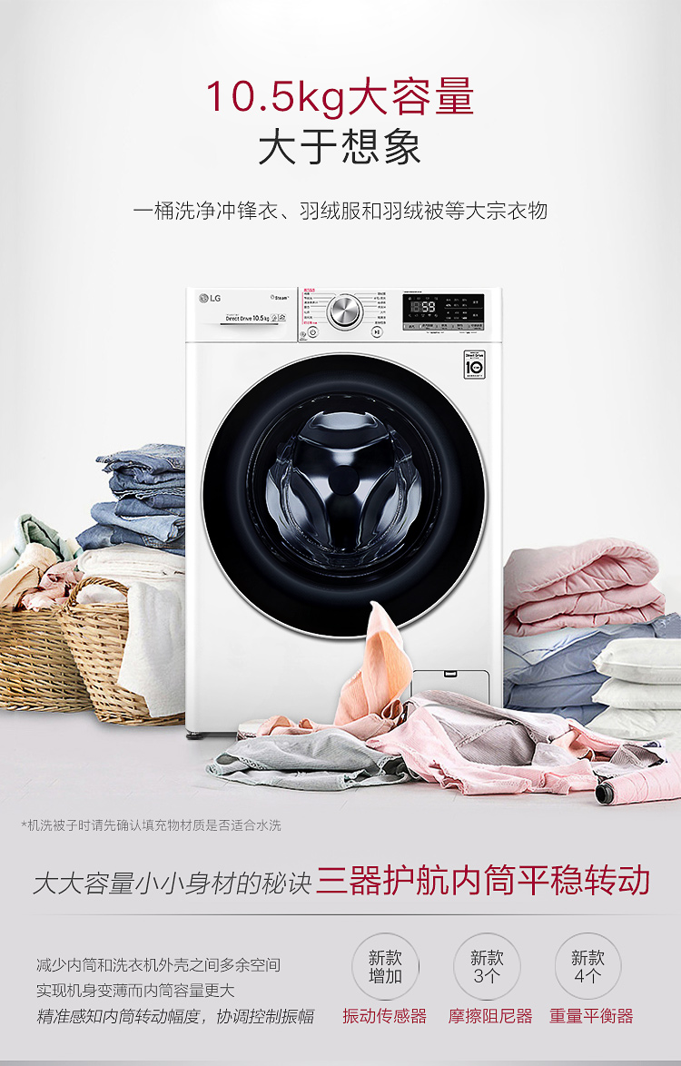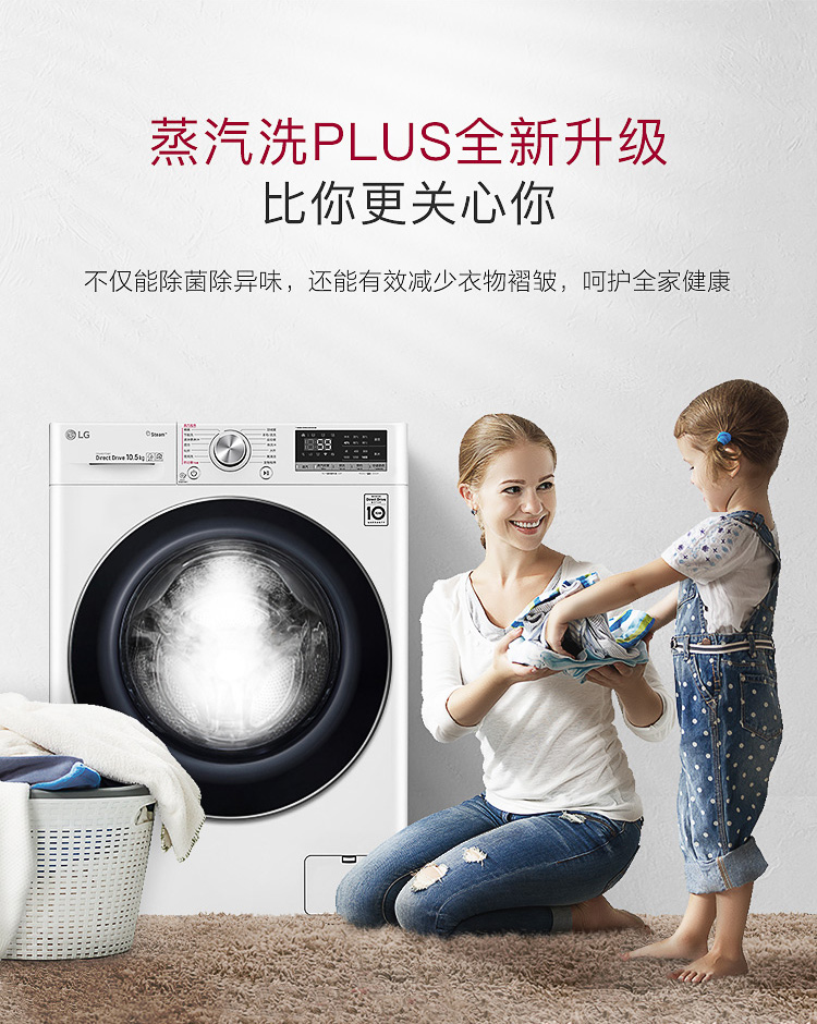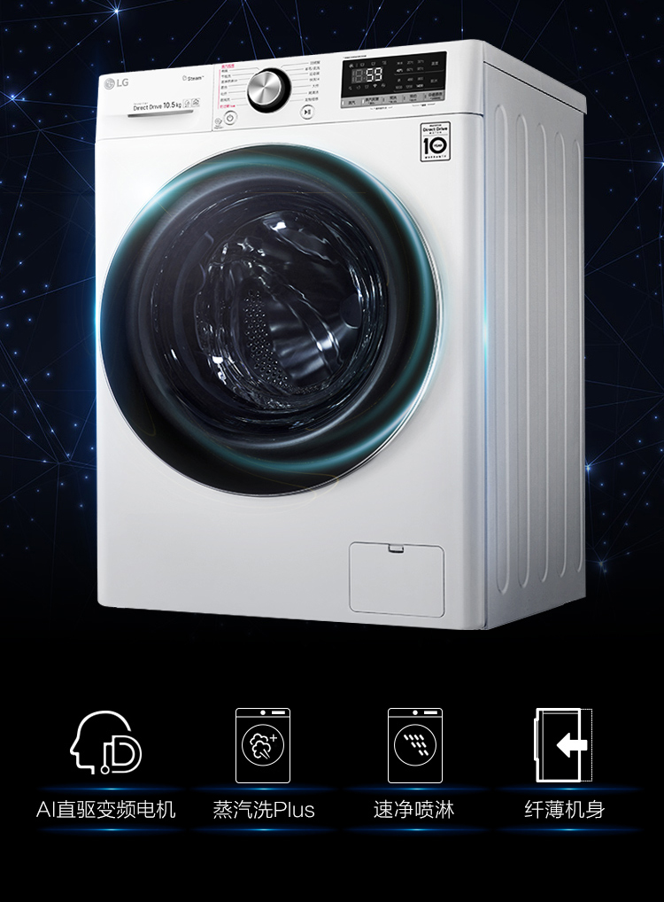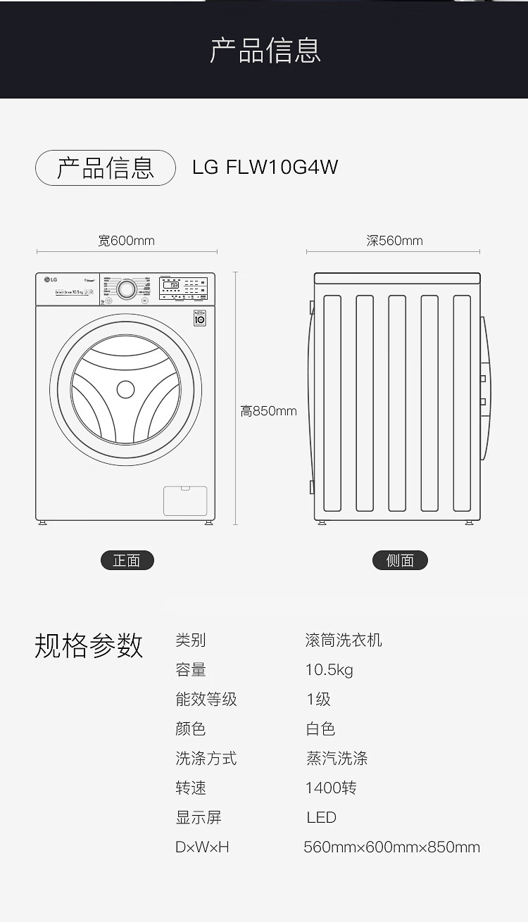产品类型:滚筒;能效等级:一级能效;特色推荐:大容量洗衣机,滚筒洗衣机;宽度:55.1-60cm;颜色:白色;排水类型:上排水;产品渠道:线下同款;洗涤容量:10-20kg;高度:80.1-85cm;深度:55.1-60cm;用户优选:延保服务,高端洗衣机,除菌;电机类型:变频(节能);特性:大容量,蒸汽除菌除皱,速净喷淋;自动化程度 全自动:洗衣过程自动完成; 半自动:从洗涤到脱水需要人为操作。:全自动;开门方式:前开式;品牌:LG;系列:VC3;产品类型:滚筒式;颜色:白色;操控方式 分为电脑控制(通过电子显示屏调节)和机械控制(通过机械旋钮或按钮调节)。:电脑控制;认证型号 认证型号:CCC证书上的产品型号信息。:FLW10G4W;排水方式:上排水;电机类型:直驱变频电机;显示方式:LED数码屏显示;产品型号:FLW10G4W;电源规格:220V/50HZ;洗涤转速:45~50;能效等级 从1级到5级分别代表能效从高到低,能效越高越节能。:1级;包装尺寸(深x宽x高)mm:670*715*930;洗净比 洗净比越高,洗出来的衣物越干净。:1.03;箱体材质:钢板;洗涤容量(kg):10.5;脱水容量(kg):10.5kg;标准程序耗水量:78L;标准程序耗电量:0.96KW/H;内筒材质:不锈钢;洗涤功率(W):150;产品尺寸(深×宽×高)mm:560*600*850;脱水转速:1400;洗衣程序:棉麻,节能洗,速净喷淋59,混合,化纤,夜间洗,防过敏/除螨,羽绒服,羊毛/柔洗,运动装,快洗14,大件;水位选择(段):自动;脱水功率(W):550;水温调节范围:95;产品重量(kg):70;电辅加热洗涤:支持电辅加热洗涤;防缠绕:支持防缠绕;智能断电记忆:支持智能断电记忆;排水阀漏水保护:支持排水阀漏水保护;筒自洁:支持筒自洁;干衣功能:不支持烘干/风干;自动断电 洗涤过程结束后,机器自动断电,不会一直待机。:支持自动断电;预约功能:支持预约功能;中途添衣:支持中途添衣;脱水功能:支持脱水功能;儿童安全锁:支持儿童安全锁;进水阀漏水保护:支持进水阀漏水保护;电辅加热烘干:不支持电辅加热烘干;夜间洗 洗涤过程声音小,不打扰夜间休息的洗衣程序。:支持夜间洗;包装清单:洗衣机*1,底脚扳手*1,进水管*1,说明书*1,防滑垫*2,进水管转接头*1,运输螺栓孔帽*4
