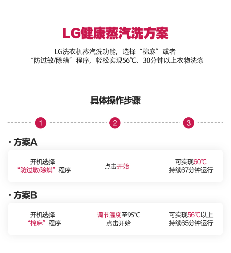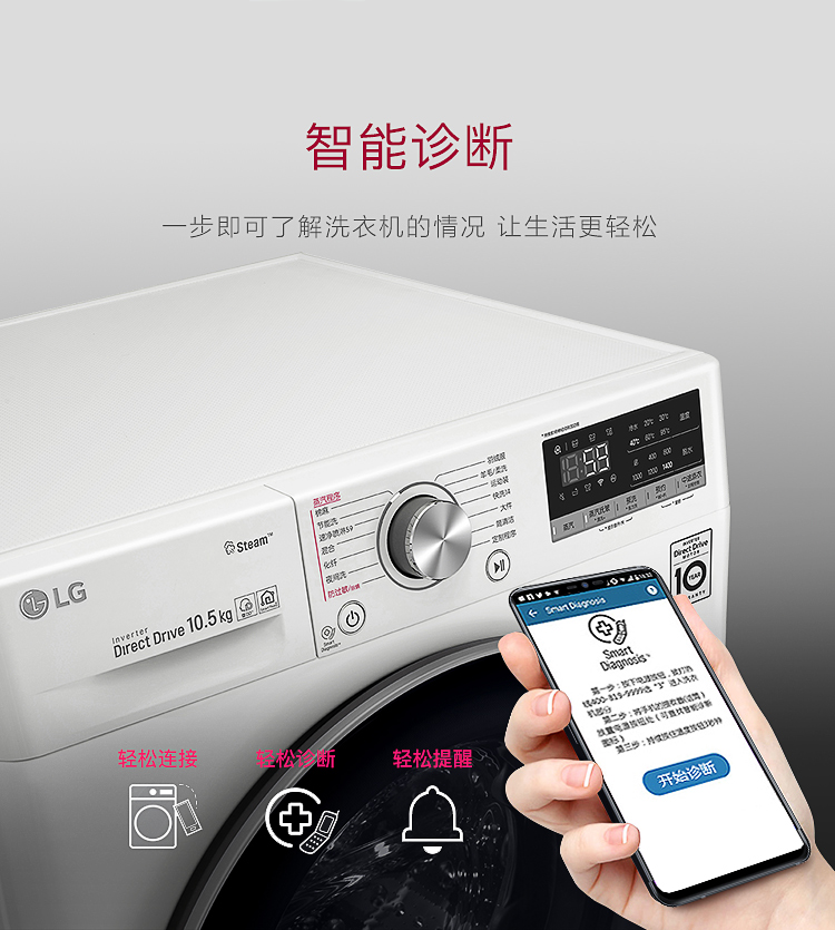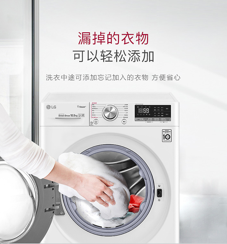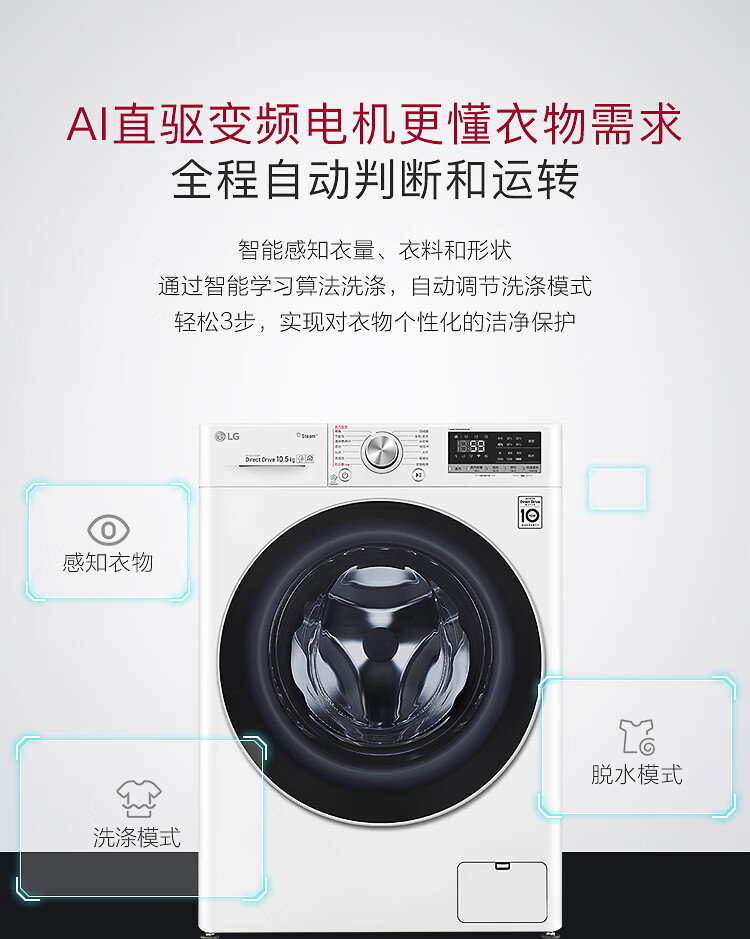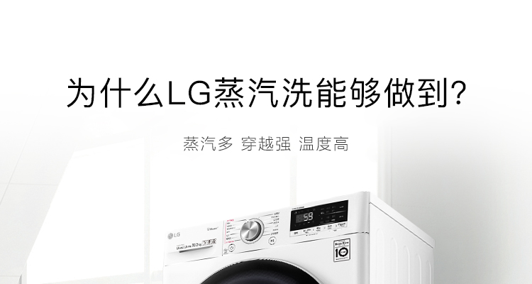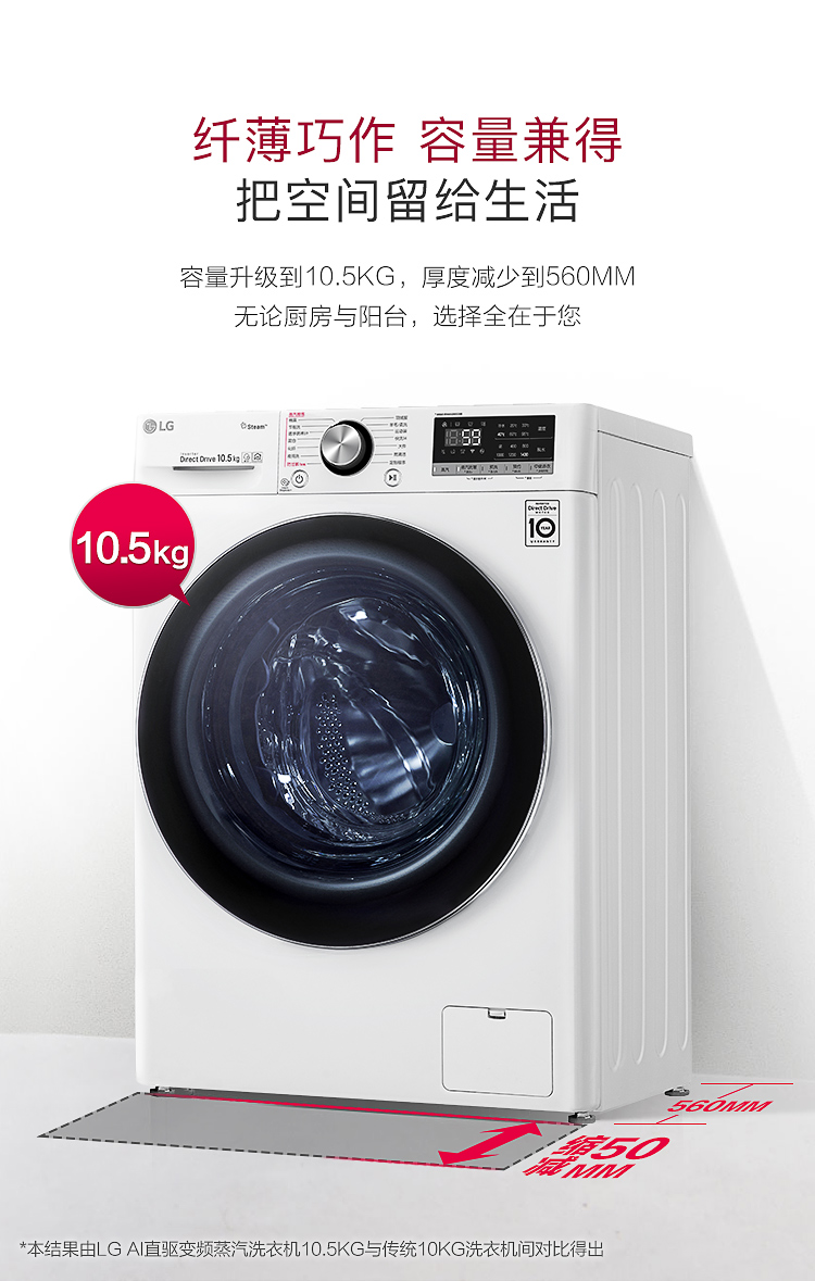 产品类型:滚筒;能效等级:一级能效;特色推荐:大容量洗衣机,滚筒洗衣机;宽度:55.1-60cm;颜色:白色;排水类型:上排水;产品渠道:线下同款;洗涤容量:10-20kg;高度:80.1-85cm;深度:55.1-60cm;用户优选:延保服务,高端洗衣机,除菌;电机类型:变频(节能);特性:大容量,蒸汽除菌除皱,速净喷淋;自动化程度 全自动:洗衣过程自动完成; 半自动:从洗涤到脱水需要人为操作。:全自动;开门方式:前开式;品牌:LG;系列:VC3;产品类型:滚筒式;颜色:白色;操控方式 分为电脑控制(通过电子显示屏调节)和机械控制(通过机械旋钮或按钮调节)。:电脑控制;认证型号 认证型号:CCC证书上的产品型号信息。:FLW10G4W;排水方式:上排水;电机类型:直驱变频电机;显示方式:LED数码屏显示;产品型号:FLW10G4W;电源规格:220V/50HZ;洗涤转速:45~50;能效等级 从1级到5级分别代表能效从高到低,能效越高越节能。:1级;包装尺寸(深x宽x高)mm:670*715*930;洗净比 洗净比越高,洗出来的衣物越干净。:1.03;箱体材质:钢板;洗涤容量(kg):10.5;脱水容量(kg):10.5kg;标准程序耗水量:78L;标准程序耗电量:0.96KW/H;内筒材质:不锈钢;洗涤功率(W):150;产品尺寸(深×宽×高)mm:560*600*850;脱水转速:1400;洗衣程序:棉麻,节能洗,速净喷淋59,混合,化纤,夜间洗,防过敏/除螨,羽绒服,羊毛/柔洗,运动装,快洗14,大件;水位选择(段):自动;脱水功率(W):550;水温调节范围:95;产品重量(kg):70;电辅加热洗涤:支持电辅加热洗涤;防缠绕:支持防缠绕;智能断电记忆:支持智能断电记忆;排水阀漏水保护:支持排水阀漏水保护;筒自洁:支持筒自洁;干衣功能:不支持烘干/风干;自动断电 洗涤过程结束后,机器自动断电,不会一直待机。:支持自动断电;预约功能:支持预约功能;中途添衣:支持中途添衣;脱水功能:支持脱水功能;儿童安全锁:支持儿童安全锁;进水阀漏水保护:支持进水阀漏水保护;电辅加热烘干:不支持电辅加热烘干;夜间洗 洗涤过程声音小,不打扰夜间休息的洗衣程序。:支持夜间洗;包装清单:洗衣机*1,底脚扳手*1,进水管*1,说明书*1,防滑垫*2,进水管转接头*1,运输螺栓孔帽*4