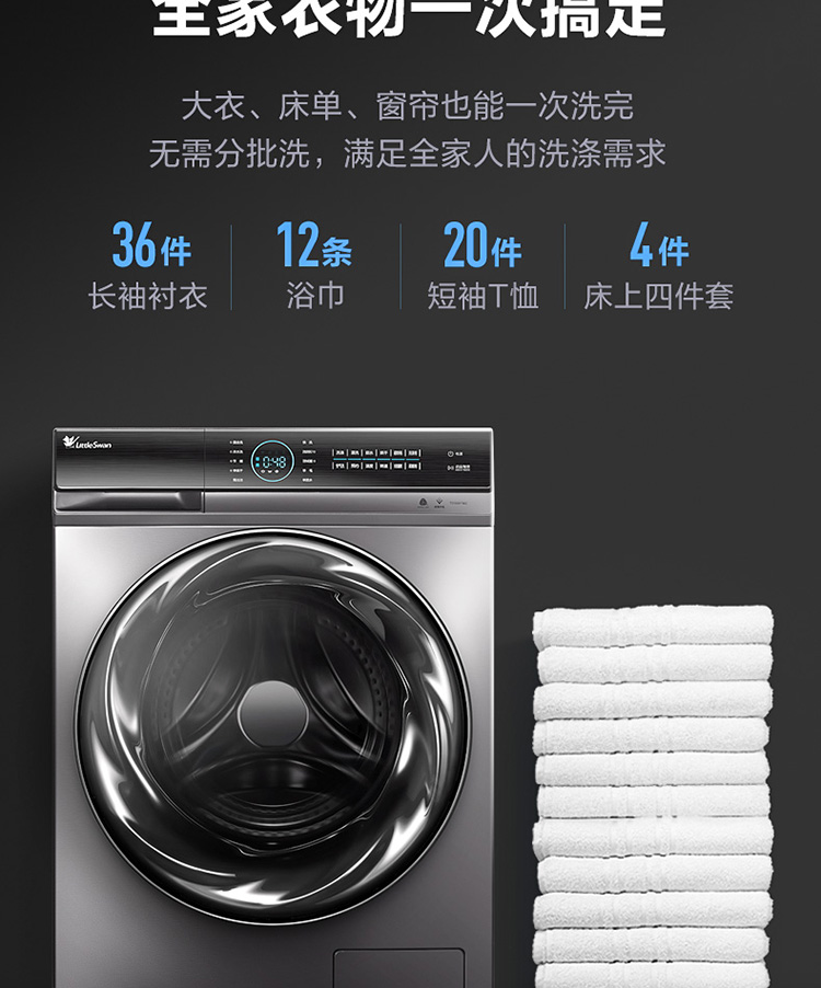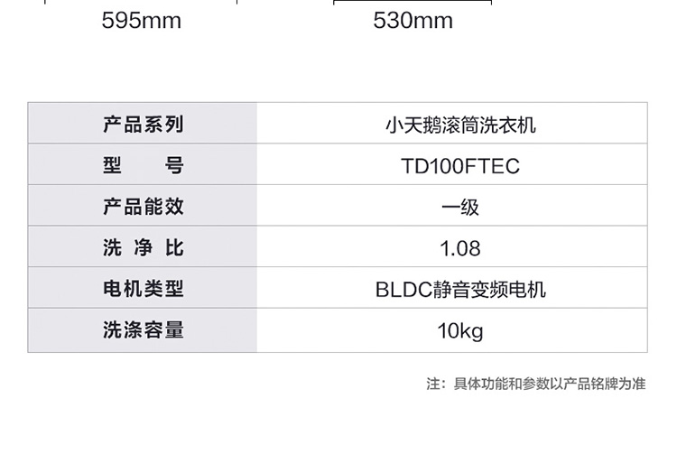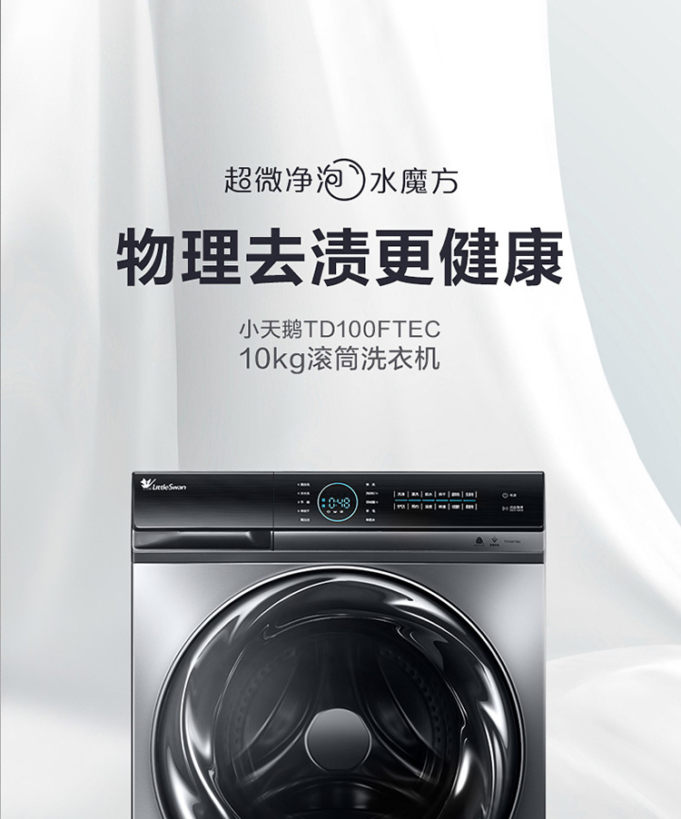 产品类型:洗烘一体;特色推荐:大容量洗衣机,洗烘一体,滚筒洗衣机;颜色:银色;排水类型:上排水;产品渠道:线下同款;洗涤容量:10-20kg;高度:90cm以上;用户优选:新品洗衣机,延保服务,高端洗衣机,京品洗衣机,除菌;能效等级:一级能效;宽度:55.1-60cm;电机类型:变频(节能);特性:运行进度指示、紧急排水、防泡沫控制、不平衡自检与自校、断电记忆、自动称重;自动化程度 全自动:洗衣过程自动完成; 半自动:从洗涤到脱水需要人为操作。:全自动;开门方式:前开式;品牌:小天鹅;产品类型:滚筒式;操控方式 分为电脑控制(通过电子显示屏调节)和机械控制(通过机械旋钮或按钮调节)。:电脑控制;认证型号 认证型号:CCC证书上的产品型号信息。:TD100FTEC;排水方式:上排水;显示方式:LED触摸宽屏控制;产品型号:TD100FTEC;能效等级 从1级到5级分别代表能效从高到低,能效越高越节能。:1级;包装尺寸(深x宽x高)mm:705*700*985;洗净比 洗净比越高,洗出来的衣物越干净。:1.08;箱体材质:彩钢;烘干容量(kg):7;洗涤容量(kg):10;脱水容量(kg):10;标准程序耗水量:64L/cycle;标准程序耗电量:0.750kW·h/cycle;内筒材质:不锈钢;洗涤功率(W):70;产品尺寸(深×宽×高)mm:530*595*850;脱水转速:1400;洗衣程序:快洗15′、混合洗、羊毛、智能洗、节能、羽绒服、空气洗、衬衫、筒自洁、洗烘60’、浸泡洗;脱水功率(W):420;产品重量(kg):70;电辅加热洗涤:支持电辅加热洗涤;防缠绕:支持防缠绕;空气洗:支持空气洗;筒自洁:支持筒自洁;干衣功能:支持烘干/风干;自动断电 洗涤过程结束后,机器自动断电,不会一直待机。:支持自动断电;预约功能:支持预约功能;中途添衣:支持中途添衣;脱水功能:支持脱水功能;儿童安全锁:支持儿童安全锁;智能断电记忆:支持智能断电记忆;电辅加热烘干:支持电辅加热烘干;包装清单:洗衣机*1,说明书*1,保修卡*1,进水管*1,运输螺栓*4;