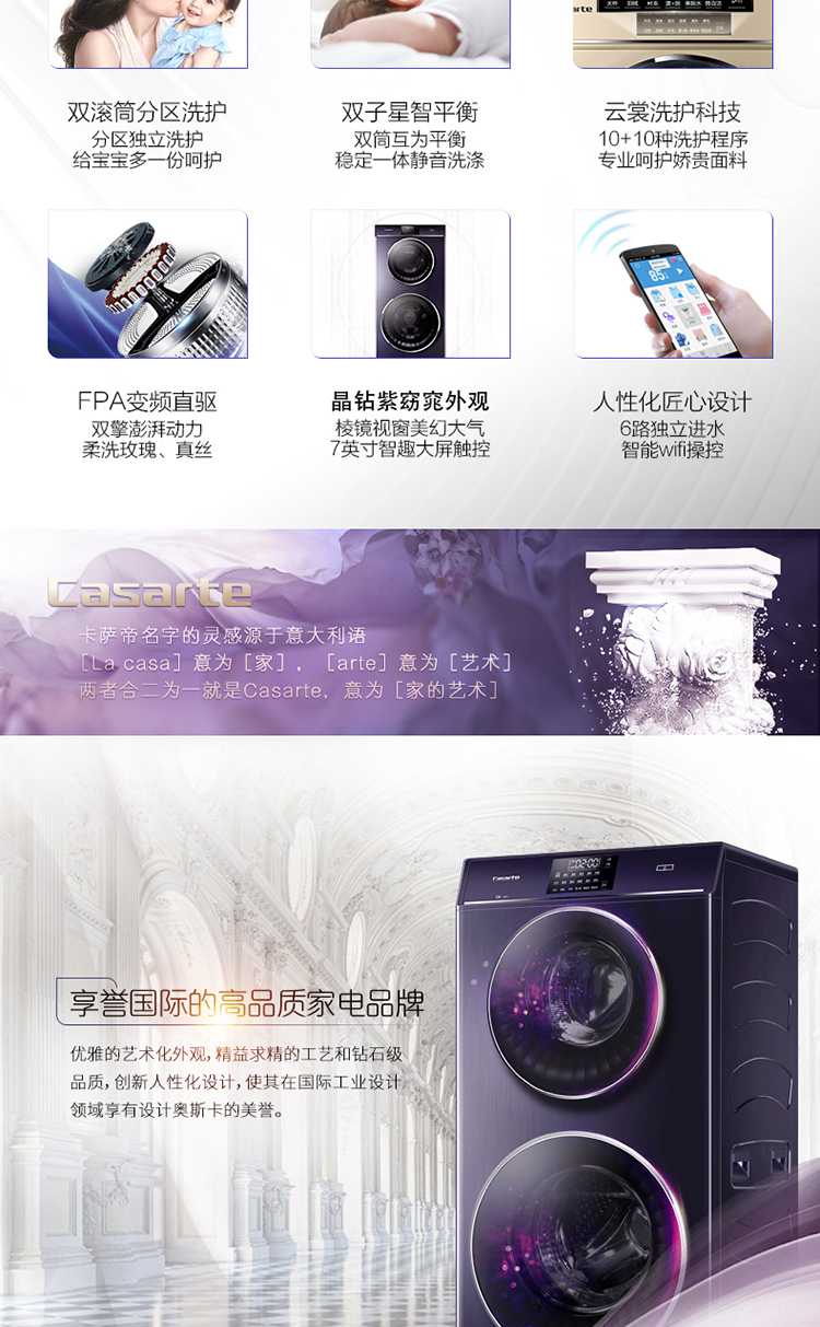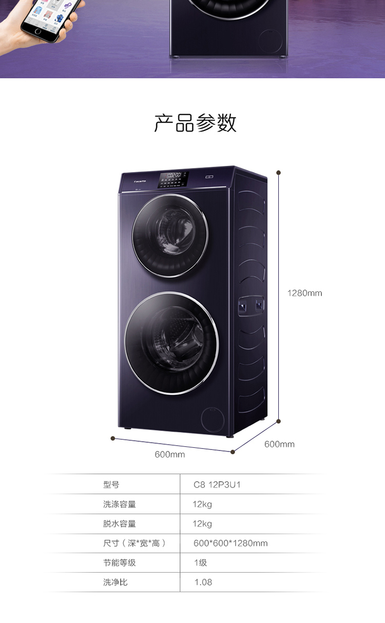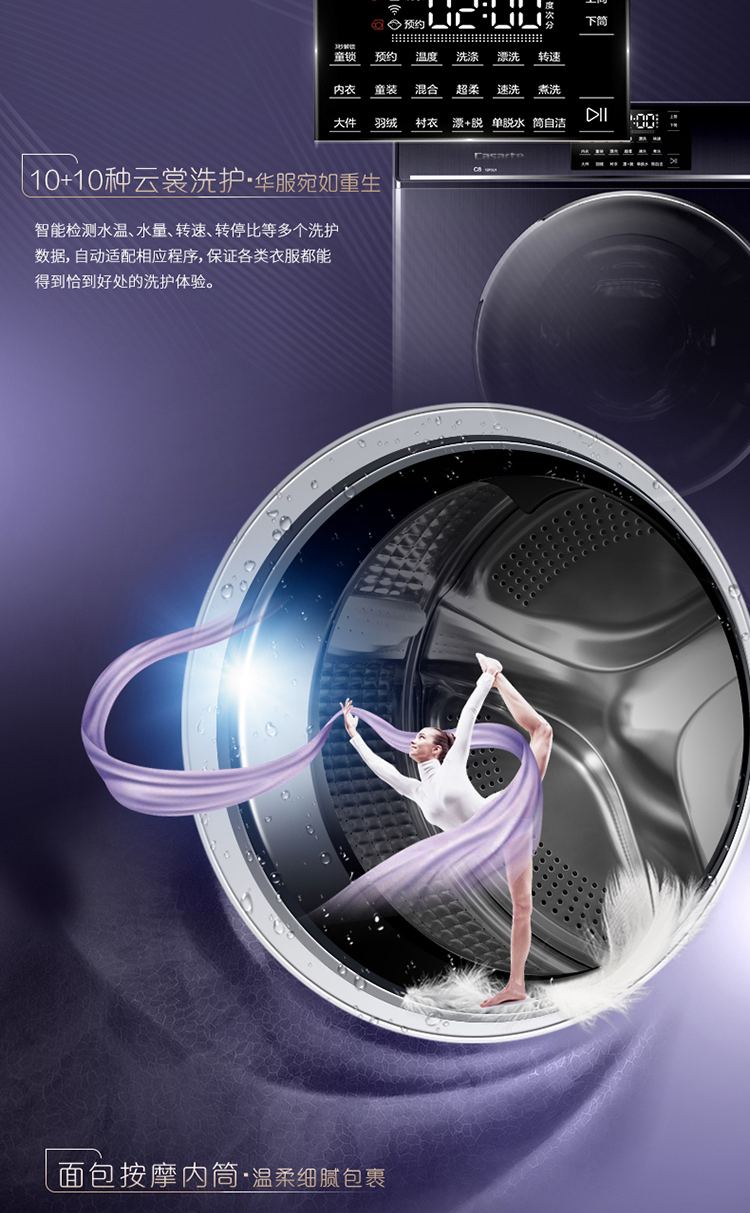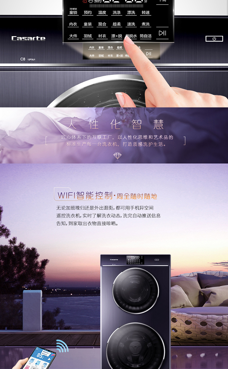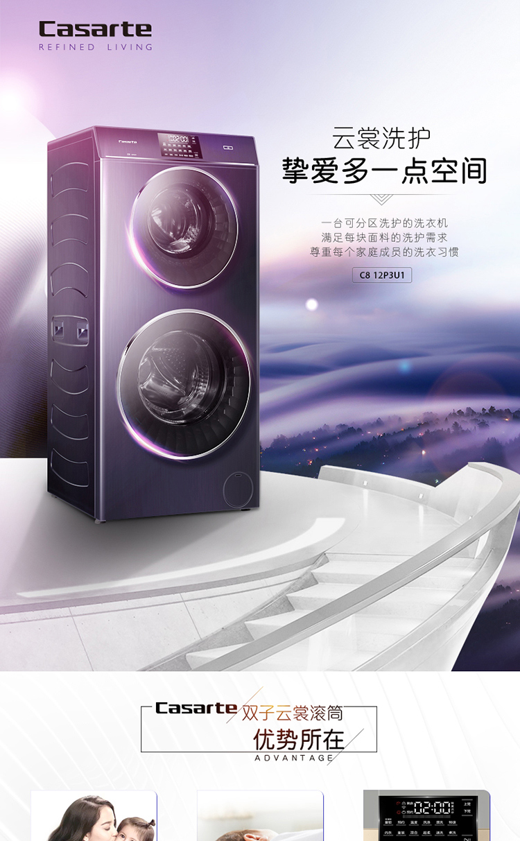 产品类型:滚筒;能效等级:一级能效;特色推荐:大容量洗衣机,滚筒洗衣机;宽度:55.1-60cm;排水类型:下排水;洗涤容量:10-20kg;高度:90cm以上;深度:55.1-60cm;用户优选:高端洗衣机;电机类型:变频(节能);特性:斐雪派克直驱变频电机更节能,7维减震科技更平稳,双擎动力,分区洗护更安全;自动化程度 全自动:洗衣过程自动完成; 半自动:从洗涤到脱水需要人为操作。:全自动;开门方式:前开式;品牌:卡萨帝(Casarte);系列:滚筒;产品类型:滚筒式;操控方式 分为电脑控制(通过电子显示屏调节)和机械控制(通过机械旋钮或按钮调节)。:电脑控制;认证型号 认证型号:CCC证书上的产品型号信息。:C8 12P3U1(EX);排水方式:下排水;显示方式:LED触摸宽屏控制;产品型号:C8 12P3U1(EX);能效等级 从1级到5级分别代表能效从高到低,能效越高越节能。:1级;包装尺寸(深x宽x高)mm:700*680*1420;洗净比 洗净比越高,洗出来的衣物越干净。:1.08;洗涤容量(kg):12;脱水容量(kg):12;标准程序耗水量:78;标准程序耗电量:1.050;内筒材质:不锈钢;洗涤功率(W):300;产品尺寸(深×宽×高)mm:600*600*1280;脱水转速:1200;洗衣程序:内衣、童装、混合、超柔、速洗、煮洗、衬衣、漂+脱、单脱水、筒自洁、大件、羽绒;脱水功率(W):400;水温调节范围:常温;30;40;60;70;90;产品重量(kg):116;电辅加热洗涤:支持电辅加热洗涤;防缠绕:支持防缠绕;筒自洁:支持筒自洁;预约功能:支持预约功能;中途添衣:支持中途添衣;脱水功能:支持脱水功能;儿童安全锁:支持儿童安全锁;包装清单:进水管*1,排水管*1,说明书*1,;