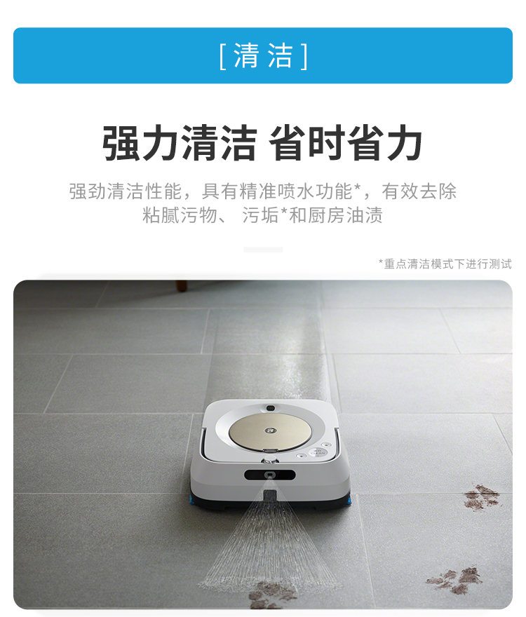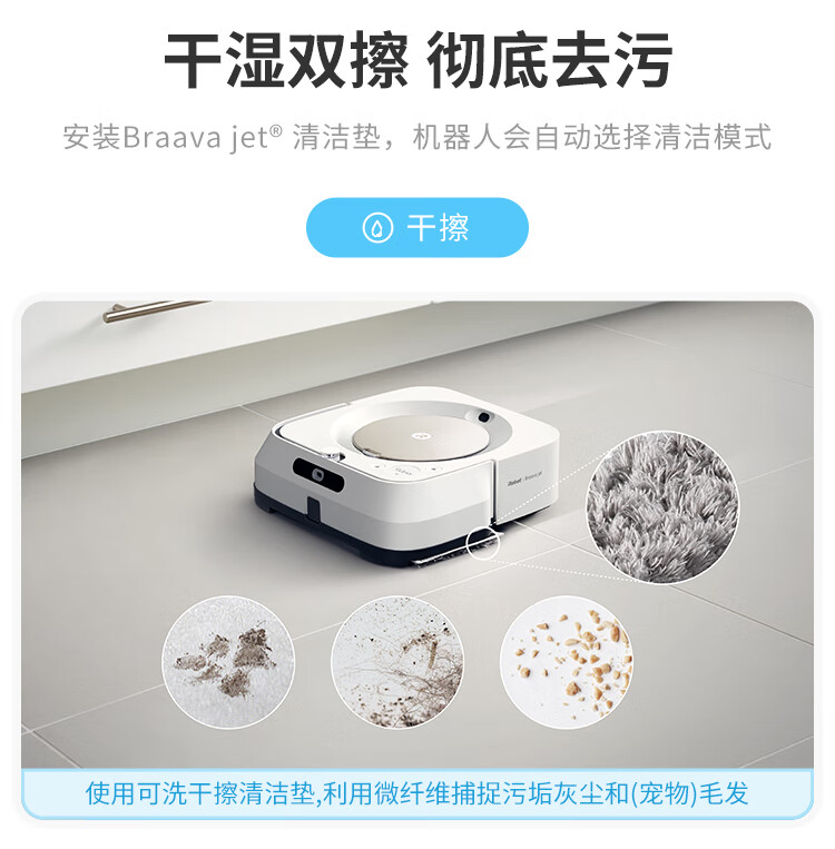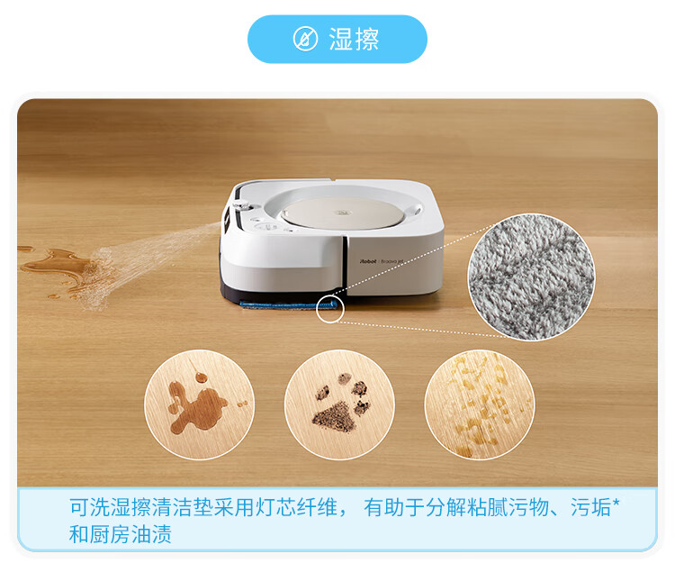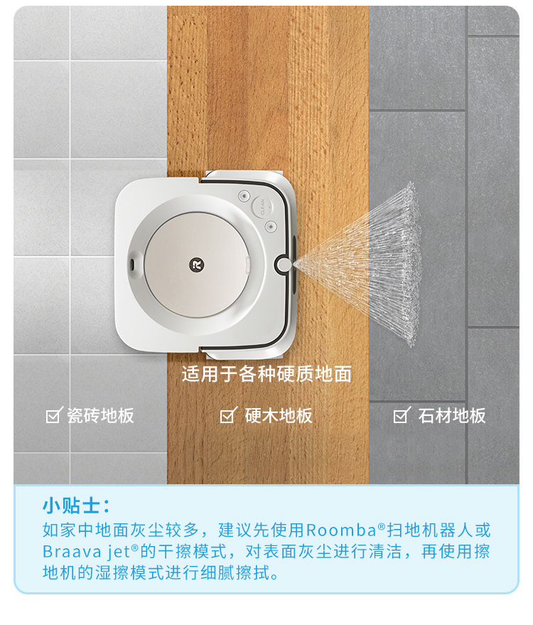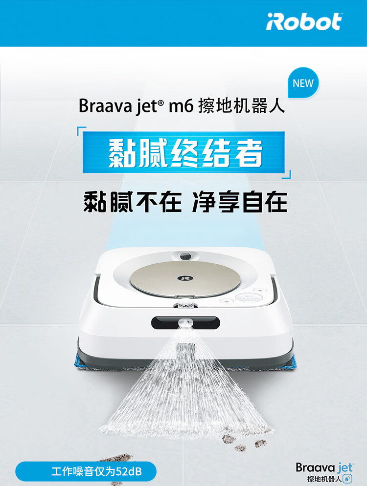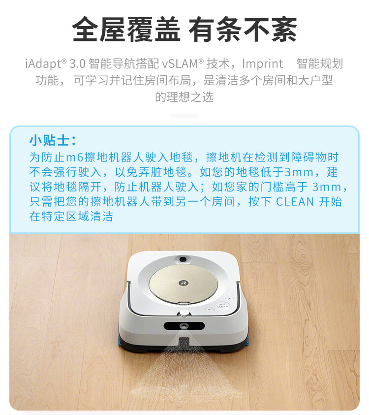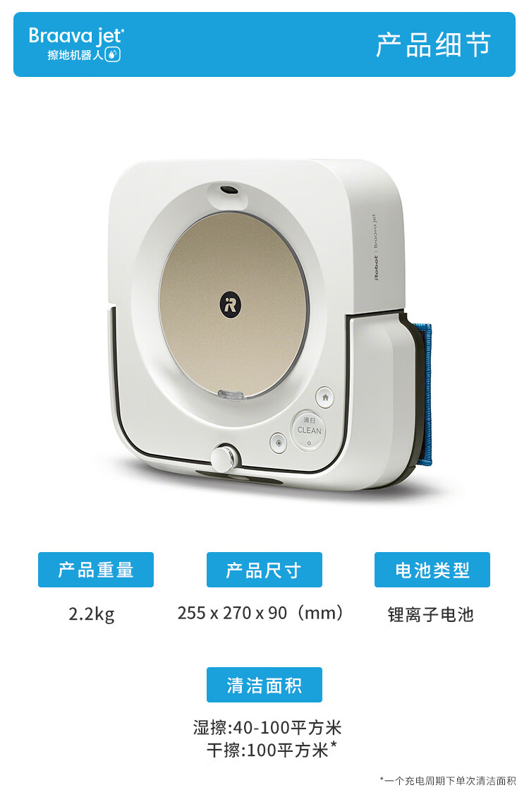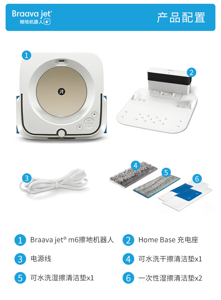 产品类型:拖地机器人;虚拟墙类型:APP虚拟墙;防撞类型:机械撞板;产品渠道:线下同款;电池类型:锂电池;特色功能:APP控制,定时预约,拖地功能,虚拟墙,地毯模式;清洁类型:滚刷;电池节数:8节以上;机身高度:9-10cm;电池容量:1999mAH以下;适用面积:91-120平;水箱容量:250毫升以上;规划技术:单目视觉规划;拖地/水箱类型:电控水箱;电机类型:无刷电机;续航时间:121分钟-180分钟;清扫路线:规划式;机身高度(cm):9cm;电池节数(节):8节;吸力(pa/aw):0pa/aw;噪音(db):0db;充电类型:自动回充;充电时间:约3H;续航时间(分钟):180分钟;品牌:iRobot;产品型号:Braava jet m6;产品尺寸(mm):255 x 270 x 90;额定功率(W):25W;水箱容量(L):0.45L;额定电压(V):220V;产品净重(kg):2.4kg;集尘容量(L):0L;包装清单:擦地机器人*1、一次性湿擦清洁垫*2、可水洗干擦清洁垫*1、可水洗湿擦清洁垫*1、回充底座*1、滴水盘*1;