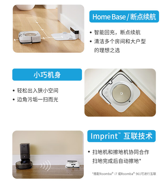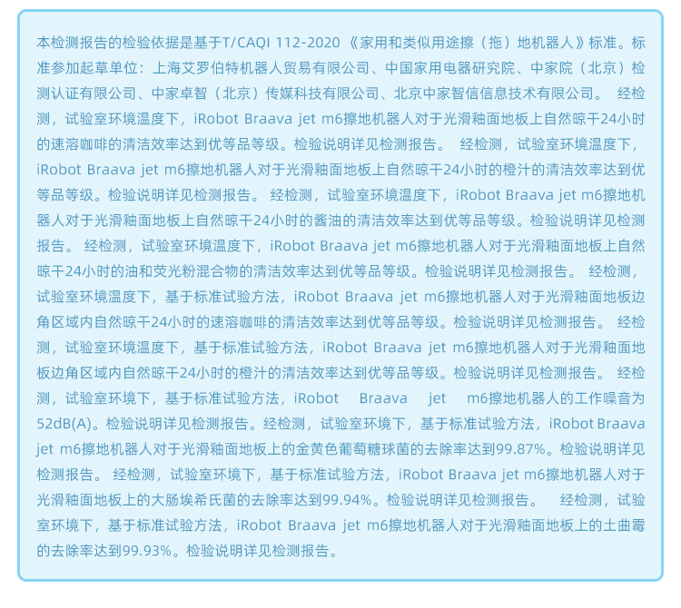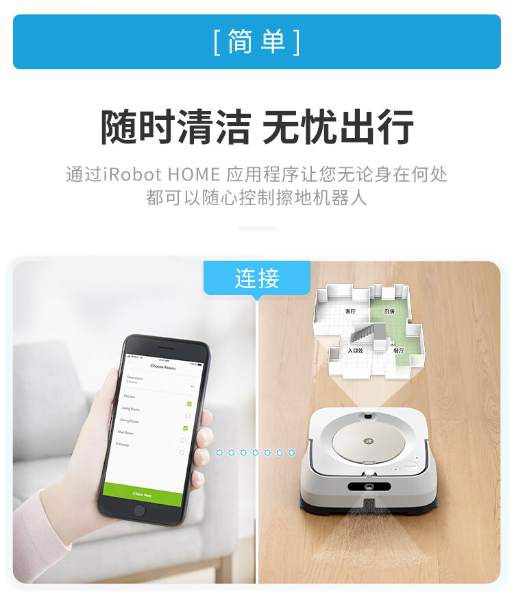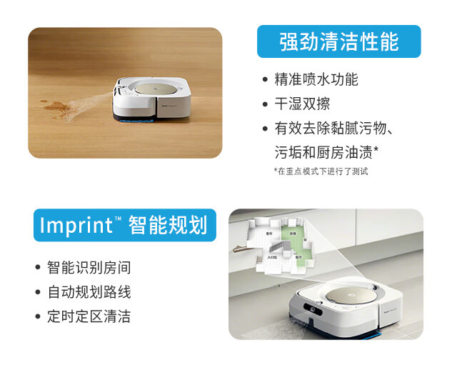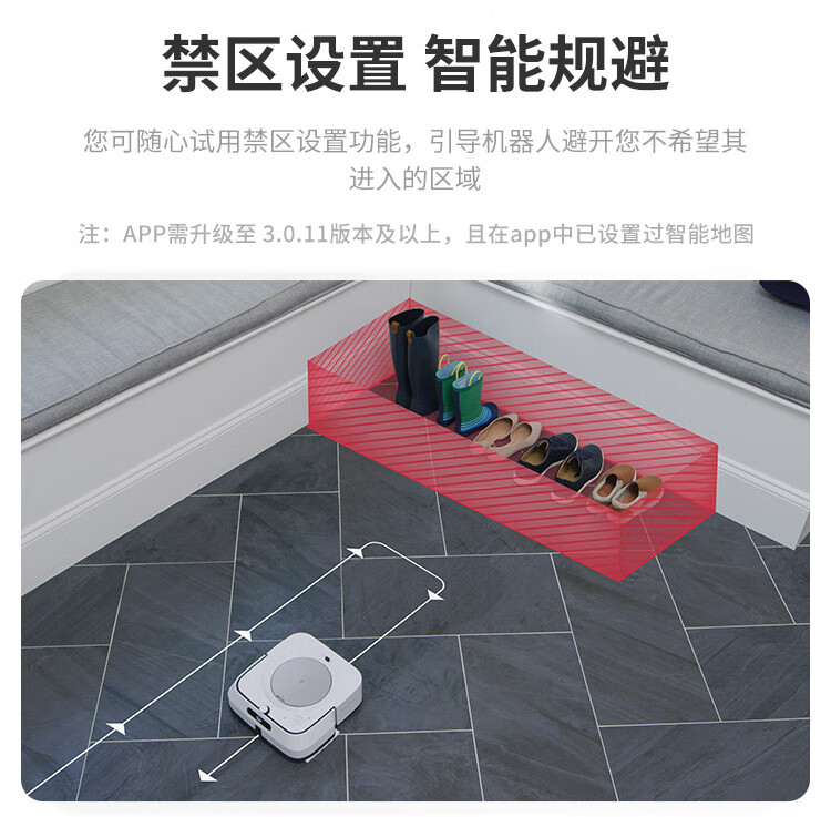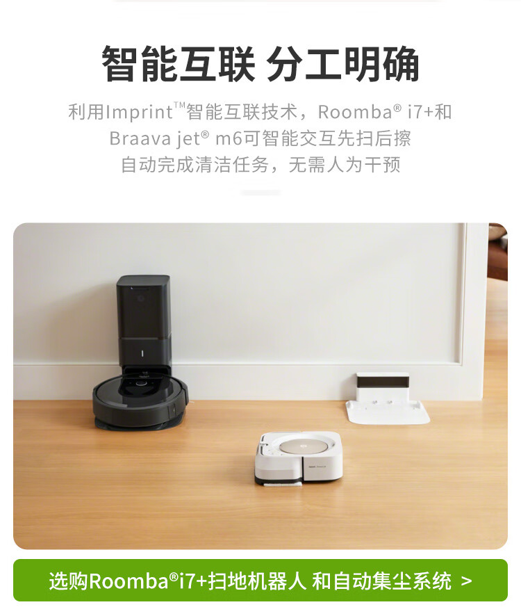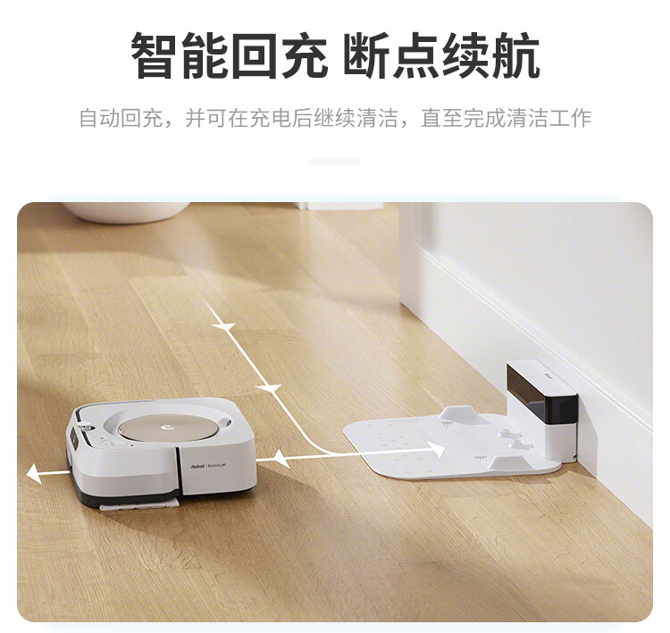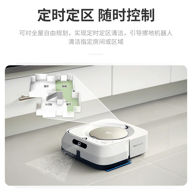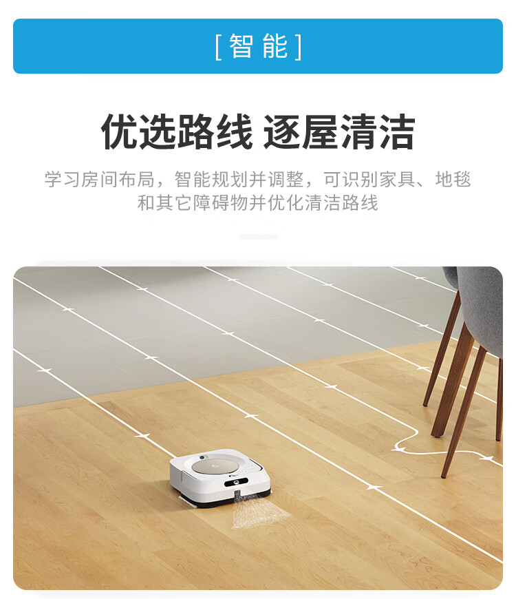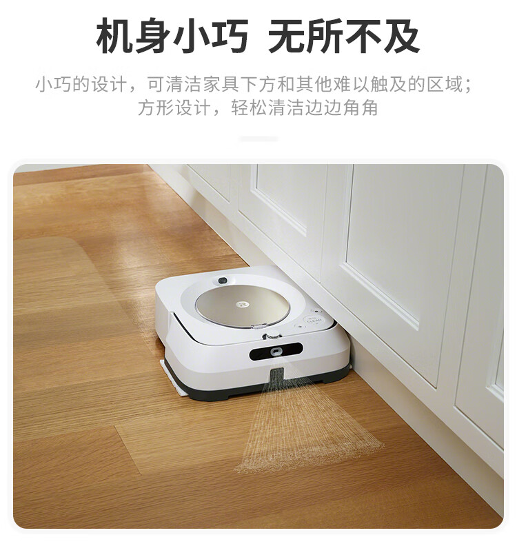 产品类型:拖地机器人;虚拟墙类型:APP虚拟墙;防撞类型:机械撞板;产品渠道:线下同款;电池类型:锂电池;特色功能:APP控制,定时预约,拖地功能,虚拟墙,地毯模式;清洁类型:滚刷;电池节数:8节以上;机身高度:9-10cm;电池容量:1999mAH以下;适用面积:91-120平;水箱容量:250毫升以上;规划技术:单目视觉规划;拖地/水箱类型:电控水箱;电机类型:无刷电机;续航时间:121分钟-180分钟;清扫路线:规划式;机身高度(cm):9cm;电池节数(节):8节;吸力(pa/aw):0pa/aw;噪音(db):0db;充电类型:自动回充;充电时间:约3H;续航时间(分钟):180分钟;品牌:iRobot;产品型号:Braava jet m6;产品尺寸(mm):255 x 270 x 90;额定功率(W):25W;水箱容量(L):0.45L;额定电压(V):220V;产品净重(kg):2.4kg;集尘容量(L):0L;包装清单:擦地机器人*1、一次性湿擦清洁垫*2、可水洗干擦清洁垫*1、可水洗湿擦清洁垫*1、回充底座*1、滴水盘*1;