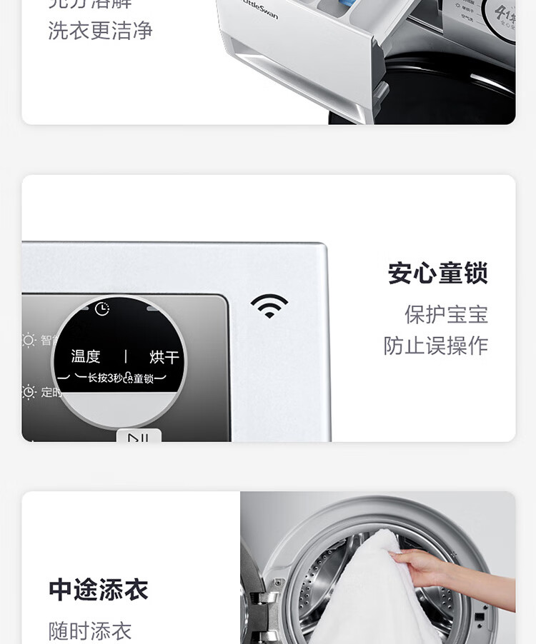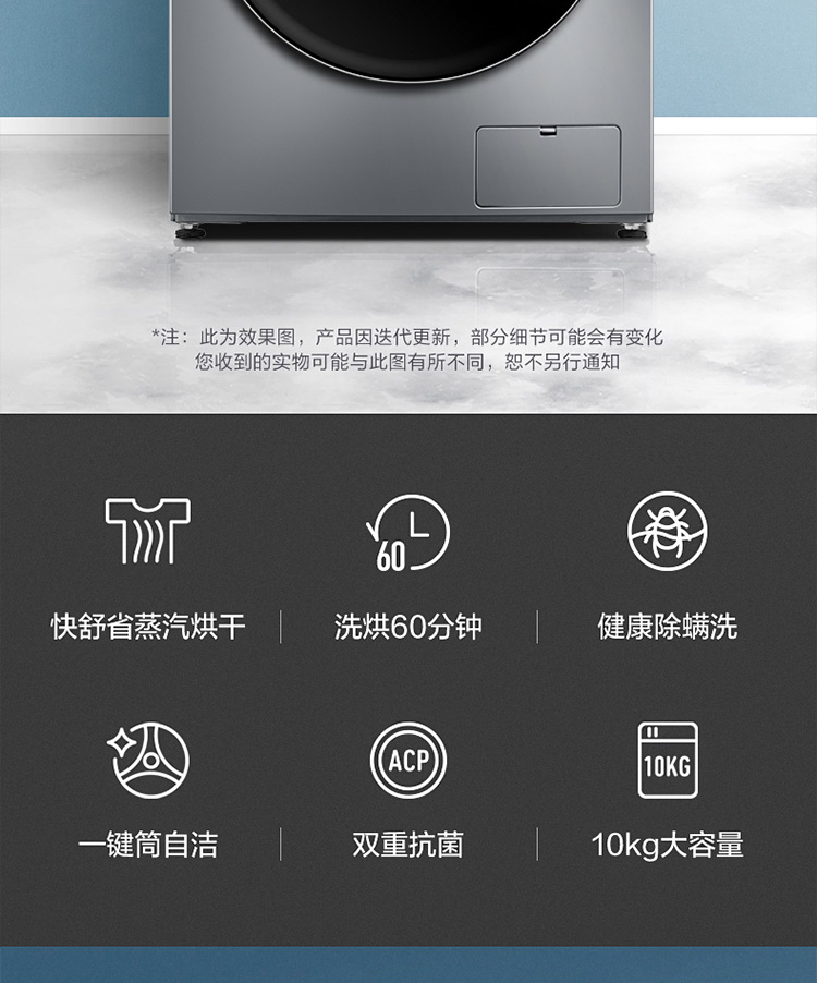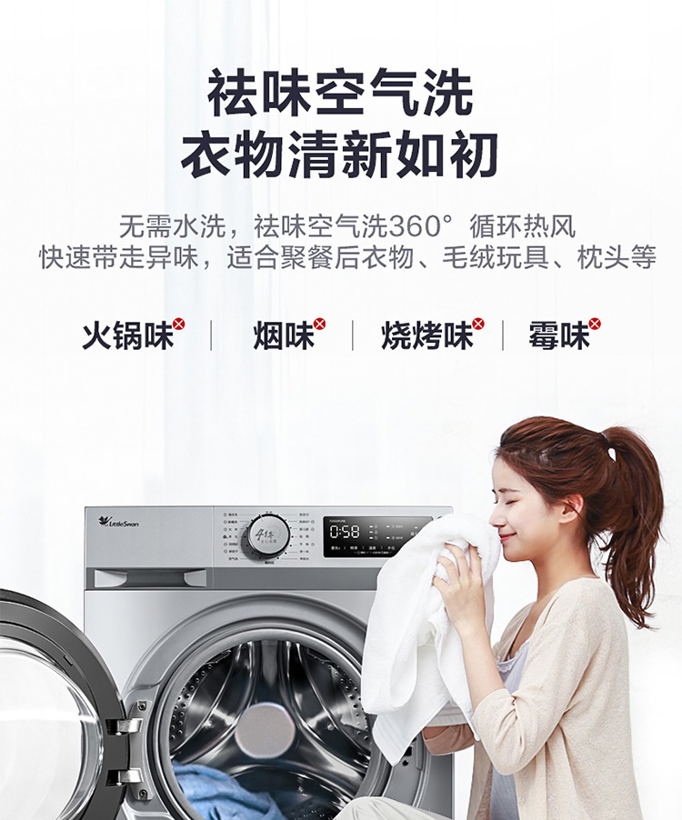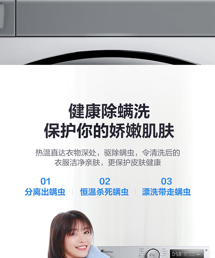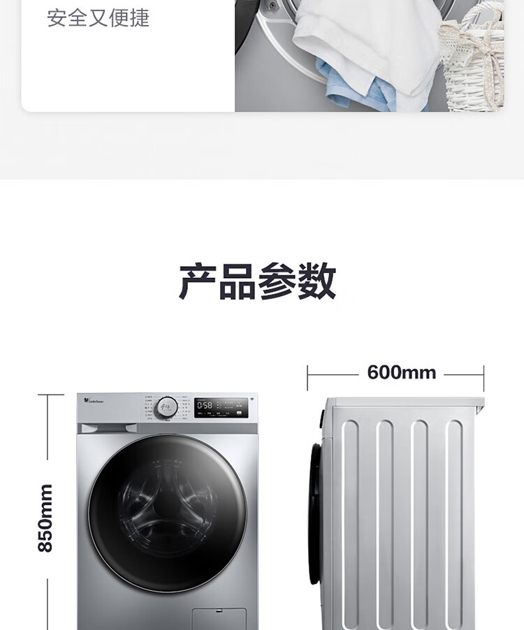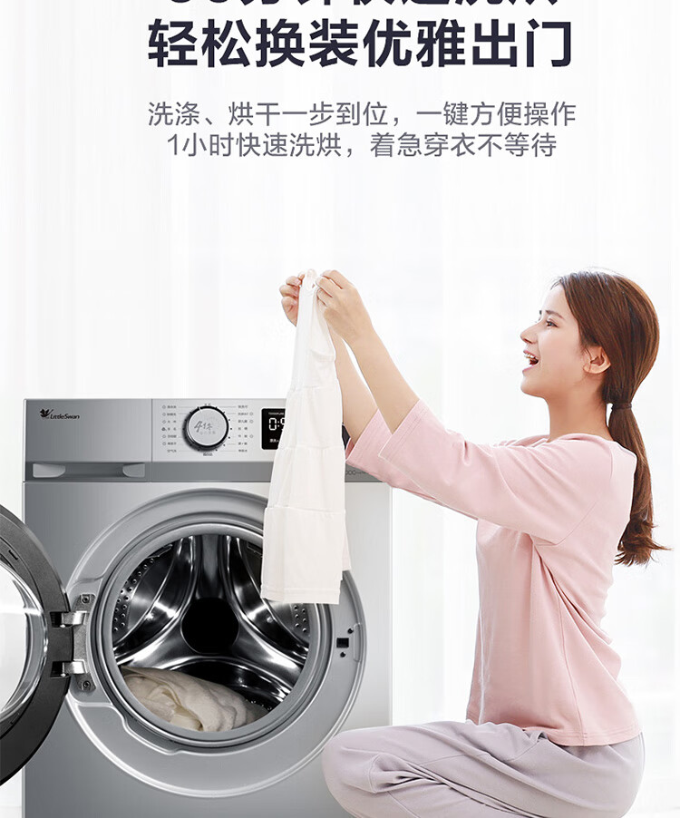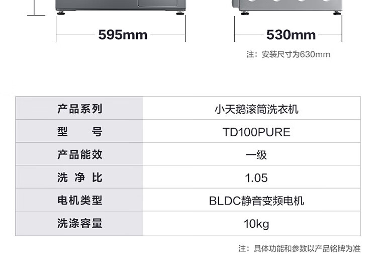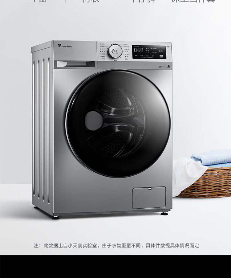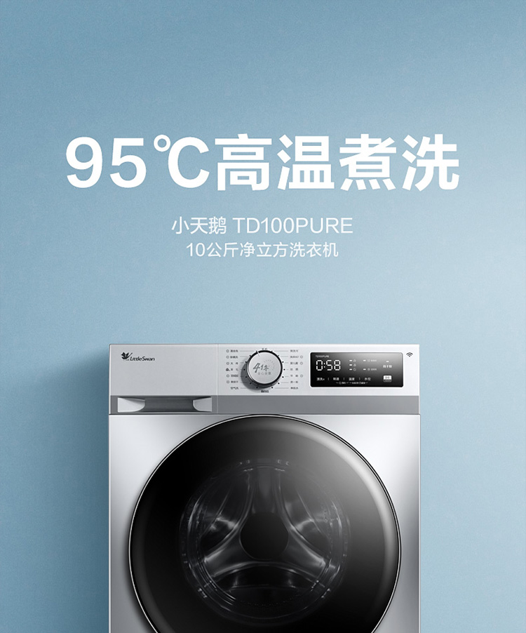 产品类型:洗烘一体;特色推荐:大容量洗衣机,洗烘一体,滚筒洗衣机;颜色:银色;排水类型:上排水;产品渠道:线下同款;洗涤容量:10-20kg;高度:80.1-85cm;深度:50.1-55cm;用户优选:新品洗衣机,延保服务,京品洗衣机,除菌;能效等级:一级能效;宽度:55.1-60cm;电机类型:变频(节能);特性:门锁显示、运行进度指示、断电记忆、自动称重、防泡沫控制、不平衡自检与自校;自动化程度 全自动:洗衣过程自动完成; 半自动:从洗涤到脱水需要人为操作。:全自动;开门方式:前开式;品牌:小天鹅;产品类型:滚筒式;颜色:银色;操控方式 分为电脑控制(通过电子显示屏调节)和机械控制(通过机械旋钮或按钮调节)。:电脑控制;认证型号 认证型号:CCC证书上的产品型号信息。:TD100PURE;排水方式:上排水;显示方式:LED触摸宽屏控制;产品型号:TD100PURE;能效等级 从1级到5级分别代表能效从高到低,能效越高越节能。:1级;包装尺寸(深x宽x高)mm:705*700*985;洗净比 洗净比越高,洗出来的衣物越干净。:1.05;箱体材质:彩钢;烘干容量(kg):7;洗涤容量(kg):10;标准程序耗水量:64L/cycle;标准程序耗电量:0.750kW·h/cycle;内筒材质:不锈钢;洗涤功率(W):70;产品尺寸(深×宽×高)mm:530*595*850;脱水转速:1400;洗衣程序:筒自洁、洗烘60’、婴儿服、除螨洗、快洗15′、节能、单烘干、混合洗;产品重量(kg):68;电辅加热洗涤:支持电辅加热洗涤;防缠绕:支持防缠绕;空气洗:支持空气洗;筒自洁:支持筒自洁;干衣功能:支持烘干/风干;自动断电 洗涤过程结束后,机器自动断电,不会一直待机。:支持自动断电;预约功能:支持预约功能;中途添衣:支持中途添衣;脱水功能:支持脱水功能;儿童安全锁:支持儿童安全锁;智能断电记忆:支持智能断电记忆;电辅加热烘干:支持电辅加热烘干;包装清单:洗衣机*1,说明书*1,保修卡*1,进水管*1,运输螺栓*4;