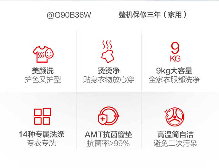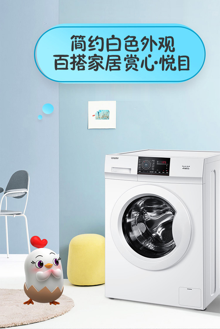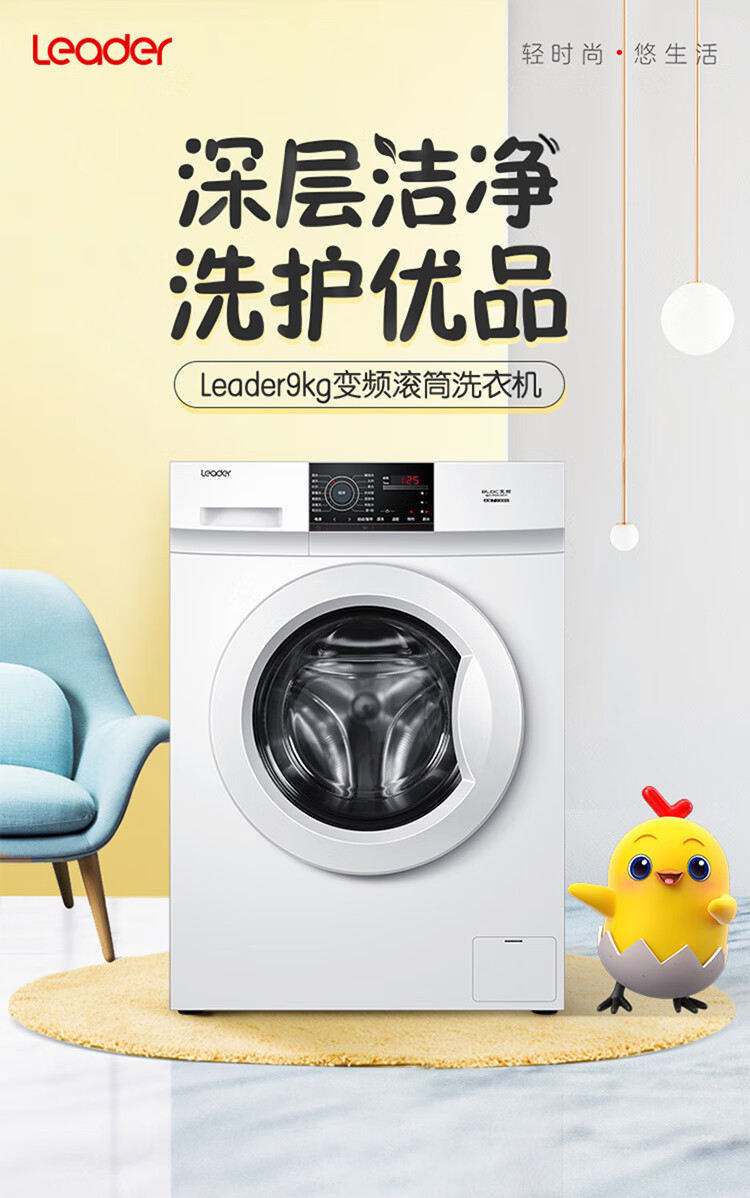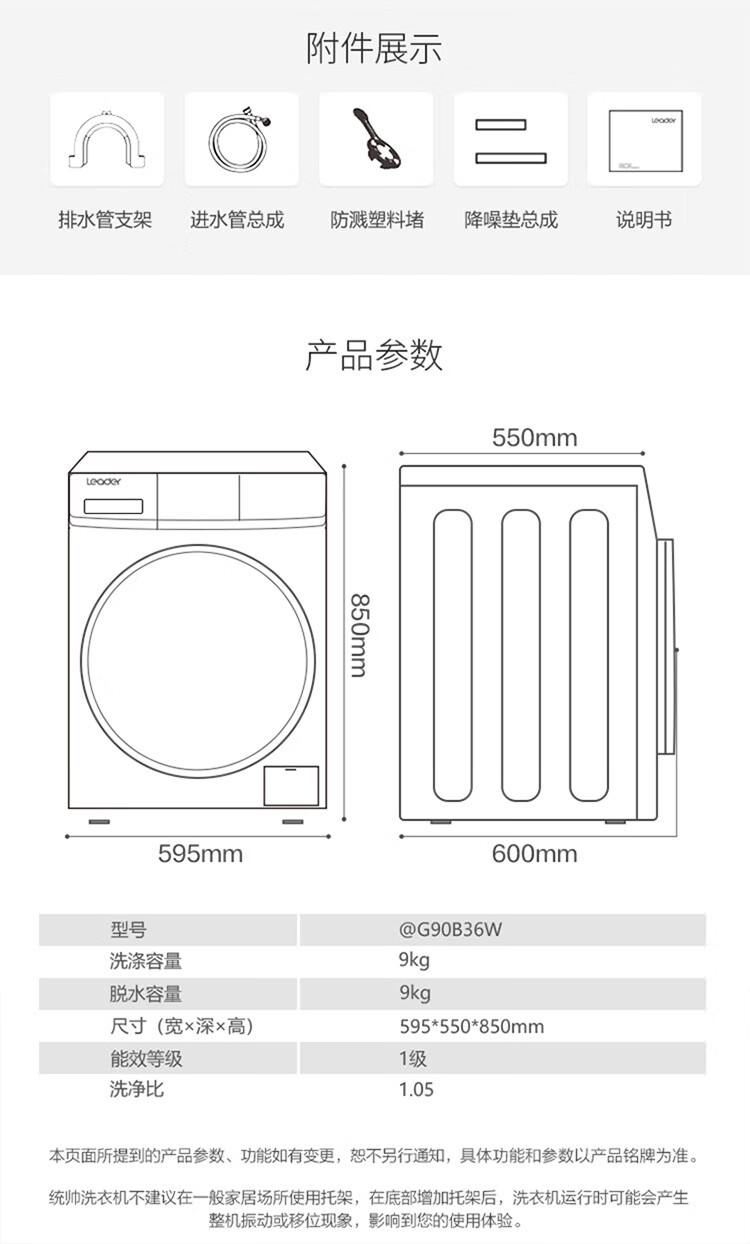 产品类型:滚筒;能效等级:一级能效;特色推荐:滚筒洗衣机;宽度:55.1-60cm;颜色:白色;排水类型:上排水;产品渠道:线下同款;洗涤容量:9kg;高度:80.1-85cm;深度:50.1-55cm;用户优选:新品洗衣机;电机类型:变频(节能);特性:筒自洁、速洗、高温烫烫净;自动化程度 全自动:洗衣过程自动完成; 半自动:从洗涤到脱水需要人为操作。:全自动;开门方式:前开式;品牌:统帅(Leader);产品类型:滚筒式;颜色:白色;操控方式 分为电脑控制(通过电子显示屏调节)和机械控制(通过机械旋钮或按钮调节)。:电脑控制;认证型号 认证型号:CCC证书上的产品型号信息。:@G90B36W;排水方式:上排水;显示方式:LED数码屏显示;产品型号:@G90B36W;能效等级 从1级到5级分别代表能效从高到低,能效越高越节能。:1级;包装尺寸(深x宽x高)mm:672*672*920;洗净比 洗净比越高,洗出来的衣物越干净。:1.05;箱体材质:渗锌钢板;洗涤容量(kg):9;脱水容量(kg):9;内筒材质:不锈钢;洗涤功率(W):150;产品尺寸(深×宽×高)mm:550*595*850;洗衣程序:混合、速洗、衬衣、婴童洗、美颜洗、消毒洗、筒自洁、飓浪洗、大件、柔洗、休闲装、烫烫净、单脱水、漂+脱;脱水功率(W):500;水温调节范围:常温;30;40;60;90;产品重量(kg):70;防缠绕:支持防缠绕;筒自洁:支持筒自洁;预约功能:支持预约功能;中途添衣:支持中途添衣;脱水功能:支持脱水功能;儿童安全锁:支持儿童安全锁;包装清单:洗衣机主机*1,说明书*1;