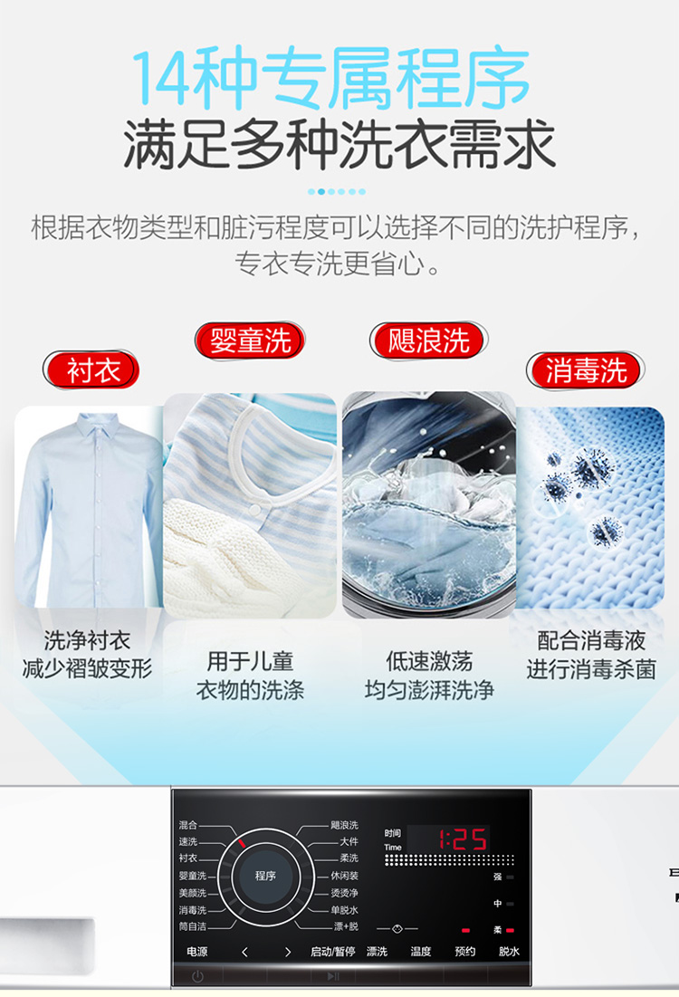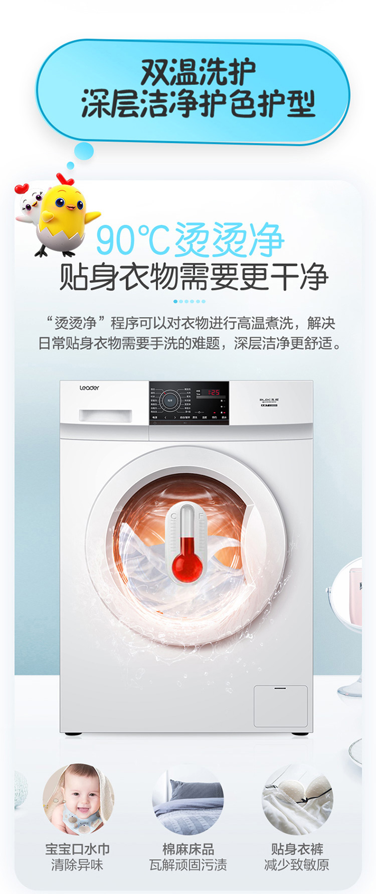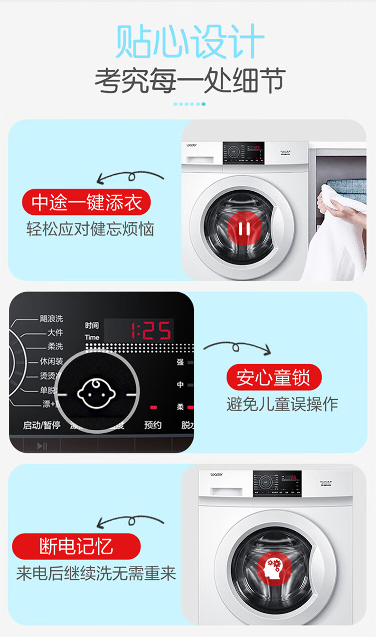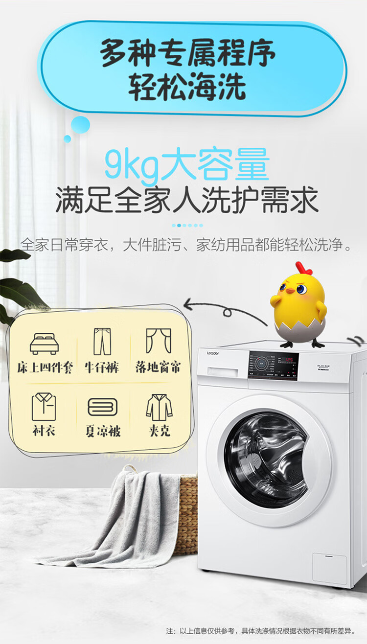 产品类型:滚筒;能效等级:一级能效;特色推荐:滚筒洗衣机;宽度:55.1-60cm;颜色:白色;排水类型:上排水;产品渠道:线下同款;洗涤容量:9kg;高度:80.1-85cm;深度:50.1-55cm;用户优选:新品洗衣机;电机类型:变频(节能);特性:筒自洁、速洗、高温烫烫净;自动化程度 全自动:洗衣过程自动完成; 半自动:从洗涤到脱水需要人为操作。:全自动;开门方式:前开式;品牌:统帅(Leader);产品类型:滚筒式;颜色:白色;操控方式 分为电脑控制(通过电子显示屏调节)和机械控制(通过机械旋钮或按钮调节)。:电脑控制;认证型号 认证型号:CCC证书上的产品型号信息。:@G90B36W;排水方式:上排水;显示方式:LED数码屏显示;产品型号:@G90B36W;能效等级 从1级到5级分别代表能效从高到低,能效越高越节能。:1级;包装尺寸(深x宽x高)mm:672*672*920;洗净比 洗净比越高,洗出来的衣物越干净。:1.05;箱体材质:渗锌钢板;洗涤容量(kg):9;脱水容量(kg):9;内筒材质:不锈钢;洗涤功率(W):150;产品尺寸(深×宽×高)mm:550*595*850;洗衣程序:混合、速洗、衬衣、婴童洗、美颜洗、消毒洗、筒自洁、飓浪洗、大件、柔洗、休闲装、烫烫净、单脱水、漂+脱;脱水功率(W):500;水温调节范围:常温;30;40;60;90;产品重量(kg):70;防缠绕:支持防缠绕;筒自洁:支持筒自洁;预约功能:支持预约功能;中途添衣:支持中途添衣;脱水功能:支持脱水功能;儿童安全锁:支持儿童安全锁;包装清单:洗衣机主机*1,说明书*1;