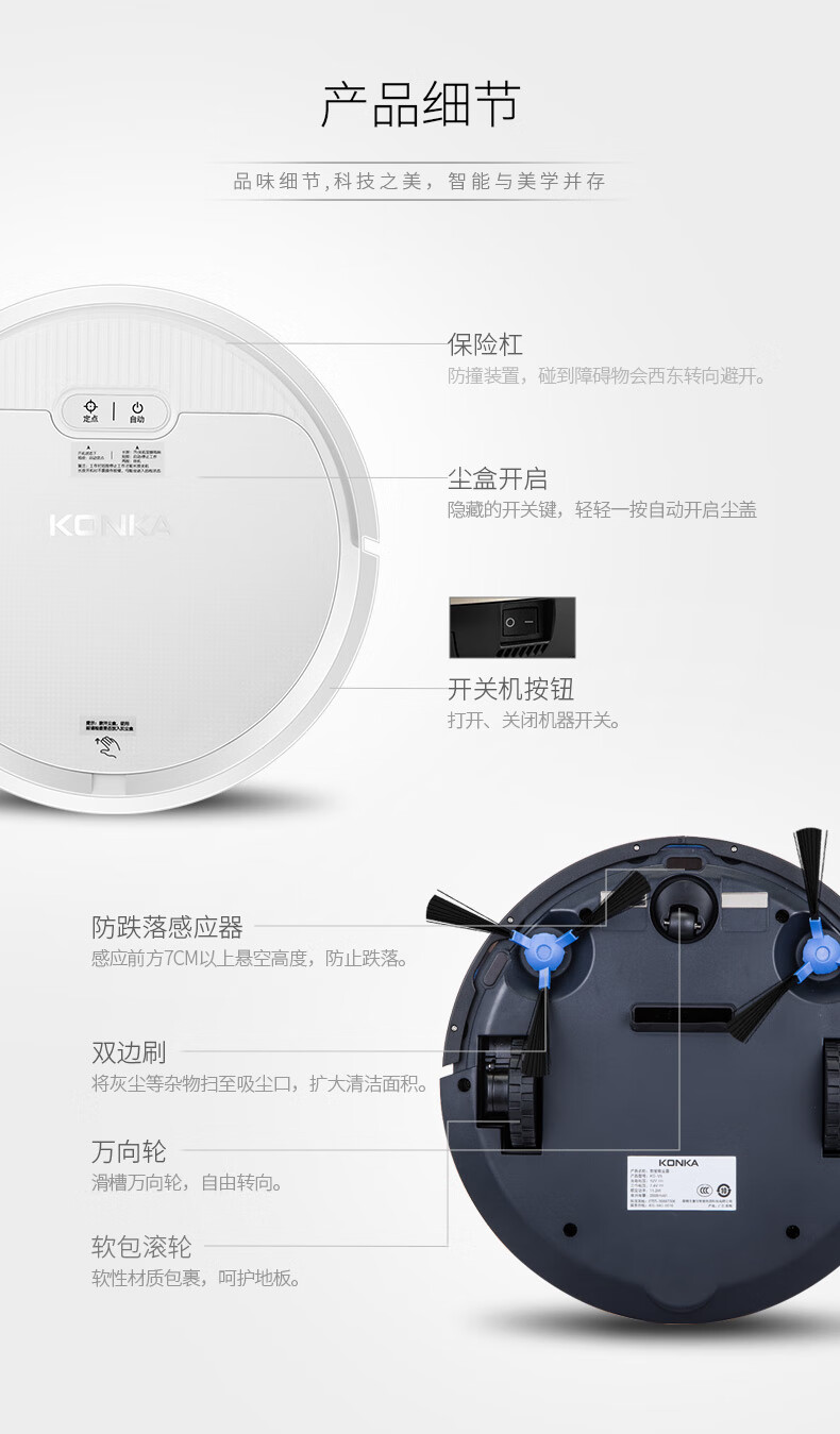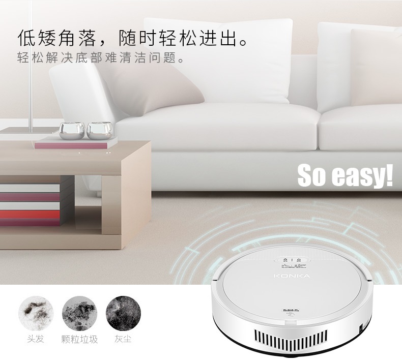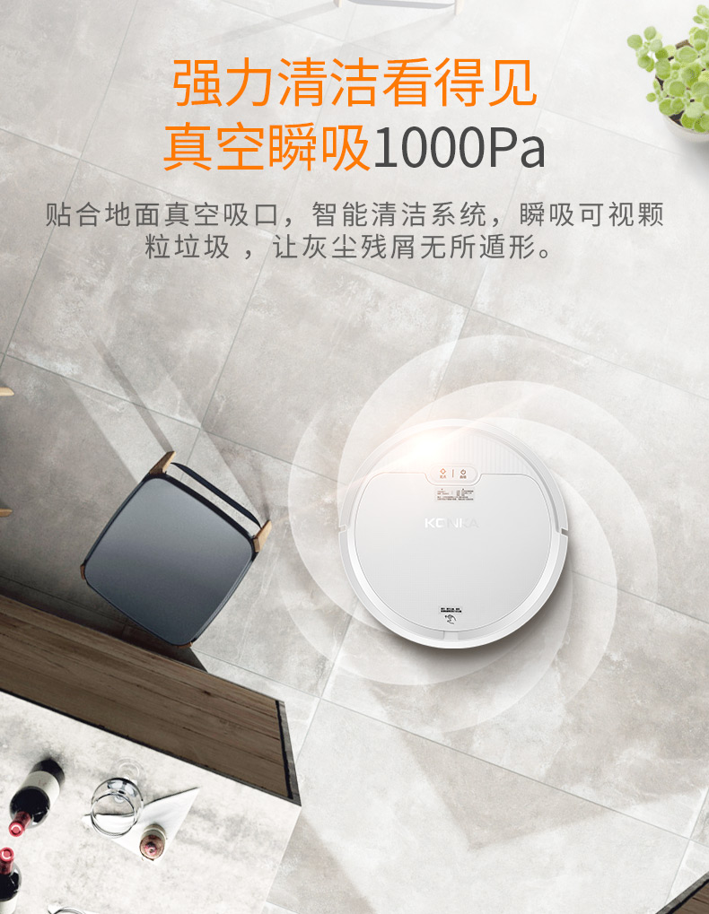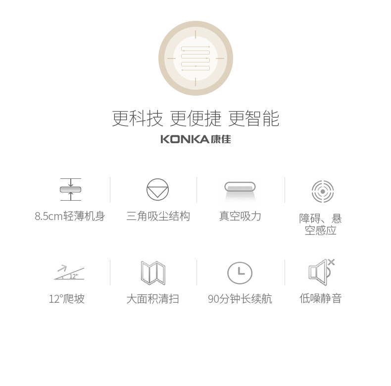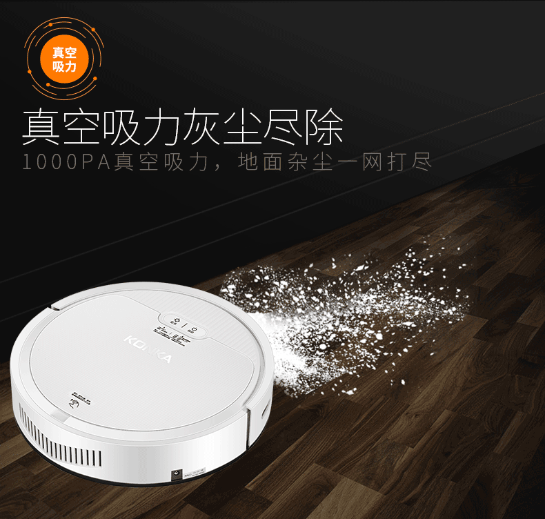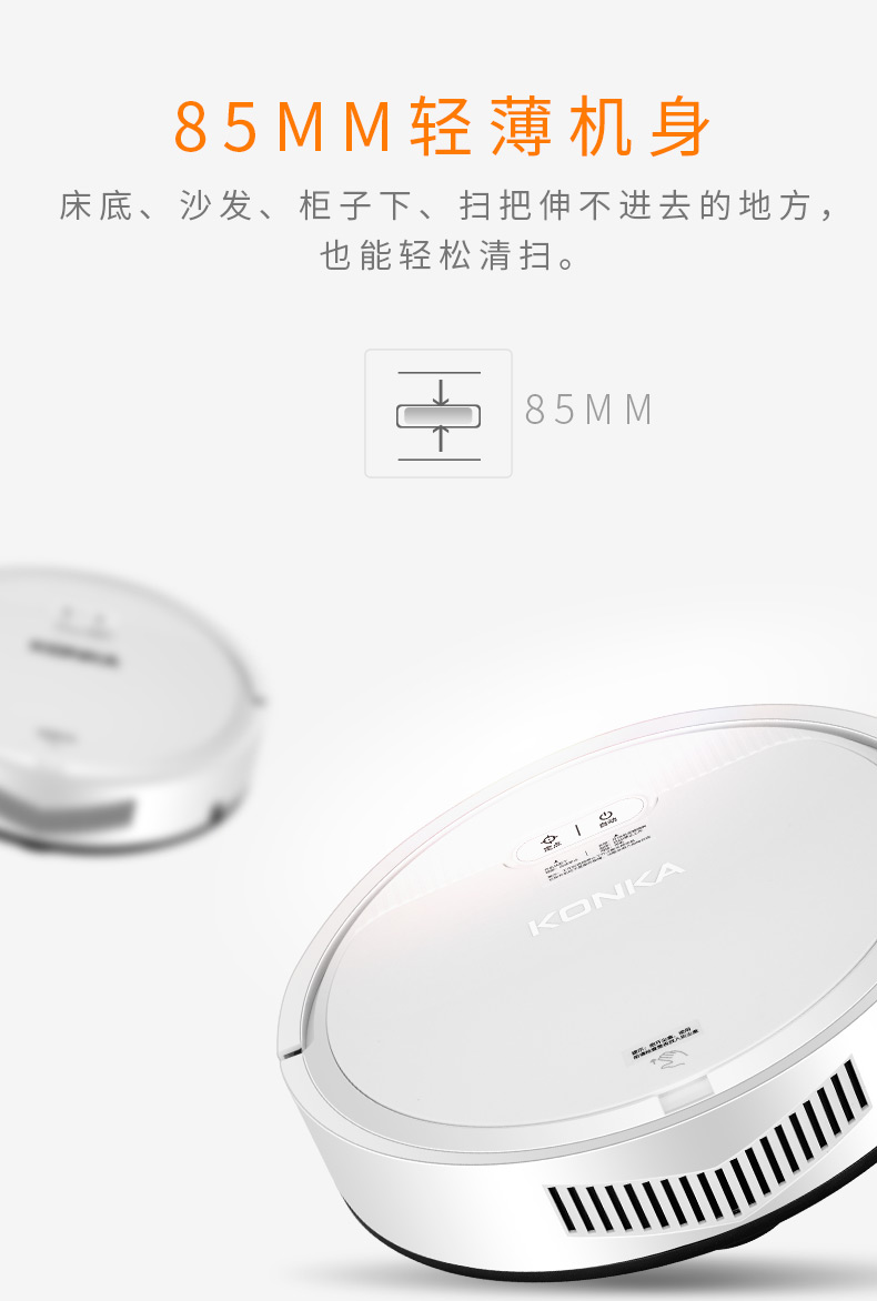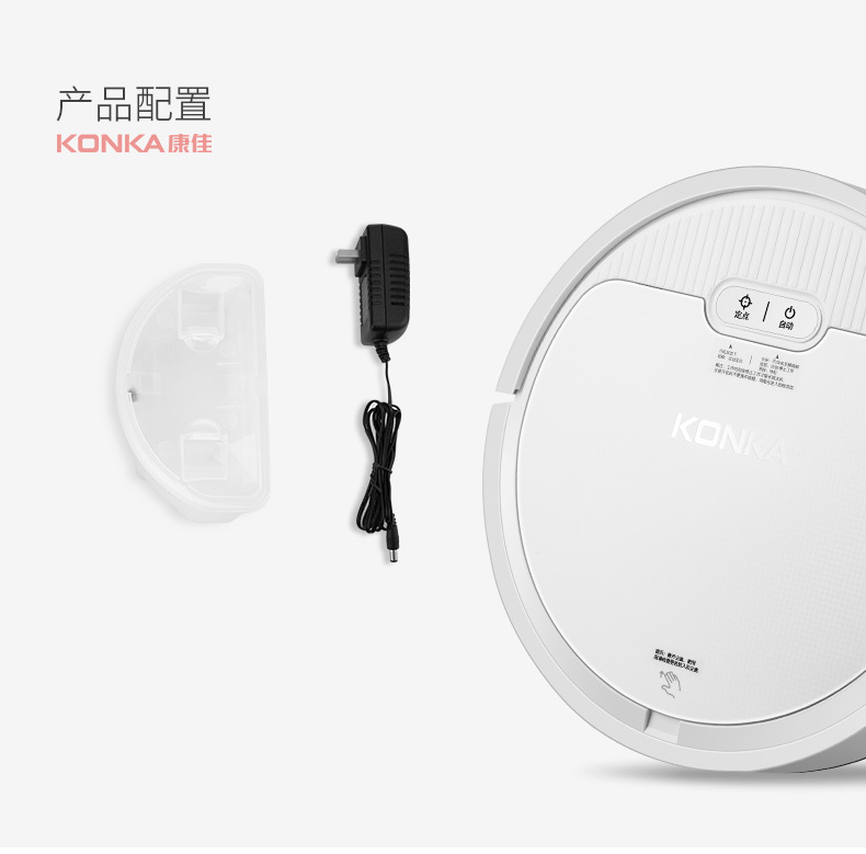 产品类型:扫地机器人;虚拟墙类型:硬件虚拟墙;防撞类型:机械撞板;电池类型:锂电池;特色功能:自动清扫模式,延边清扫功能;清洁类型:滚刷吸口互换;电池节数:4节以下;机身高度:8-9cm;电池容量:2500-2999mAH;适用面积:120平以上;水箱容量:250毫升以上;规划技术:随机式;拖地/水箱类型:无水箱(普通抹布);电机类型:普通电机;续航时间:61-120分钟;清扫路线:随机式;机身高度(cm):8.5cm;电池节数(节):1节;充电时间:约6H;充电类型:手动充电;噪音(db):60db;续航时间(分钟):90分钟;品牌:KONKA康佳;产品型号:KC-V5;产品尺寸(mm):310*310*85;额定功率(W):11.2W;额定电压(V):220V;产品净重(kg):1.74kg;包装清单:主机,说明书,电源;