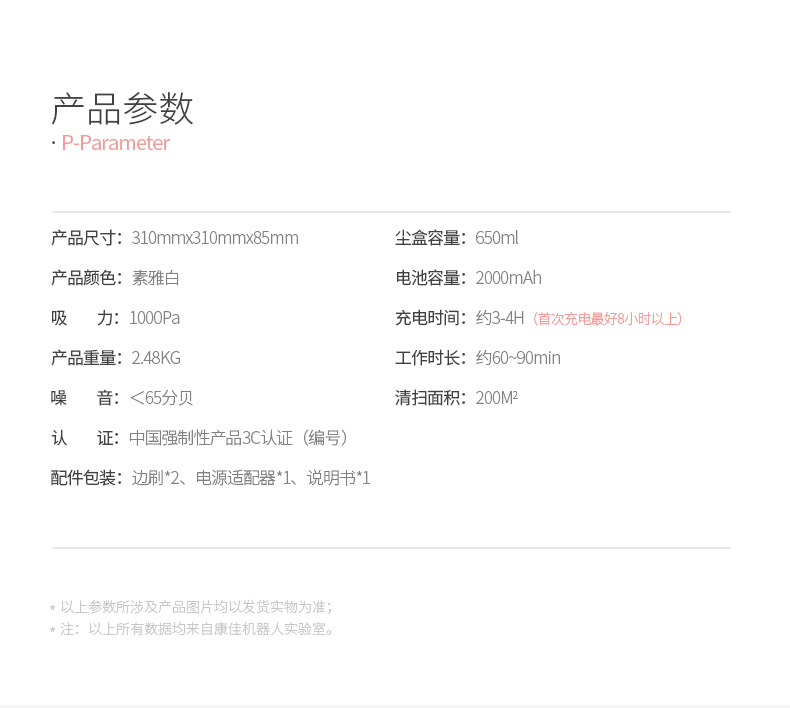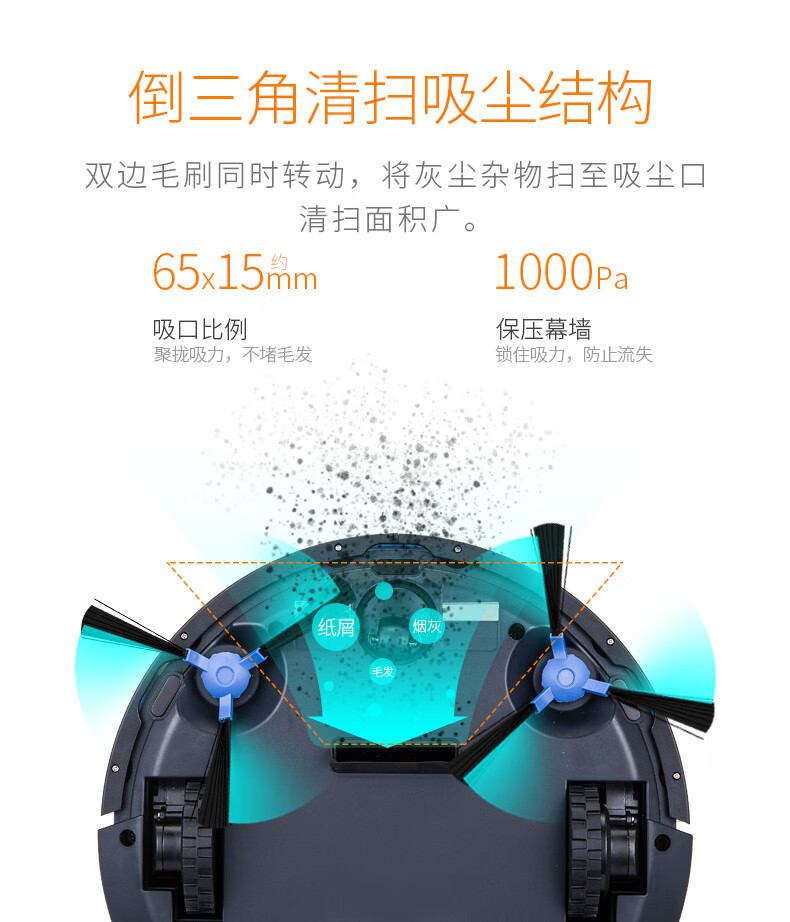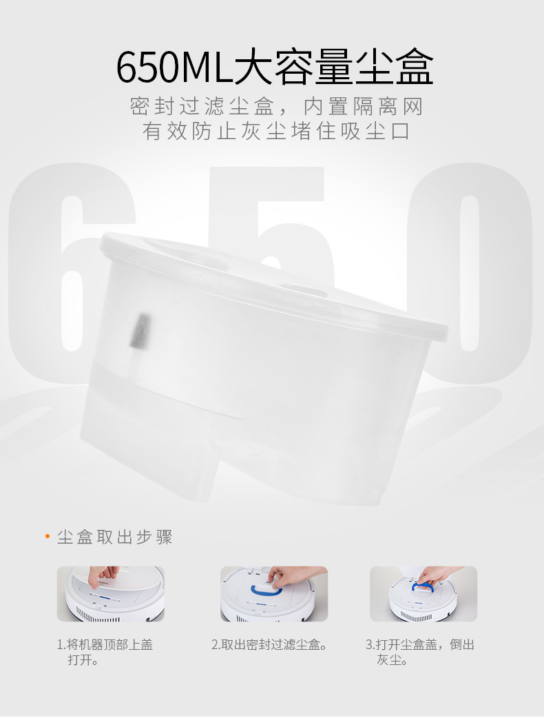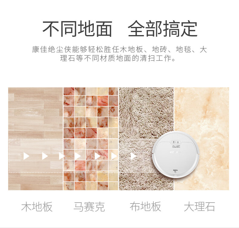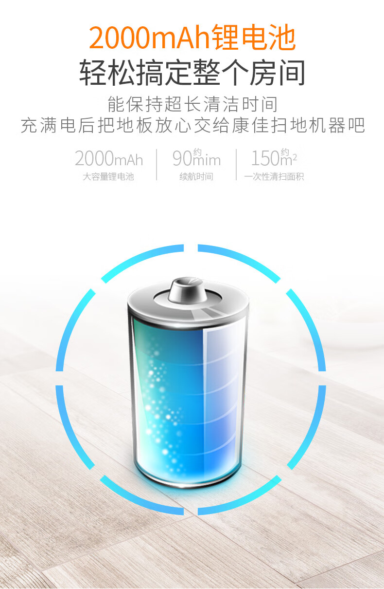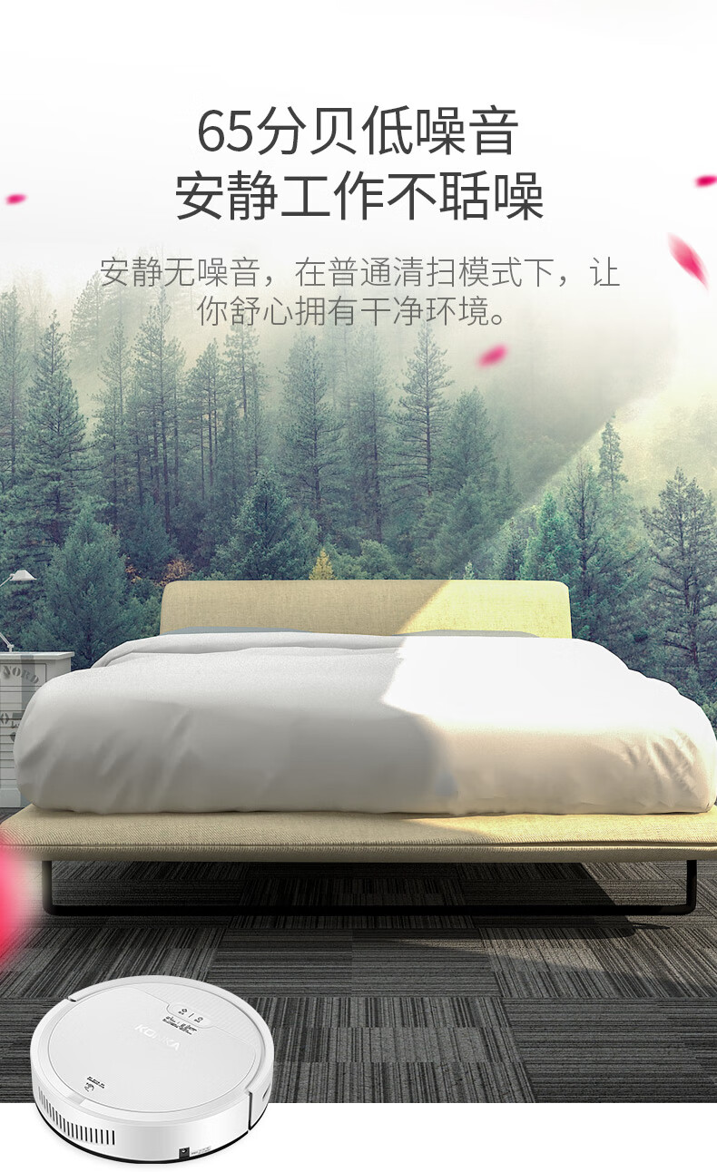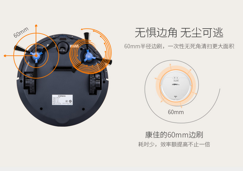 产品类型:扫地机器人;虚拟墙类型:硬件虚拟墙;防撞类型:机械撞板;电池类型:锂电池;特色功能:自动清扫模式,延边清扫功能;清洁类型:滚刷吸口互换;电池节数:4节以下;机身高度:8-9cm;电池容量:2500-2999mAH;适用面积:120平以上;水箱容量:250毫升以上;规划技术:随机式;拖地/水箱类型:无水箱(普通抹布);电机类型:普通电机;续航时间:61-120分钟;清扫路线:随机式;机身高度(cm):8.5cm;电池节数(节):1节;充电时间:约6H;充电类型:手动充电;噪音(db):60db;续航时间(分钟):90分钟;品牌:KONKA康佳;产品型号:KC-V5;产品尺寸(mm):310*310*85;额定功率(W):11.2W;额定电压(V):220V;产品净重(kg):1.74kg;包装清单:主机,说明书,电源;