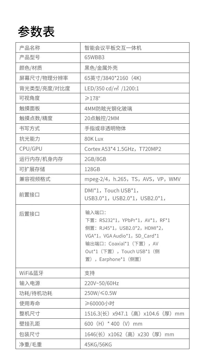 能效等级:二级能效;品牌类型:国产品牌;电视类型:商业显示,4K超清,大屏;分辨率:4k超高清(3840×2160);选购指数:10.0-8.0;HDR显示:不支持;支持格式(高清):1080p/1080i/720p;屏幕尺寸:65英寸;背光方式 背光源是位于液晶显电视背后的一种光源,主要分为侧入式和直下式; 侧入式背光源指的把LED背光放置在屏幕的侧面,通过导光板点亮屏幕。一般侧入式背光的电视更轻薄。 直下式背光源是把LED做成密集的点阵,放置在屏幕的背后,直接照射屏幕。一般色域更好,图像效果更自然,对漏光控制更好,但是机身稍厚。 在一般的电视上,两种背光方式在感官上并没有太大区别,无需作为选购的主要标准。:其他;屏幕分辨率:超高清4K;上市时间:2019-06;产品颜色:黑色;产品类型:大屏电视;4K超清电视;触摸屏电视;LED电视;能效等级:二级能效;认证型号 认证型号:3C证书上的产品型号。:65WBA2;产品品牌:创维(Skyworth);产品型号:65WBA2;USB2.0接口:4;光纤音频输出:支持;USB3.0接口:1;HDMI1.4接口:无;HDMI2.0接口:3;HDMI1.3接口:无;单屏重量(kg):45;外包装尺寸(宽*高*厚)mm:1646(长)x1062(高)x230(厚)mm;单屏尺寸(宽*高*厚)mm:1516.3(长)x947.1(高)x104.6(厚)mm;含底座重量(kg):56;含外包装重量(kg):56;含底座尺寸(宽*高*厚)mm:1516.3(长)x947.1(高)x104.6(厚)mm;机身厚薄:薄;安装孔距:600*400;边框材质:金属;边框宽窄:窄;CPU核数:四核心;运行内存:2GB;CPU 电视智能系统的中央处理器,是电视运行速度的重要保证。:Cortex A53*4 1.5GHz;智能电视 智能电视内置了智能操作系统(一般为安卓系统),可以连接互联网,通过系统内置的视频、音乐、游戏等软件提供丰富的内容,也可下载海量应用扩展更多的功能。新一代的智能电视已经发展到人工智能,可以语音操控、人机互动,让电视成为家庭的多媒体控制中心。:是;存储内存:32GB;电源功率(w):250;待机功率(w):≤0.5;工作电压(v):220v;包装清单:1521-XD217500-01 XD2175挂架竖条*1 1521-