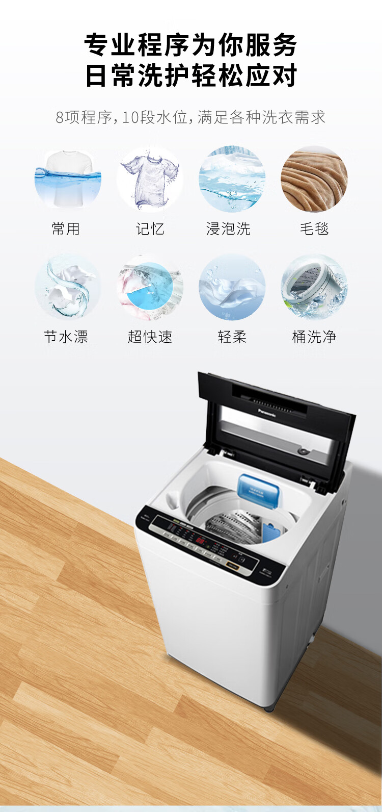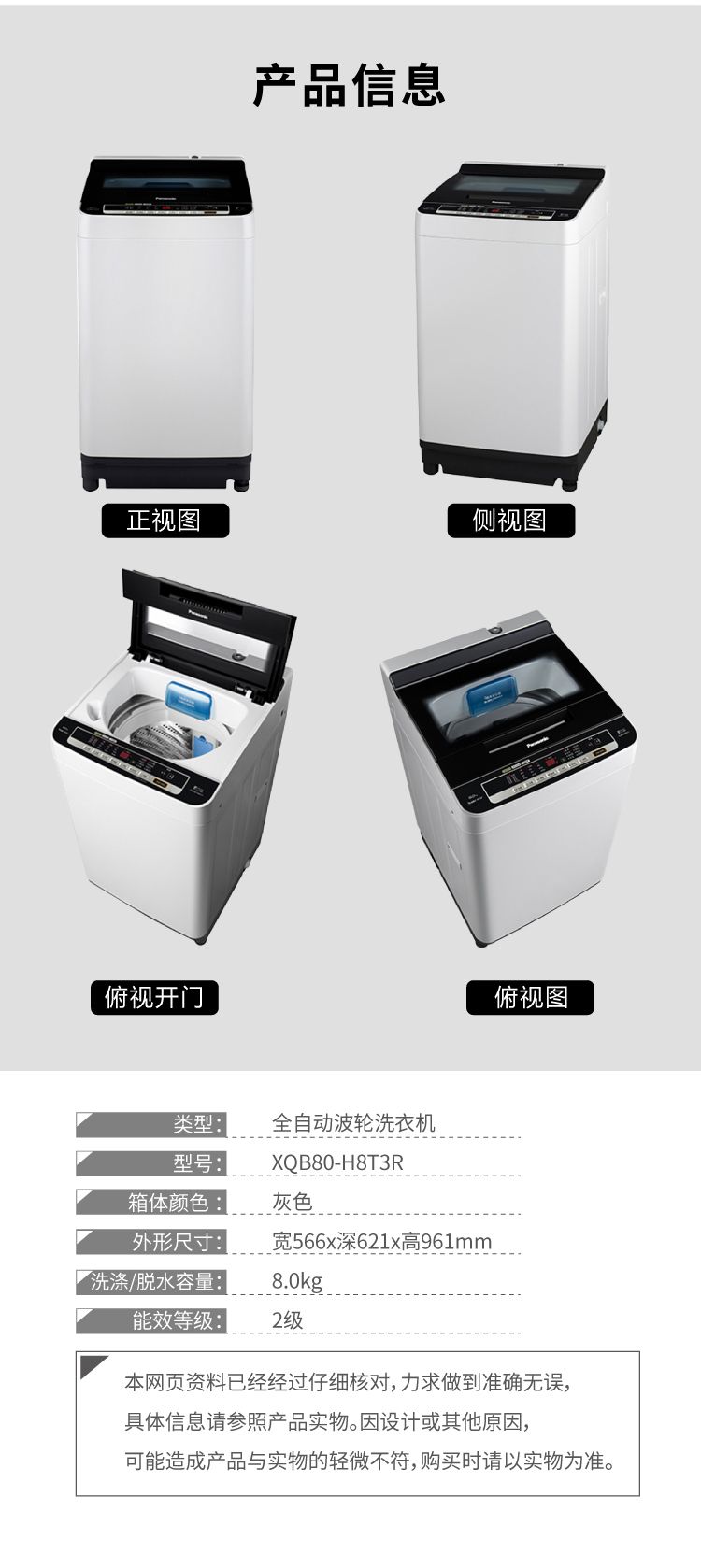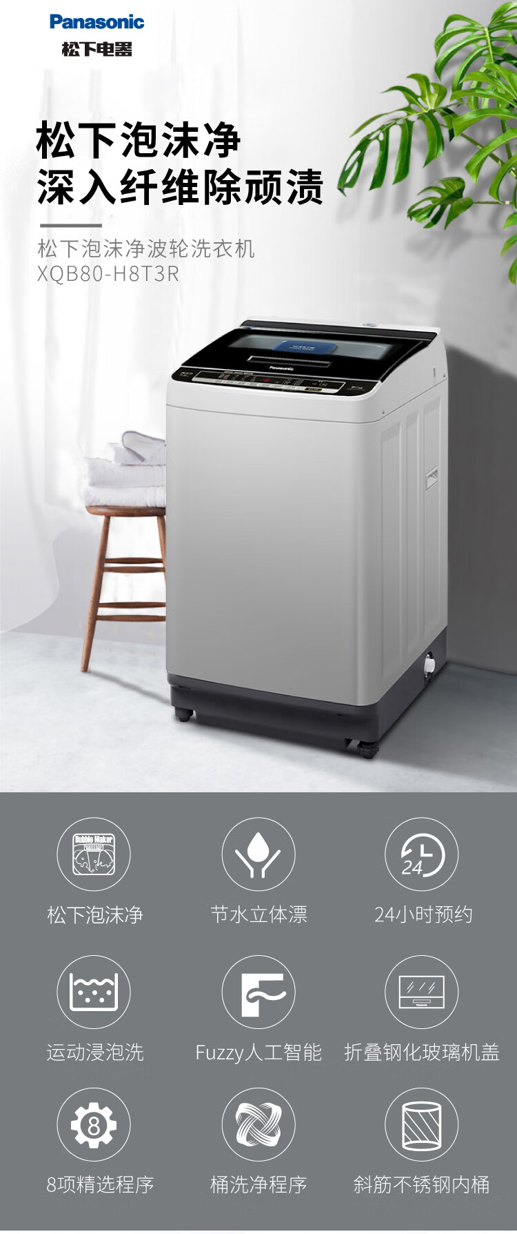 产品类型:波轮;能效等级:二级能效;特色推荐:大容量洗衣机;宽度:60cm以上;颜色:灰色;排水类型:下排水;产品渠道:线下同款;洗涤容量:8kg;高度:90cm以上;深度:60cm以上;用户优选:新品洗衣机;电机类型:定频;特性:松下泡沫发生技术、24小时预约;开门方式:顶开式;自动化程度 全自动:洗衣过程自动完成; 半自动:从洗涤到脱水需要人为操作。:全自动;品牌:松下(Panasonic);颜色:灰色;产品类型:波轮式;操控方式 分为电脑控制(通过电子显示屏调节)和机械控制(通过机械旋钮或按钮调节)。:电脑控制;认证型号 认证型号:CCC证书上的产品型号信息。:XQB80-H8T3R;排水方式:下排水;显示方式:LED数码屏显示;电机类型:普通电机;产品型号:XQB80-H8T3R;产品尺寸(深×宽×高)mm:621x566x961;洗衣程序:浸泡洗、毛毯、节水漂、超快速;能效等级 从1级到5级分别代表能效从高到低,能效越高越节能。:2级;包装尺寸(深x宽x高)mm:675x606x1055;洗净比 洗净比越高,洗出来的衣物越干净。:0.80;水位选择(段):10;脱水功率(W):270;产品重量(kg):38;洗涤容量(kg):8;脱水容量(kg):8;内筒材质:不锈钢;洗涤功率(W):440;预约功能:支持预约功能;包装清单:洗衣机x1、进水管x1、进水管接头x1、排水管及抱箍x1、说明书x1、保修证x1、底板×1;