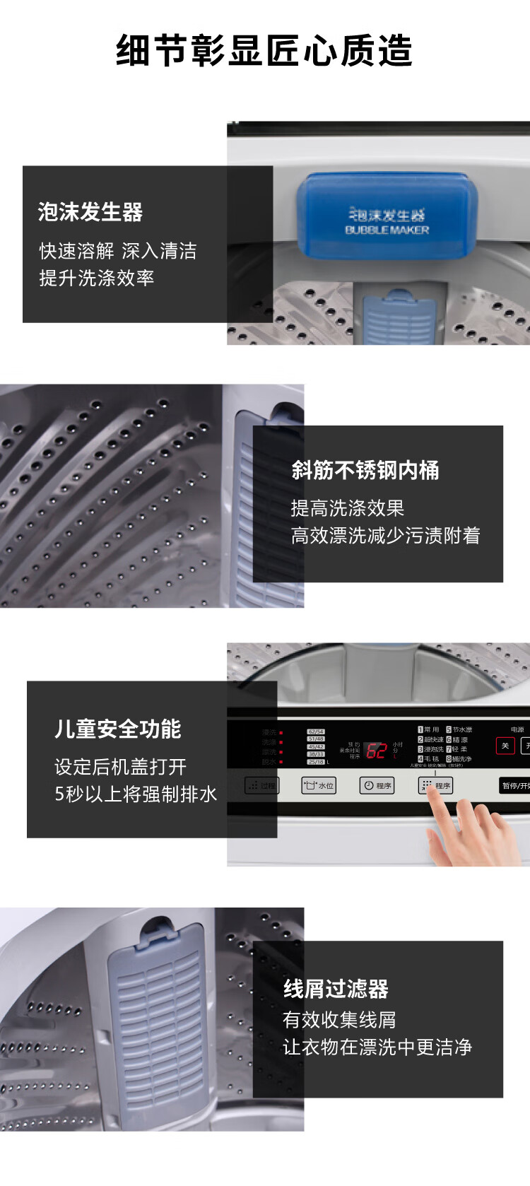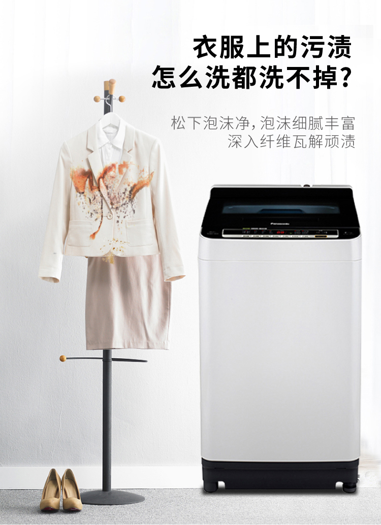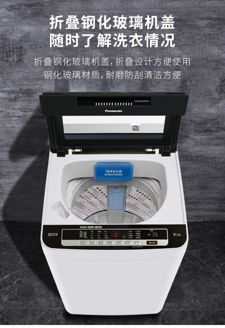 产品类型:波轮;能效等级:二级能效;特色推荐:大容量洗衣机;宽度:60cm以上;颜色:灰色;排水类型:下排水;产品渠道:线下同款;洗涤容量:8kg;高度:90cm以上;深度:60cm以上;用户优选:新品洗衣机;电机类型:定频;特性:松下泡沫发生技术、24小时预约;开门方式:顶开式;自动化程度 全自动:洗衣过程自动完成; 半自动:从洗涤到脱水需要人为操作。:全自动;品牌:松下(Panasonic);颜色:灰色;产品类型:波轮式;操控方式 分为电脑控制(通过电子显示屏调节)和机械控制(通过机械旋钮或按钮调节)。:电脑控制;认证型号 认证型号:CCC证书上的产品型号信息。:XQB80-H8T3R;排水方式:下排水;显示方式:LED数码屏显示;电机类型:普通电机;产品型号:XQB80-H8T3R;产品尺寸(深×宽×高)mm:621x566x961;洗衣程序:浸泡洗、毛毯、节水漂、超快速;能效等级 从1级到5级分别代表能效从高到低,能效越高越节能。:2级;包装尺寸(深x宽x高)mm:675x606x1055;洗净比 洗净比越高,洗出来的衣物越干净。:0.80;水位选择(段):10;脱水功率(W):270;产品重量(kg):38;洗涤容量(kg):8;脱水容量(kg):8;内筒材质:不锈钢;洗涤功率(W):440;预约功能:支持预约功能;包装清单:洗衣机x1、进水管x1、进水管接头x1、排水管及抱箍x1、说明书x1、保修证x1、底板×1;