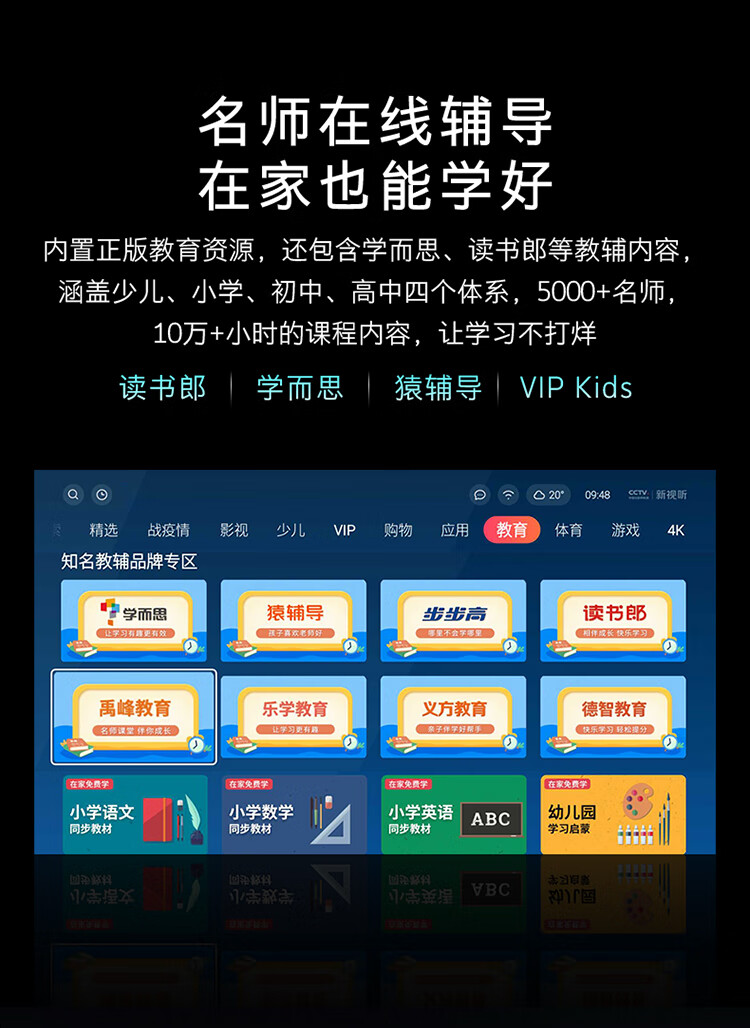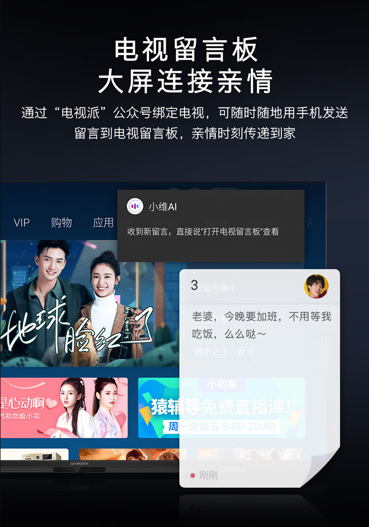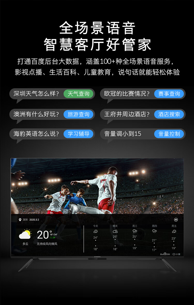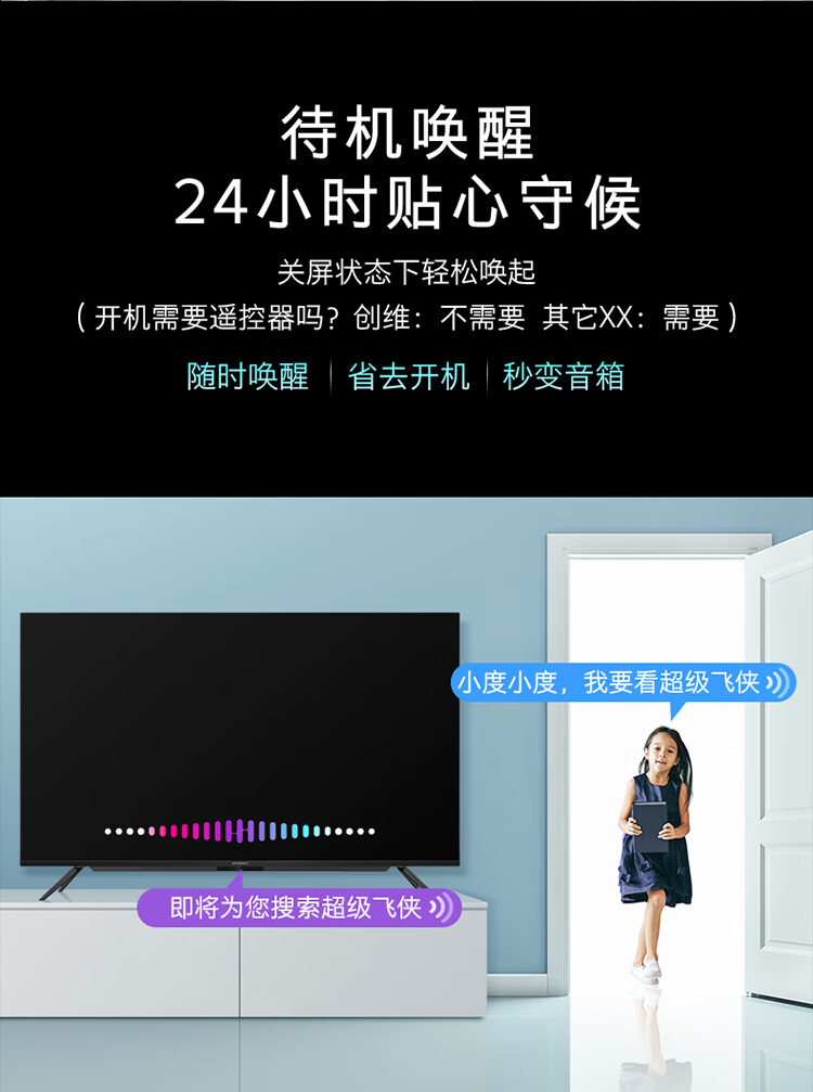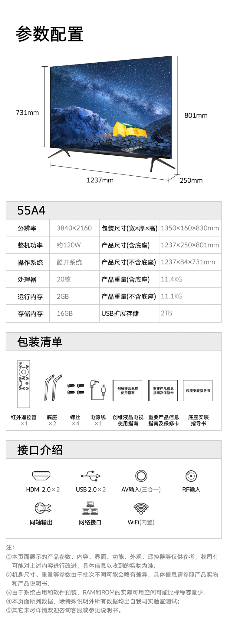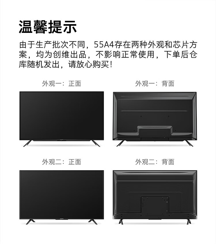 能效等级:三级能效;屏幕尺寸:55英寸;产品渠道:线上专供;选购指数:10.0-8.0;品牌类型:国产品牌;电视类型:教育电视,智慧屏,人工智能,全面屏,4K超清;用户优选:新品电视;分辨率:4k超高清(3840×2160);观看距离:2.5m-3m(46-55英寸);亮度 亮度主要是表示电视屏幕显示的明亮程度,通俗的讲就是亮度越高,屋内光线很亮也不会影响电视机的观看。:400nits以下;HDR显示:支持;支持格式(高清):2160p;屏幕尺寸:55英寸;屏幕比例:16:9;背光方式 背光源是位于液晶显电视背后的一种光源,主要分为侧入式和直下式; 侧入式背光源指的把LED背光放置在屏幕的侧面,通过导光板点亮屏幕。一般侧入式背光的电视更轻薄。 直下式背光源是把LED做成密集的点阵,放置在屏幕的背后,直接照射屏幕。一般色域更好,图像效果更自然,对漏光控制更好,但是机身稍厚。 在一般的电视上,两种背光方式在感官上并没有太大区别,无需作为选购的主要标准。:直下式;扫描方式:逐行扫描;屏幕分辨率:超高清4K;背光源 背光源是位于液晶显电视背后的一种光源,主要分为侧入式和直下式; 侧入式背光源指的把LED背光放置在屏幕的侧面,通过导光板点亮屏幕。一般侧入式背光的电视更轻薄。 直下式背光源是把LED做成密集的点阵,放置在屏幕的背后,直接照射屏幕。一般色域更好,图像效果更自然,对漏光控制更好,但是机身稍厚。 在一般的电视上,两种背光方式在感官上并没有太大区别,无需作为选购的主要标准。:LED;刷屏率:60HZ;上市时间:2020-03;产品颜色:黑色;产品类型:全面屏电视;人工智能电视;大屏电视;4K超清电视;智慧屏电视;能效等级:三级能效;认证型号 认证型号:3C证书上的产品型号。:55A4;产品品牌:创维(Skyworth);产品型号:55A4;数字RF接口:支持;USB2.0接口:2;光纤音频输出:不支持;USB3.0接口:无;HDMI2.0接口:2;单屏重量(kg):11.1;外包装尺寸(宽*高*厚)mm:1350*830*160;单屏尺寸(宽*高*厚)mm:1237*731*84;含底座重量(kg):11.4;含外包装重量(kg):15;含底座尺寸(宽*高*厚)mm:1237*801*250;机身厚薄:最薄处10.8mm;安装孔距:400*200;边框材质:黑色/塑料;