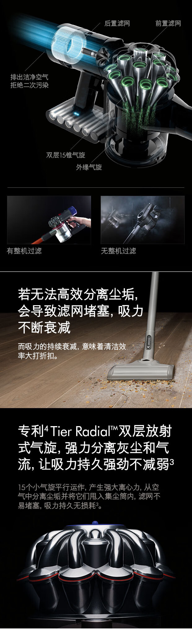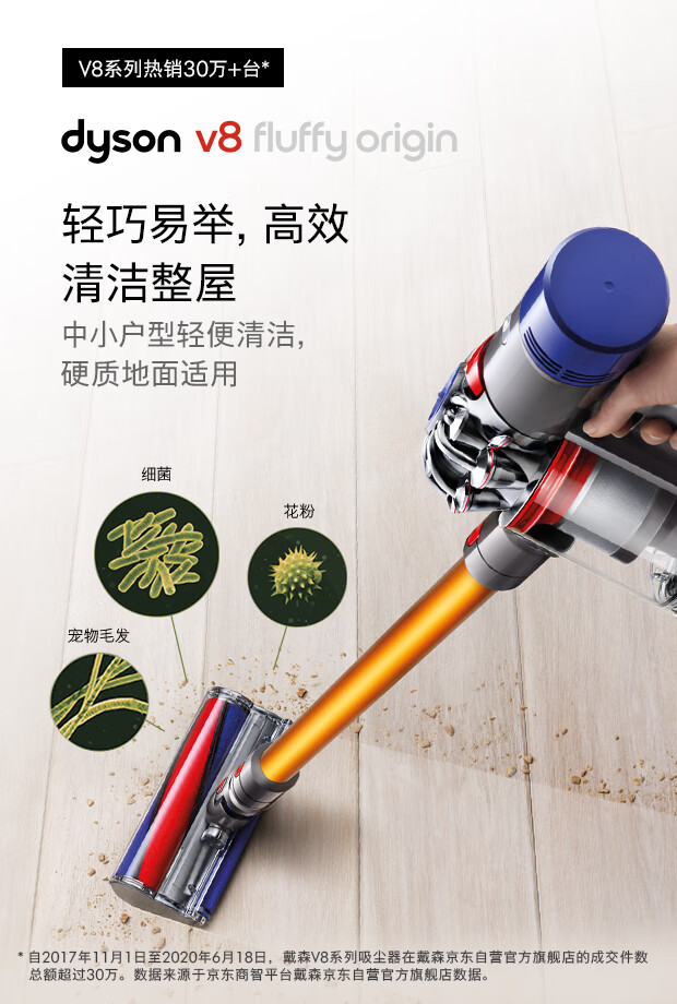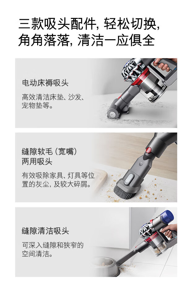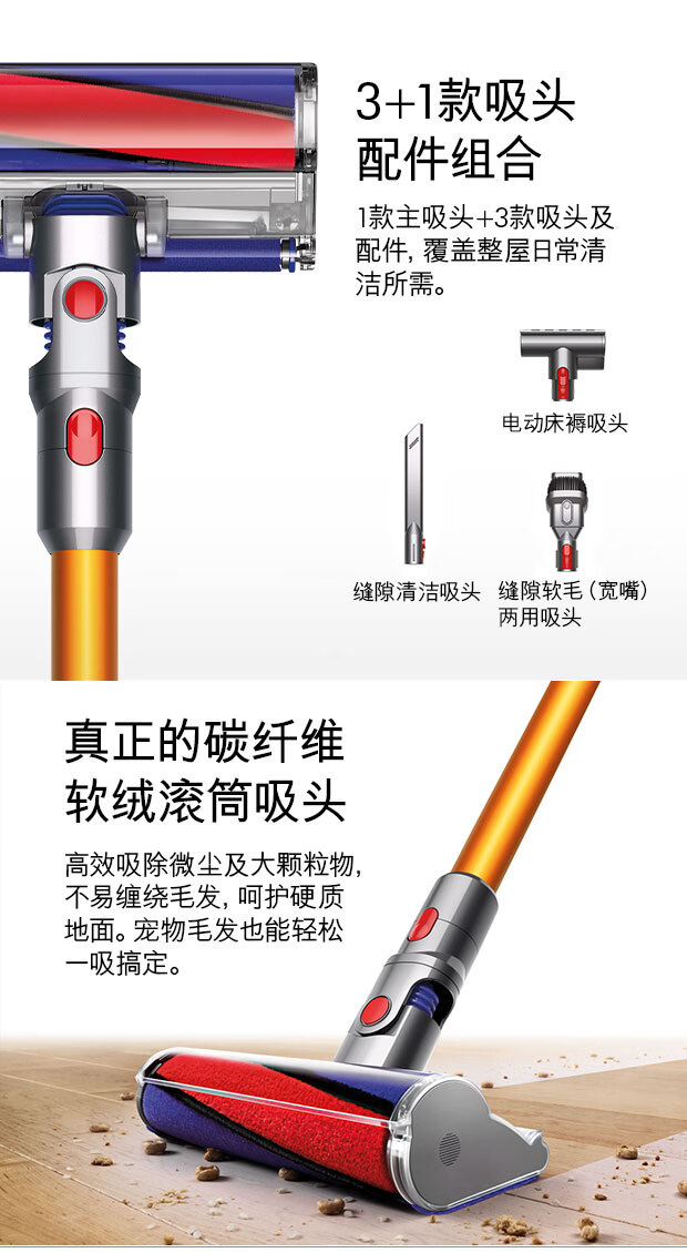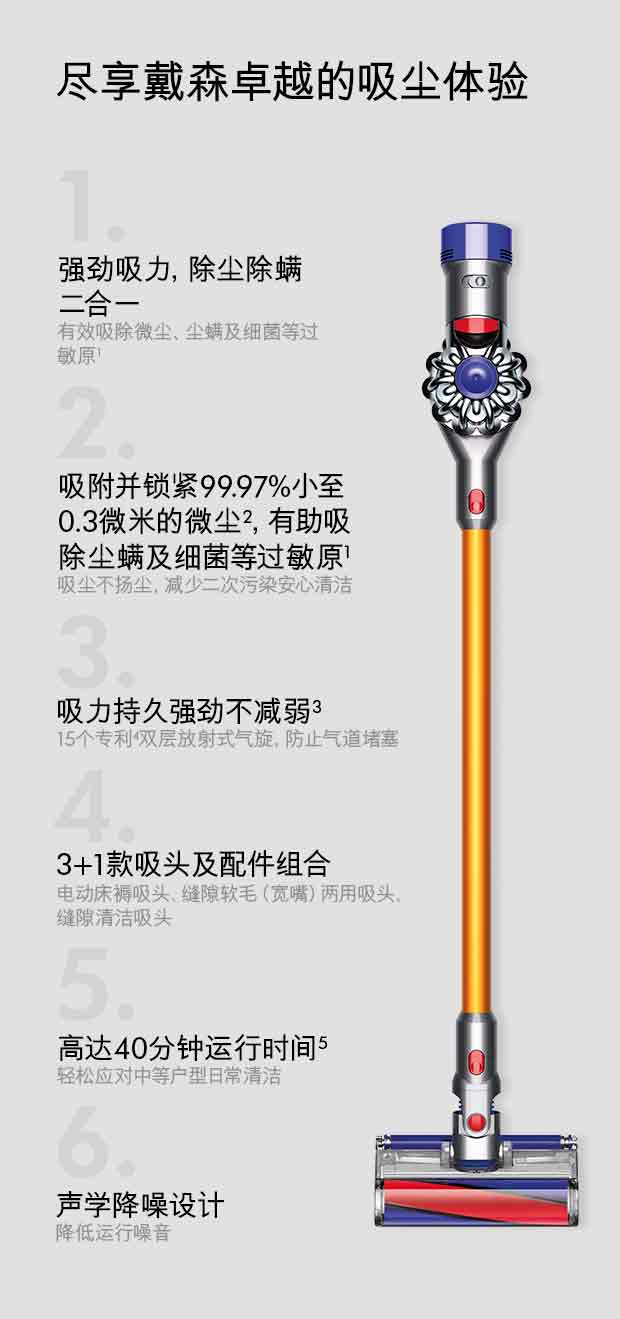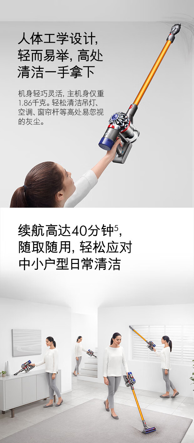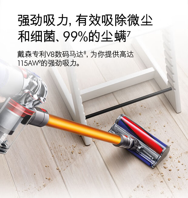 产品类型:无线吸尘器;适用环境:地毯,地板,瓷砖,缝隙;功率:500W以下;产品特色:地毯式,HEPA滤网,干式;吸头数量:4-5个;电机类型:无刷电机;适合地板材质:木地板;地毯;吸头数量(个):4个;吸头类型:软绒滚筒吸头、两用吸头、电动床褥吸头、窄缝吸头;续航时间(h):0.66h;品牌:戴森;整机质保期:2年;认证型号:V8;包装尺寸(mm):739*154*271;额定功率(W):425W;储尘类型:尘桶;额定电压(V):220V;尘桶容量(L):0.54L;包装清单:主机x1、吸尘杆x1、软绒滚筒吸头x1、两用吸头x1、电动床褥吸头x1、窄缝吸头x1、充电挂架x1、充电器x1、用户手册x1、保修卡x1、注册挂牌x1;