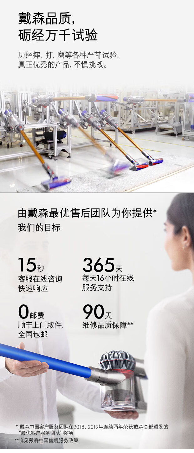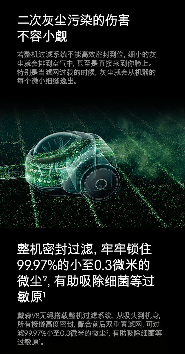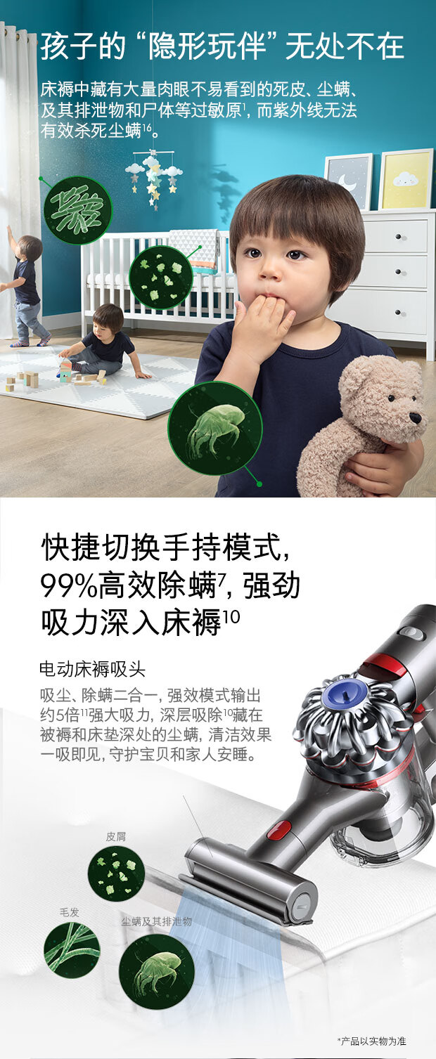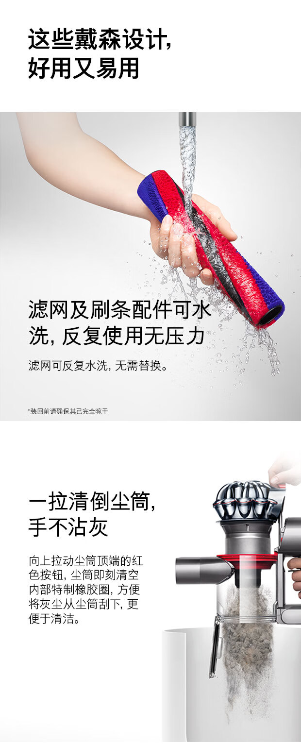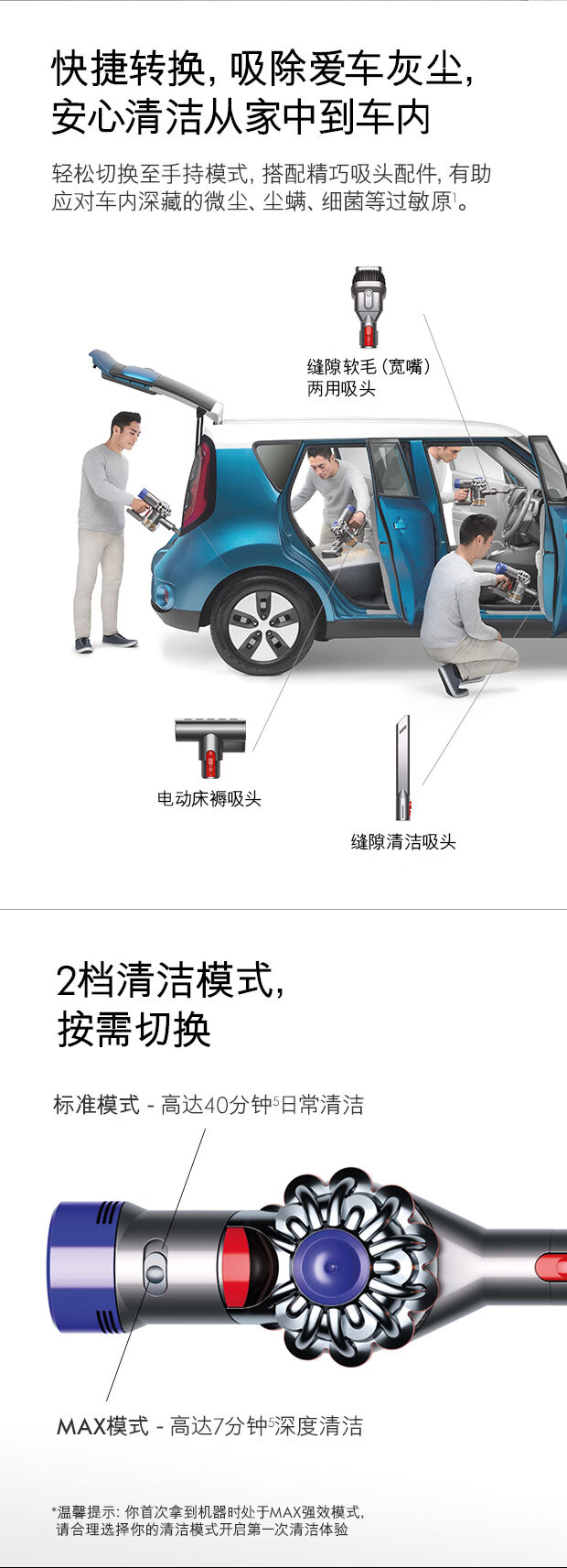产品类型:无线吸尘器;适用环境:地毯,地板,瓷砖,缝隙;功率:500W以下;产品特色:地毯式,HEPA滤网,干式;吸头数量:4-5个;电机类型:无刷电机;适合地板材质:木地板;地毯;吸头数量(个):4个;吸头类型:软绒滚筒吸头、两用吸头、电动床褥吸头、窄缝吸头;续航时间(h):0.66h;品牌:戴森;整机质保期:2年;认证型号:V8;包装尺寸(mm):739*154*271;额定功率(W):425W;储尘类型:尘桶;额定电压(V):220V;尘桶容量(L):0.54L;包装清单:主机x1、吸尘杆x1、软绒滚筒吸头x1、两用吸头x1、电动床褥吸头x1、窄缝吸头x1、充电挂架x1、充电器x1、用户手册x1、保修卡x1、注册挂牌x1;