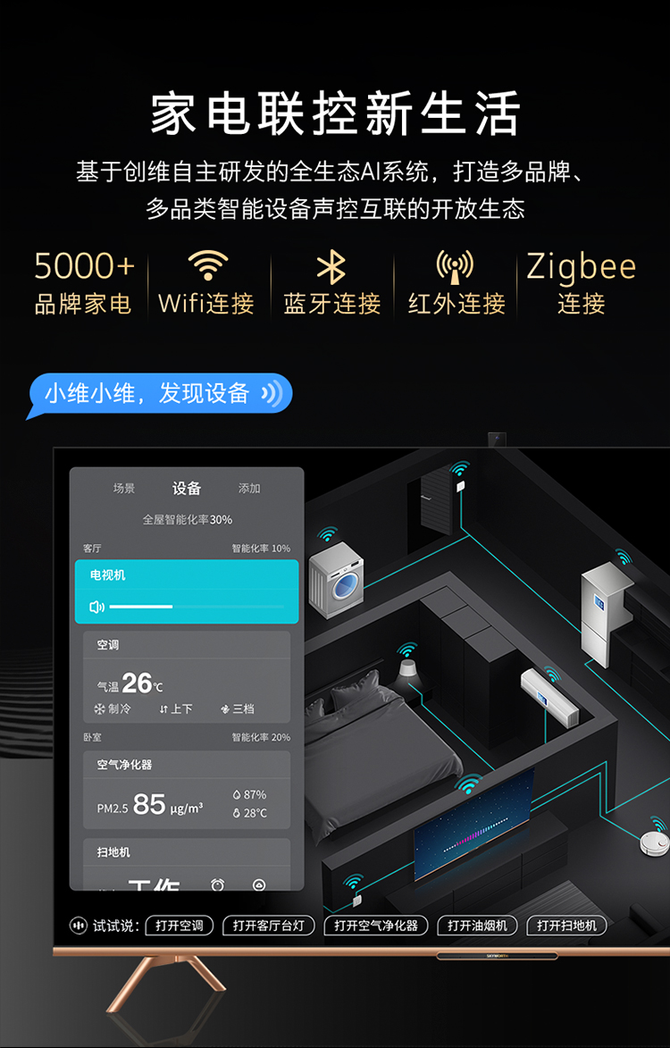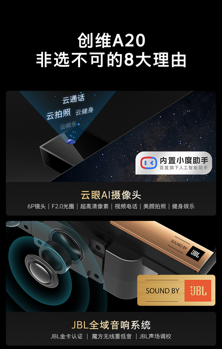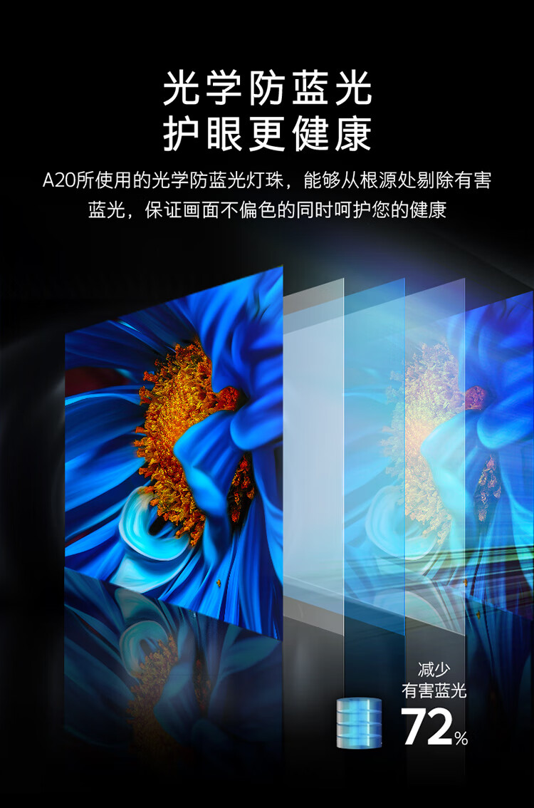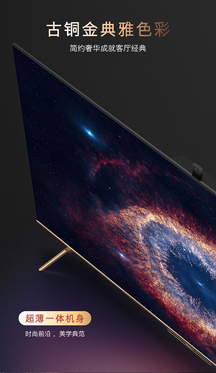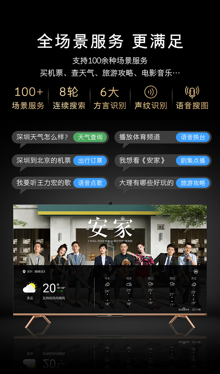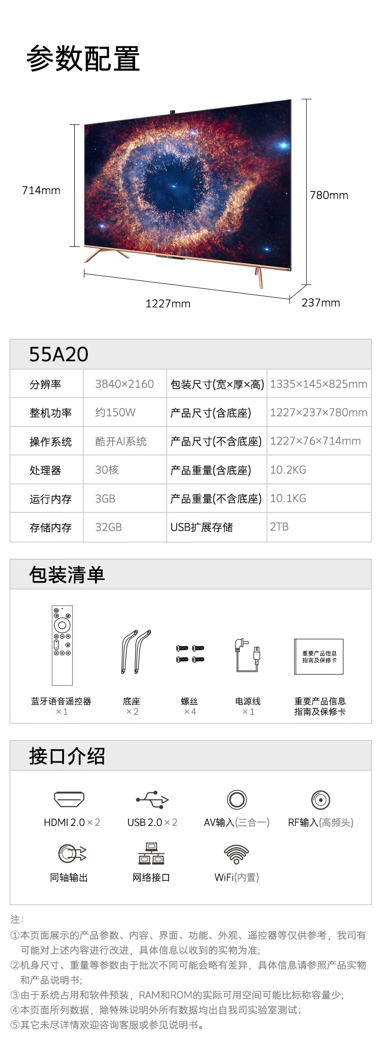 能效等级:三级能效;屏幕尺寸:55英寸;产品渠道:线上专供;选购指数:10.0-8.0;品牌类型:国产品牌;电视类型:智慧屏;用户优选:新品电视;分辨率:4k超高清(3840×2160);观看距离:2.5m-3m(46-55英寸);手势控制:支持;语音控制:支持;遥控类型:蓝牙遥控;语音输入:支持;HDR显示:支持;支持格式(高清):2160p;屏幕尺寸:55英寸;屏幕比例:16:9;背光方式 背光源是位于液晶显电视背后的一种光源,主要分为侧入式和直下式; 侧入式背光源指的把LED背光放置在屏幕的侧面,通过导光板点亮屏幕。一般侧入式背光的电视更轻薄。 直下式背光源是把LED做成密集的点阵,放置在屏幕的背后,直接照射屏幕。一般色域更好,图像效果更自然,对漏光控制更好,但是机身稍厚。 在一般的电视上,两种背光方式在感官上并没有太大区别,无需作为选购的主要标准。:直下式;屏幕分辨率:超高清4K;背光源 背光源是位于液晶显电视背后的一种光源,主要分为侧入式和直下式; 侧入式背光源指的把LED背光放置在屏幕的侧面,通过导光板点亮屏幕。一般侧入式背光的电视更轻薄。 直下式背光源是把LED做成密集的点阵,放置在屏幕的背后,直接照射屏幕。一般色域更好,图像效果更自然,对漏光控制更好,但是机身稍厚。 在一般的电视上,两种背光方式在感官上并没有太大区别,无需作为选购的主要标准。:LED;上市时间:2020-03;产品颜色:黑色;产品类型:智慧屏电视;能效等级:三级能效;认证型号 认证型号:3C证书上的产品型号。:55A20;产品品牌:创维(Skyworth);产品型号:55A20;USB2.0接口:2;USB3.0接口:无;HDMI2.1接口:无;HDMI1.4接口:无;HDMI2.0接口:2;HDMI1.3接口:无;单屏重量(kg):10.1KG;外包装尺寸(宽*高*厚)mm:1335×825×145;单屏尺寸(宽*高*厚)mm:1227*714*76;含底座重量(kg):10.2KG;含外包装重量(kg):13.5KG;含底座尺寸(宽*高*厚)mm:1227*780*237;底座材料:古铜色/塑胶;机身厚薄:最薄9.5mm;安装孔距:200*200;边框材质:黑色/塑胶 古铜色装饰条;边框宽窄:上左右:2mm 下:14mm;CPU核数:四核心;运行内存:3G;操作系统:最新酷开