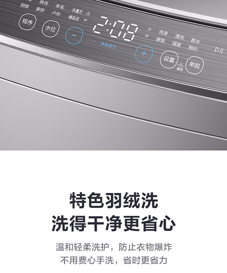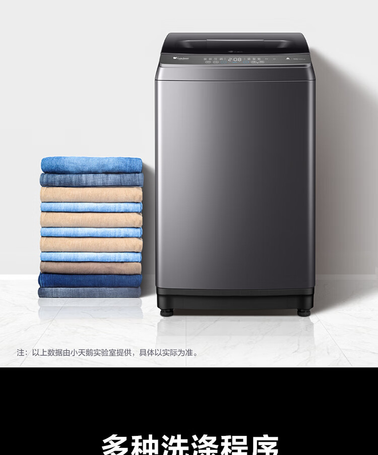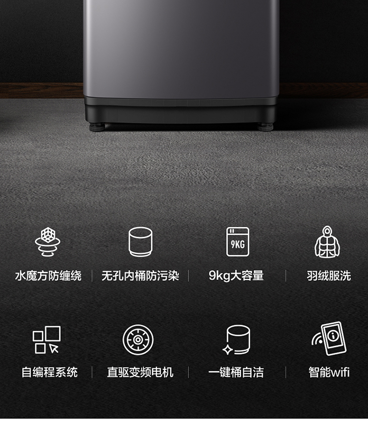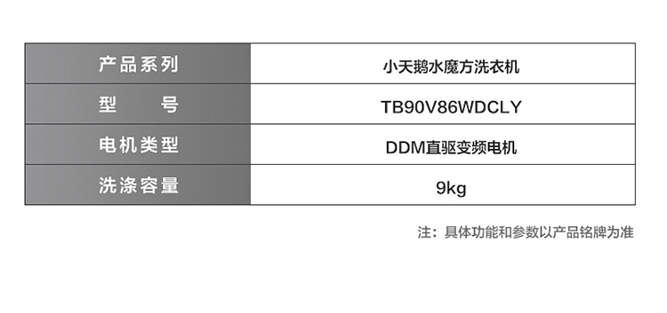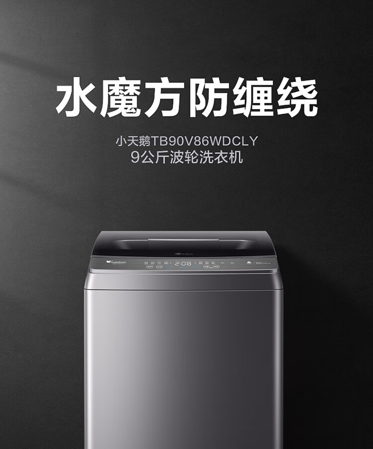 产品类型:波轮;能效等级:一级能效;特色推荐:大容量洗衣机;宽度:50.1-55cm;颜色:银色;排水类型:下排水;洗涤容量:9kg;高度:90cm以上;用户优选:新品洗衣机,高端洗衣机;电机类型:变频(节能);自动化程度 全自动:洗衣过程自动完成; 半自动:从洗涤到脱水需要人为操作。:全自动;开门方式:顶开式;品牌:小天鹅;系列:水魔方;产品类型:波轮式;颜色:银色;操控方式 分为电脑控制(通过电子显示屏调节)和机械控制(通过机械旋钮或按钮调节)。:电脑控制;认证型号 认证型号:CCC证书上的产品型号信息。:TB90V86WDCLY;排水方式:下排水;显示方式:LED数码屏显示;产品型号:TB90V86WDCLY;洗涤转速:140;能效等级 从1级到5级分别代表能效从高到低,能效越高越节能。:1级;包装尺寸(深x宽x高)mm:644*639*1045;洗净比 洗净比越高,洗出来的衣物越干净。:0.9;箱体材质:彩钢;洗涤容量(kg):9;脱水容量(kg):9;标准程序耗水量:120L/cycle;标准程序耗电量:0.094kW·h/cycle;内筒材质:不锈钢;产品尺寸(深×宽×高)mm:565*550*960;脱水转速:720;洗衣程序:8;产品重量(kg):38;防缠绕:支持防缠绕;筒自洁:支持筒自洁;预约功能:支持预约功能;脱水功能:支持脱水功能;儿童安全锁:支持儿童安全锁;包装清单:洗衣机 × 1、说明书(含保修卡) × 1、进水管 × 1;
