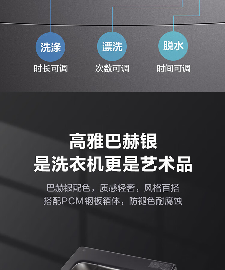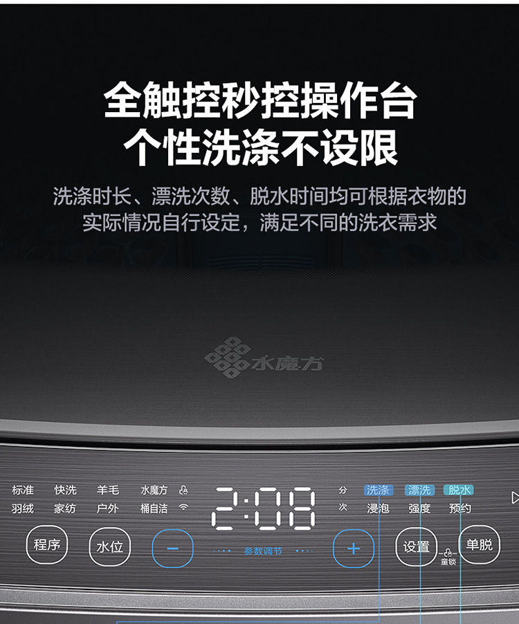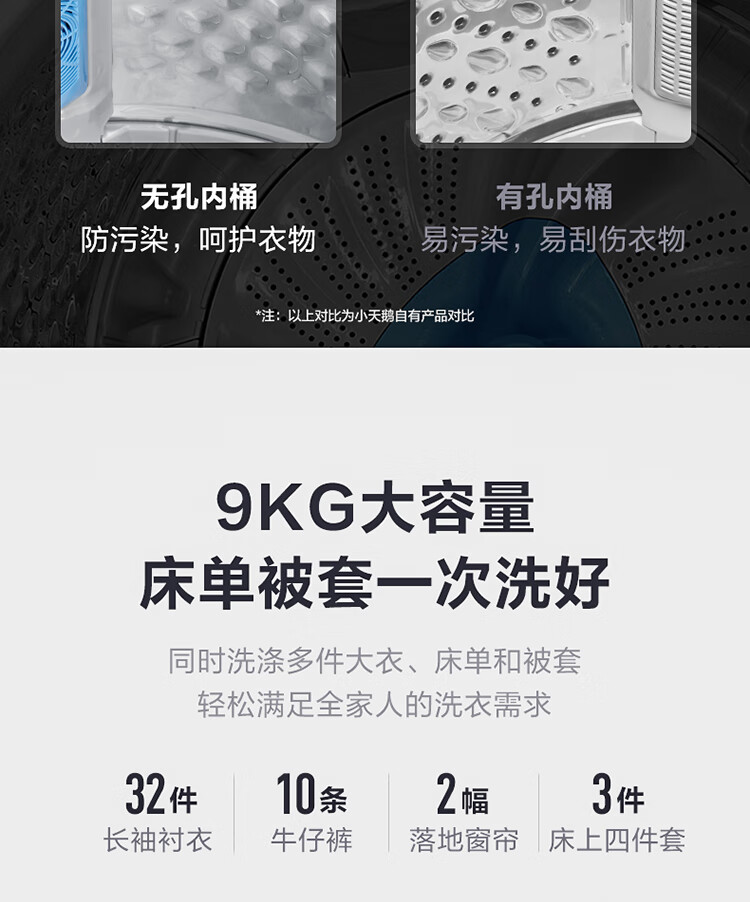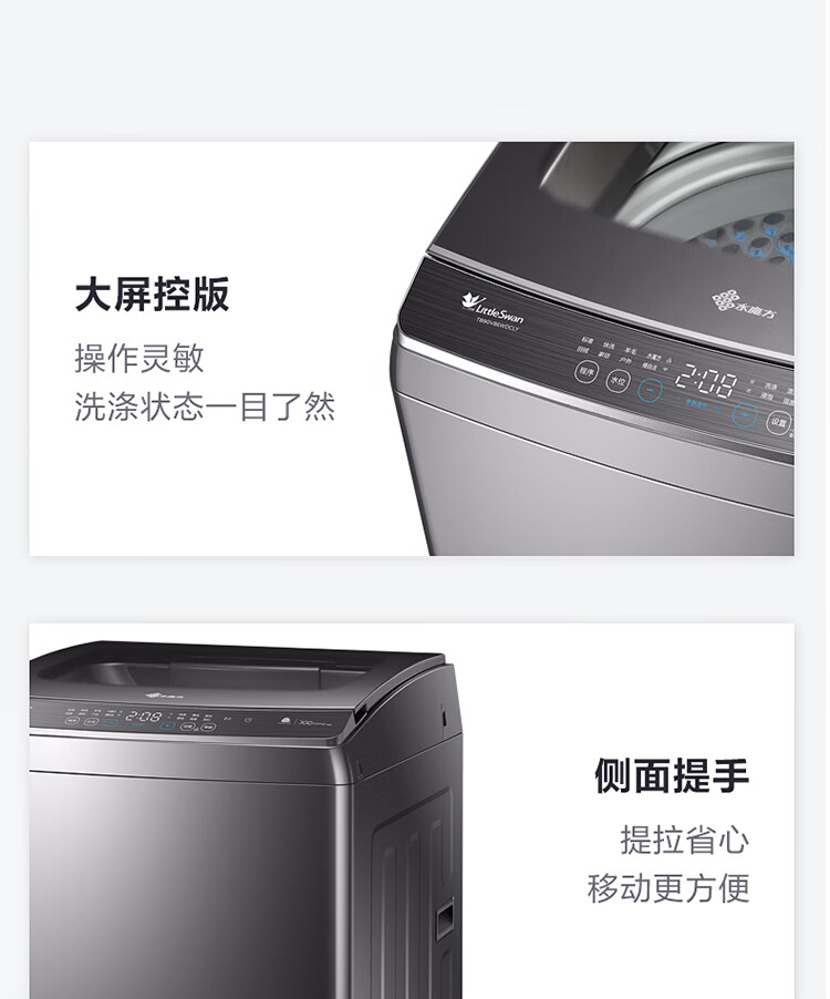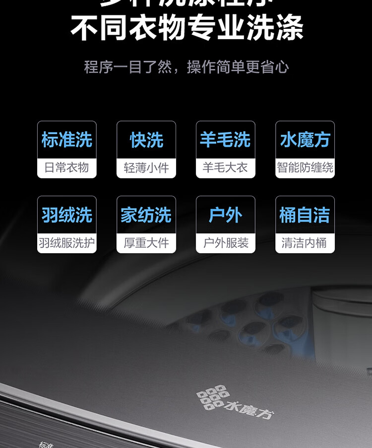 产品类型:波轮;能效等级:一级能效;特色推荐:大容量洗衣机;宽度:50.1-55cm;颜色:银色;排水类型:下排水;洗涤容量:9kg;高度:90cm以上;用户优选:新品洗衣机,高端洗衣机;电机类型:变频(节能);自动化程度 全自动:洗衣过程自动完成; 半自动:从洗涤到脱水需要人为操作。:全自动;开门方式:顶开式;品牌:小天鹅;系列:水魔方;产品类型:波轮式;颜色:银色;操控方式 分为电脑控制(通过电子显示屏调节)和机械控制(通过机械旋钮或按钮调节)。:电脑控制;认证型号 认证型号:CCC证书上的产品型号信息。:TB90V86WDCLY;排水方式:下排水;显示方式:LED数码屏显示;产品型号:TB90V86WDCLY;洗涤转速:140;能效等级 从1级到5级分别代表能效从高到低,能效越高越节能。:1级;包装尺寸(深x宽x高)mm:644*639*1045;洗净比 洗净比越高,洗出来的衣物越干净。:0.9;箱体材质:彩钢;洗涤容量(kg):9;脱水容量(kg):9;标准程序耗水量:120L/cycle;标准程序耗电量:0.094kW·h/cycle;内筒材质:不锈钢;产品尺寸(深×宽×高)mm:565*550*960;脱水转速:720;洗衣程序:8;产品重量(kg):38;防缠绕:支持防缠绕;筒自洁:支持筒自洁;预约功能:支持预约功能;脱水功能:支持脱水功能;儿童安全锁:支持儿童安全锁;包装清单:洗衣机 × 1、说明书(含保修卡) × 1、进水管 × 1;