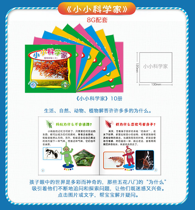 类型:点读笔;电池类型:可充电锂电;容量:8G;适用年龄:3岁以下;型号:18A;认证型号:18A蓝8G;扩展:不支持;包装清单:主机 × 1 《天才宝贝成长必备》10本 × 1 《快乐英语》10本 × 1 《小小科学家》10本 × 1 《开心童谣》10本 × 1 《双语绘本》11本 × 1 底座 × 1 USB线 × 1 说明书 × 1 三包凭证 × 1;